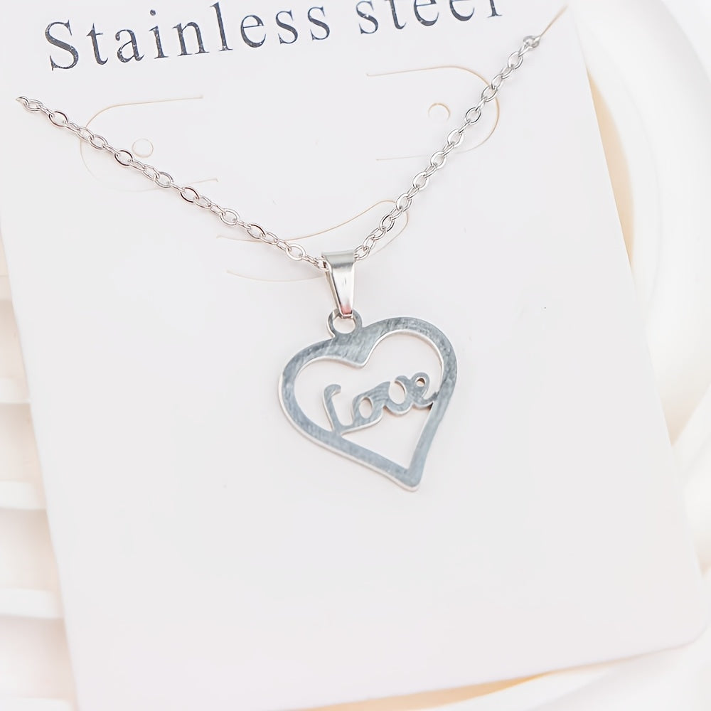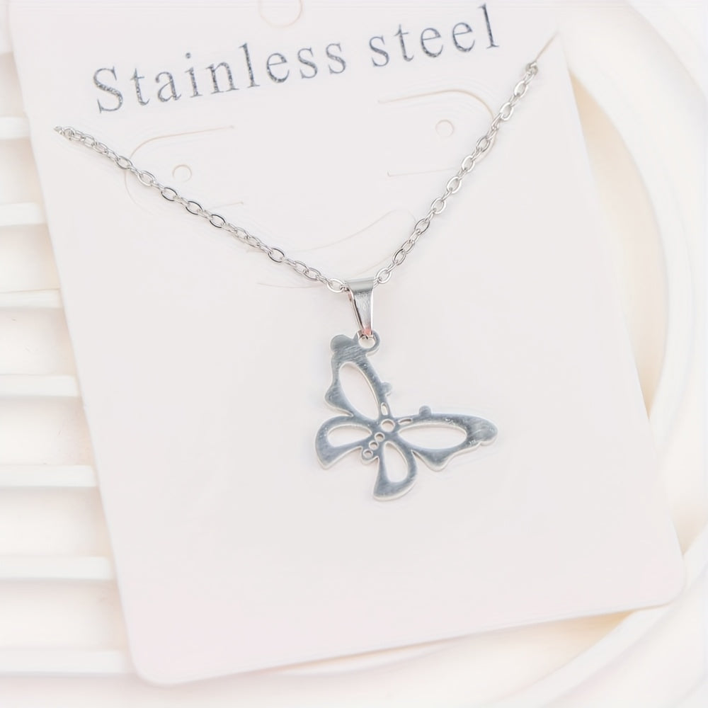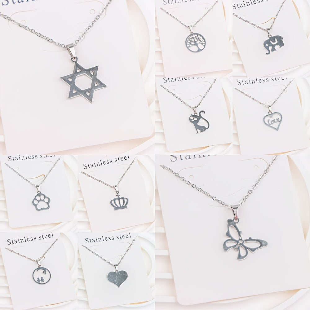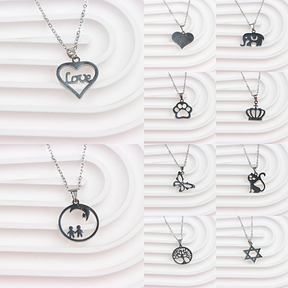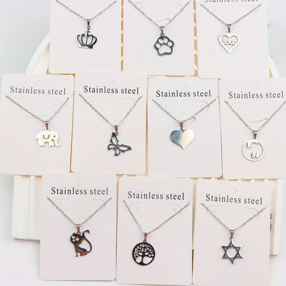 Stylish set of 10 stainless steel pendant necklaces featuring hearts, elephants, and butterfly charms. Made of 316L titanium steel, perfect for casual daily wear and ideal for a vintage Y2K look.