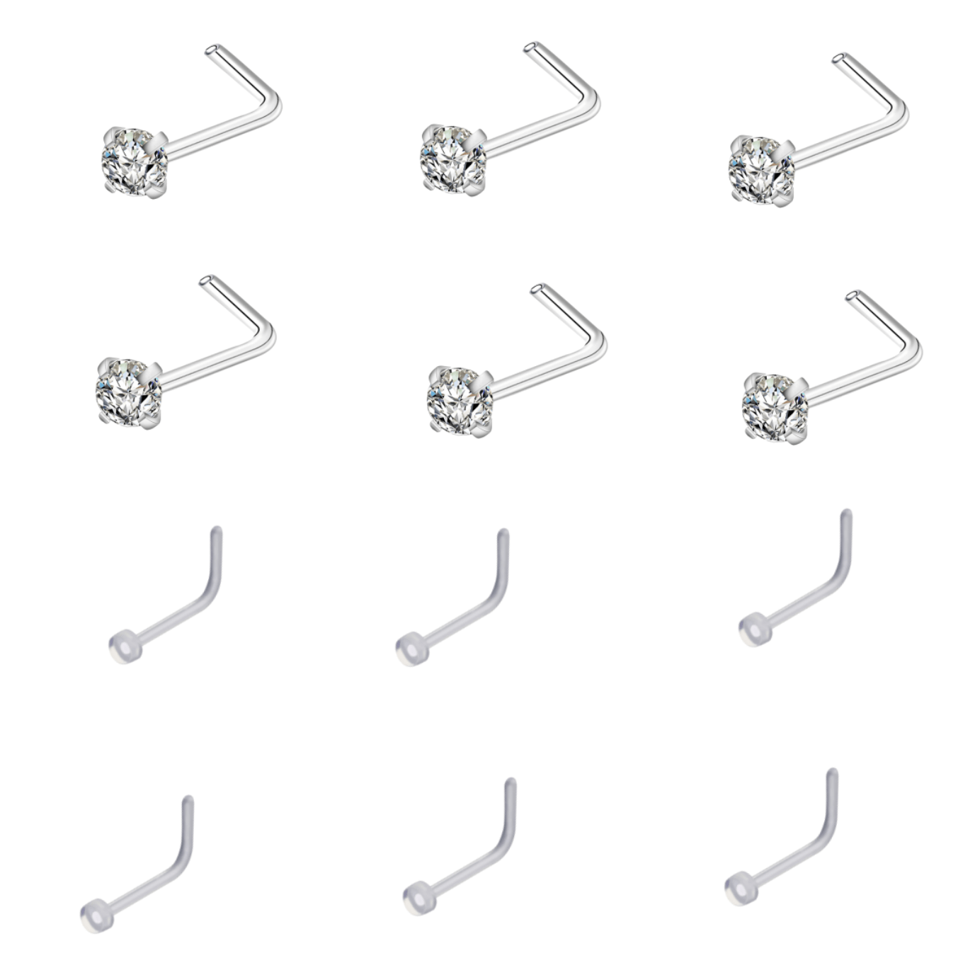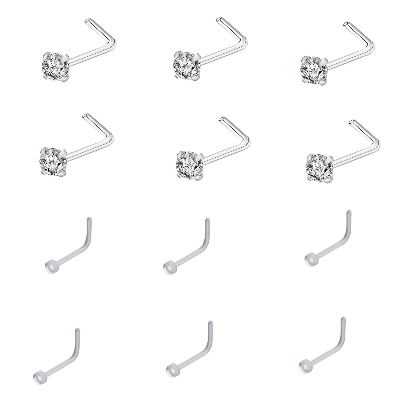 This set includes 12 nose bone studs made of pure acrylic plastic. They are practical and easy to use for body piercings.
