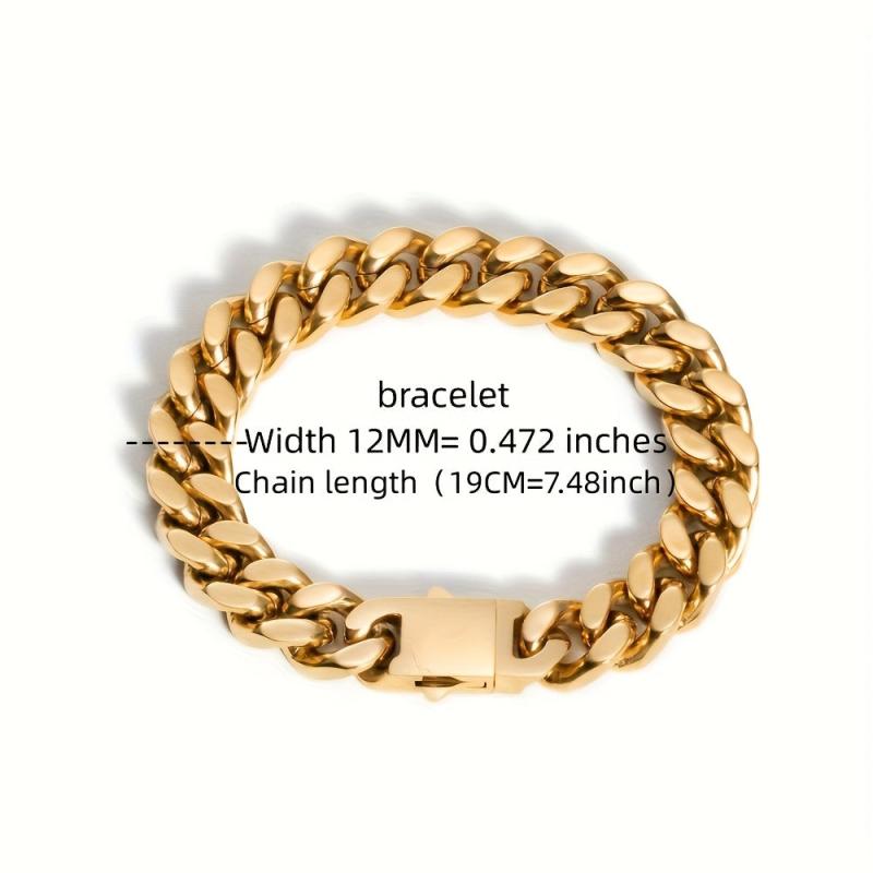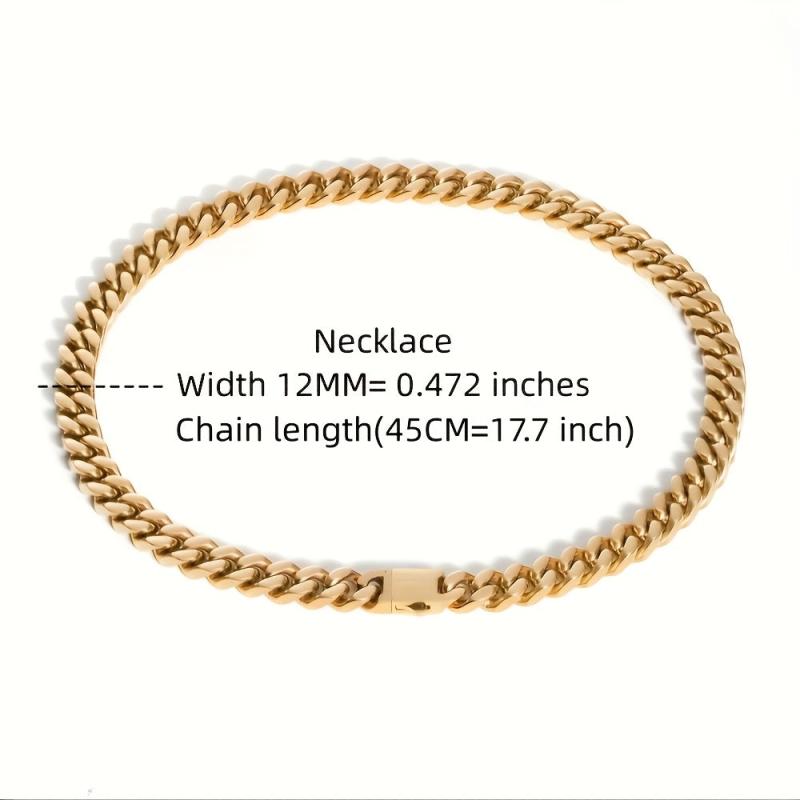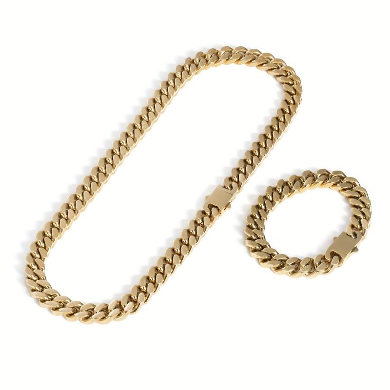 This 12mm wide Stainless Steel Cuban necklace and bracelet set features a four hand polished button design. Made of durable Stainless Steel with vacuum electroplated 18K gold finish, this hip hop rap jewelry is a stylish addition to your collection.