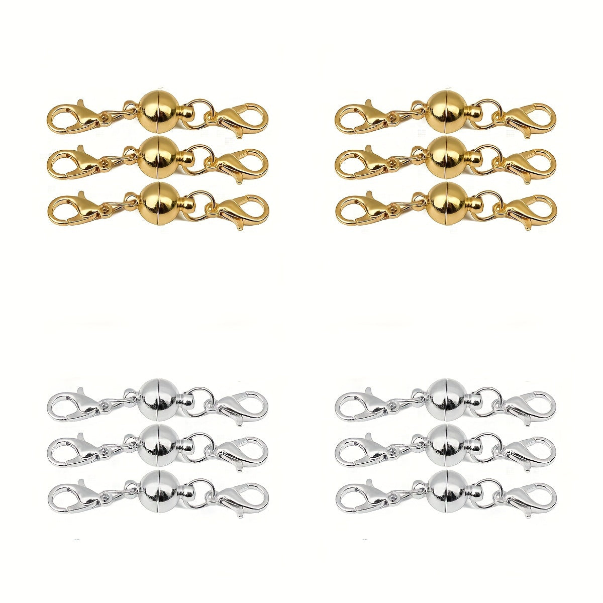 This pack includes 12 spherical magnet buckles in 6 golden and 6 silvery colors. Ideal for creating bracelets and necklaces.