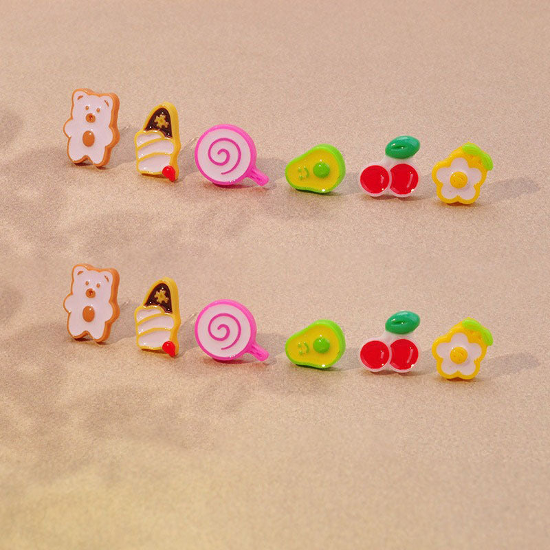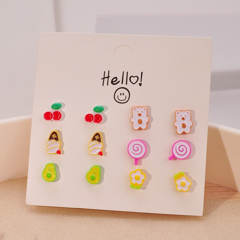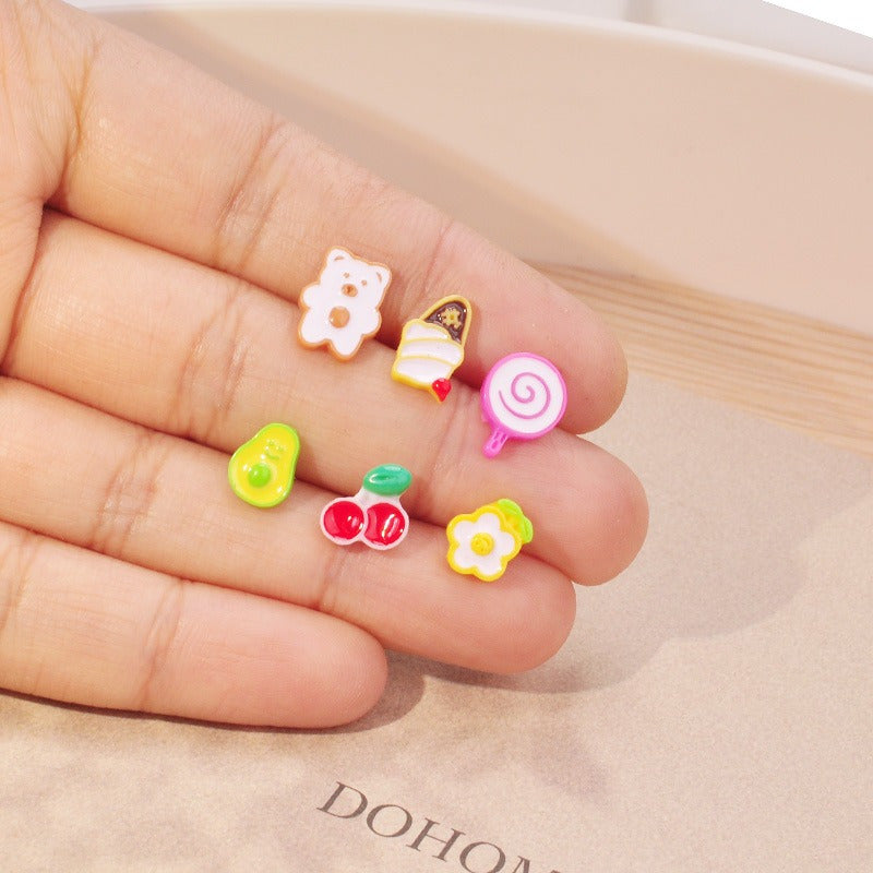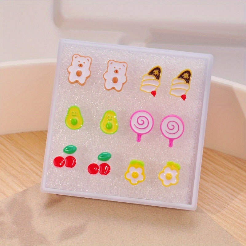 12pcs Cartoon Food & Fruit Earrings Set - Colorful Resin Studs with Box