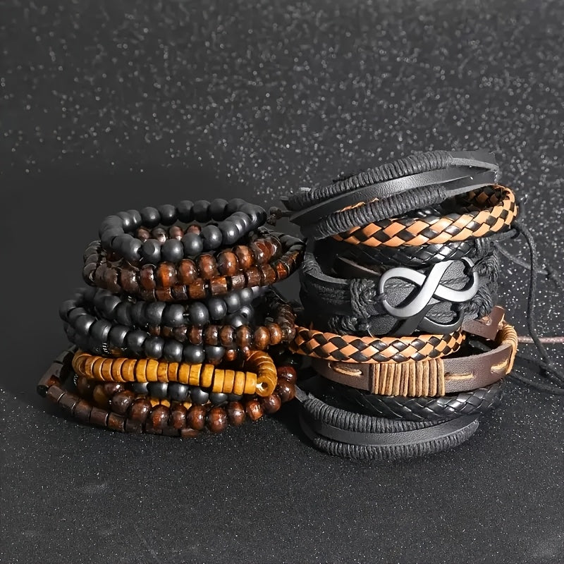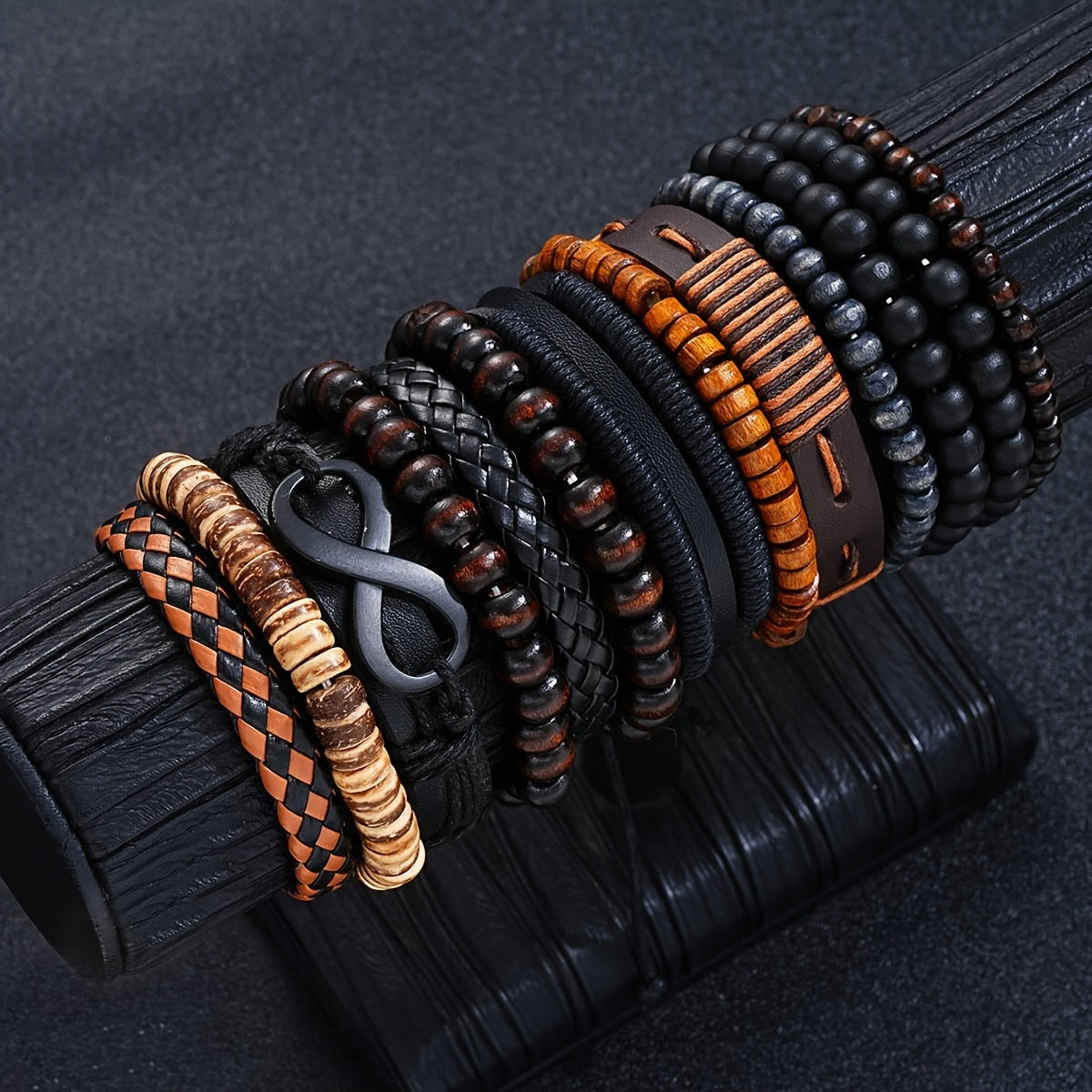This set includes 12 stylish bracelets made of synthetic fiber rope and faux leather. Perfect for casual or party wear.