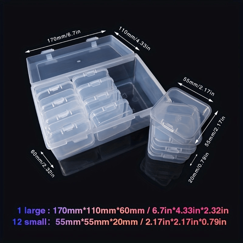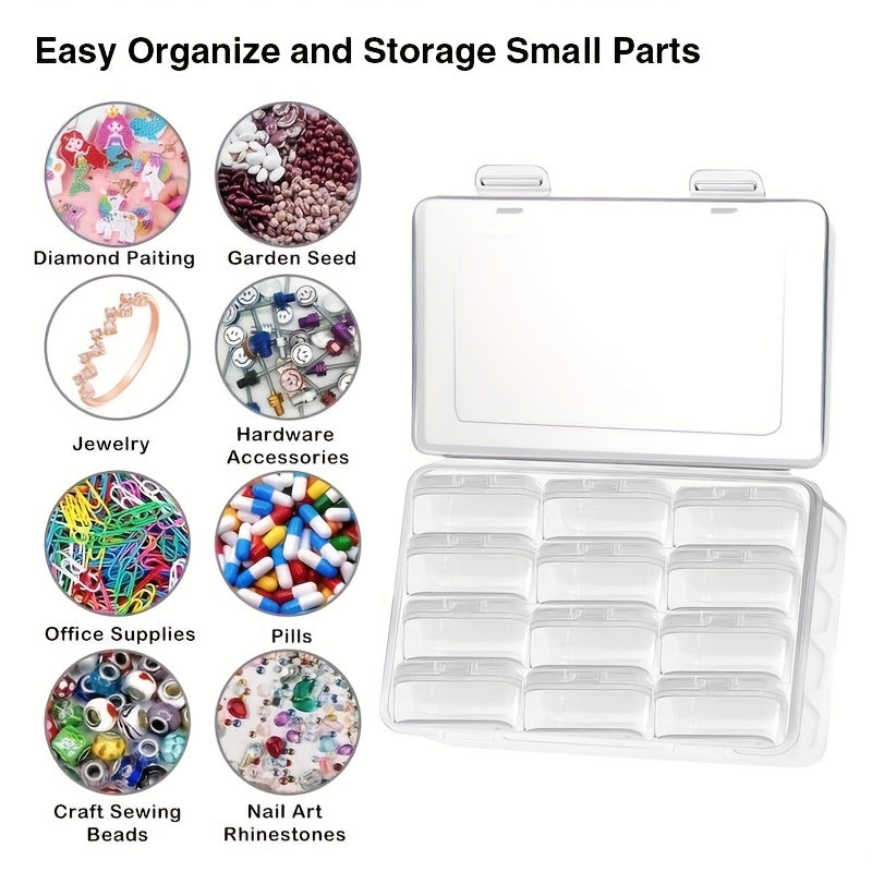 This set includes 12 small empty plastic storage boxes with hinged lids for storing small items such as beads, jewelry, hardware, DIY art and craft accessories.