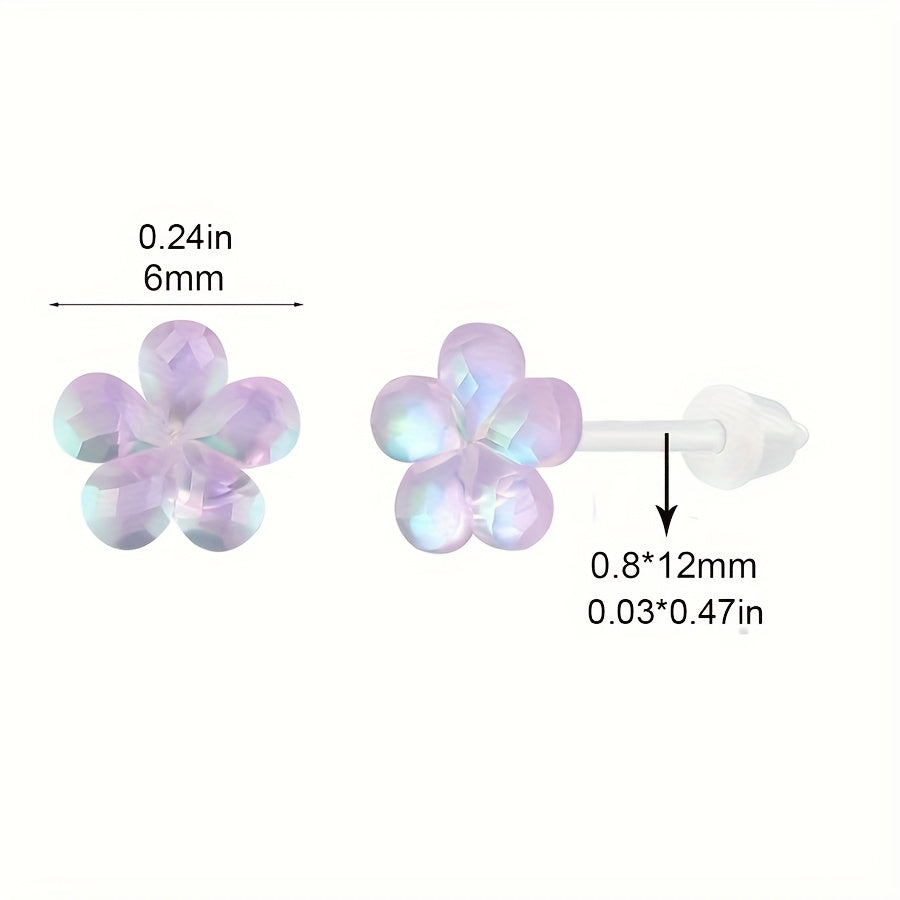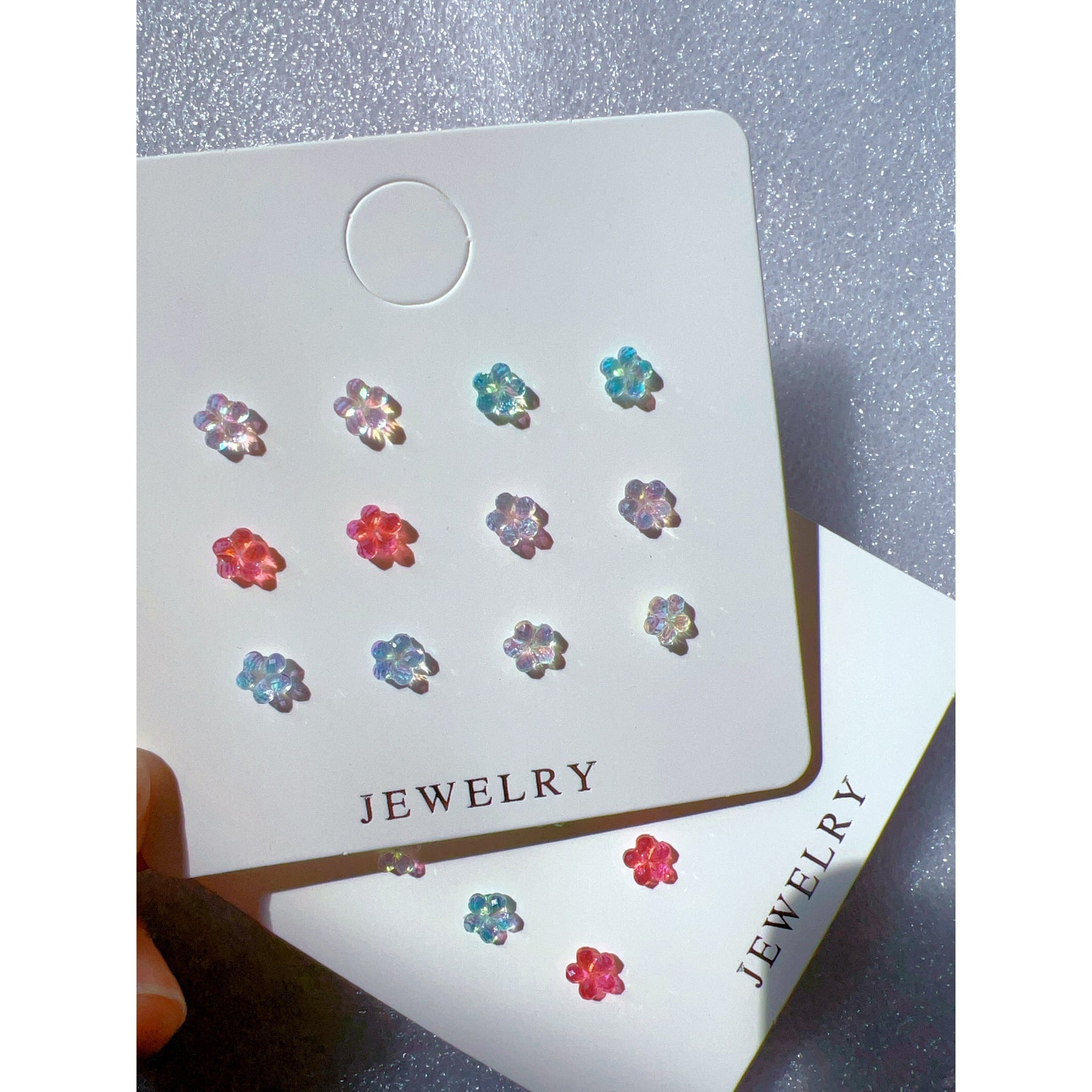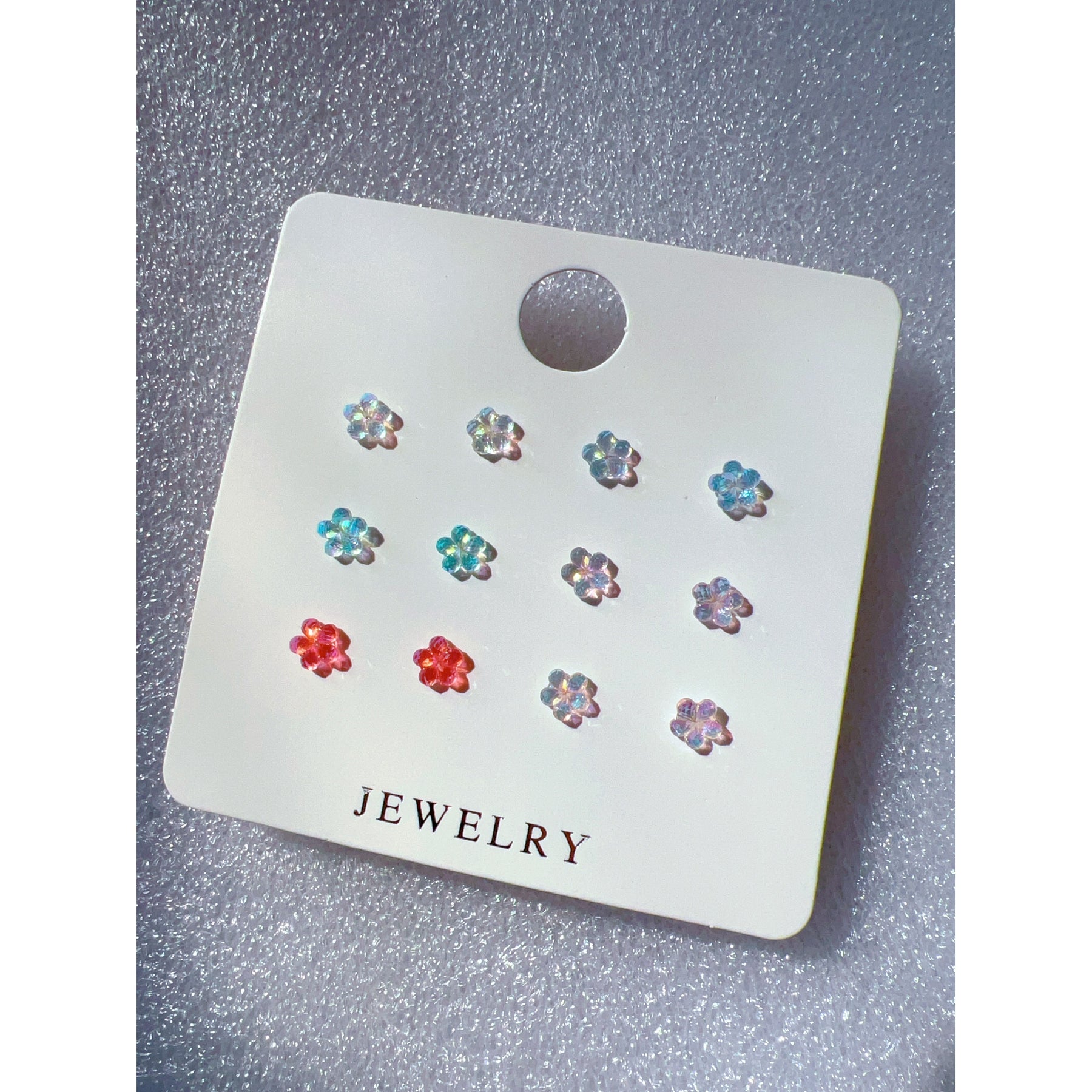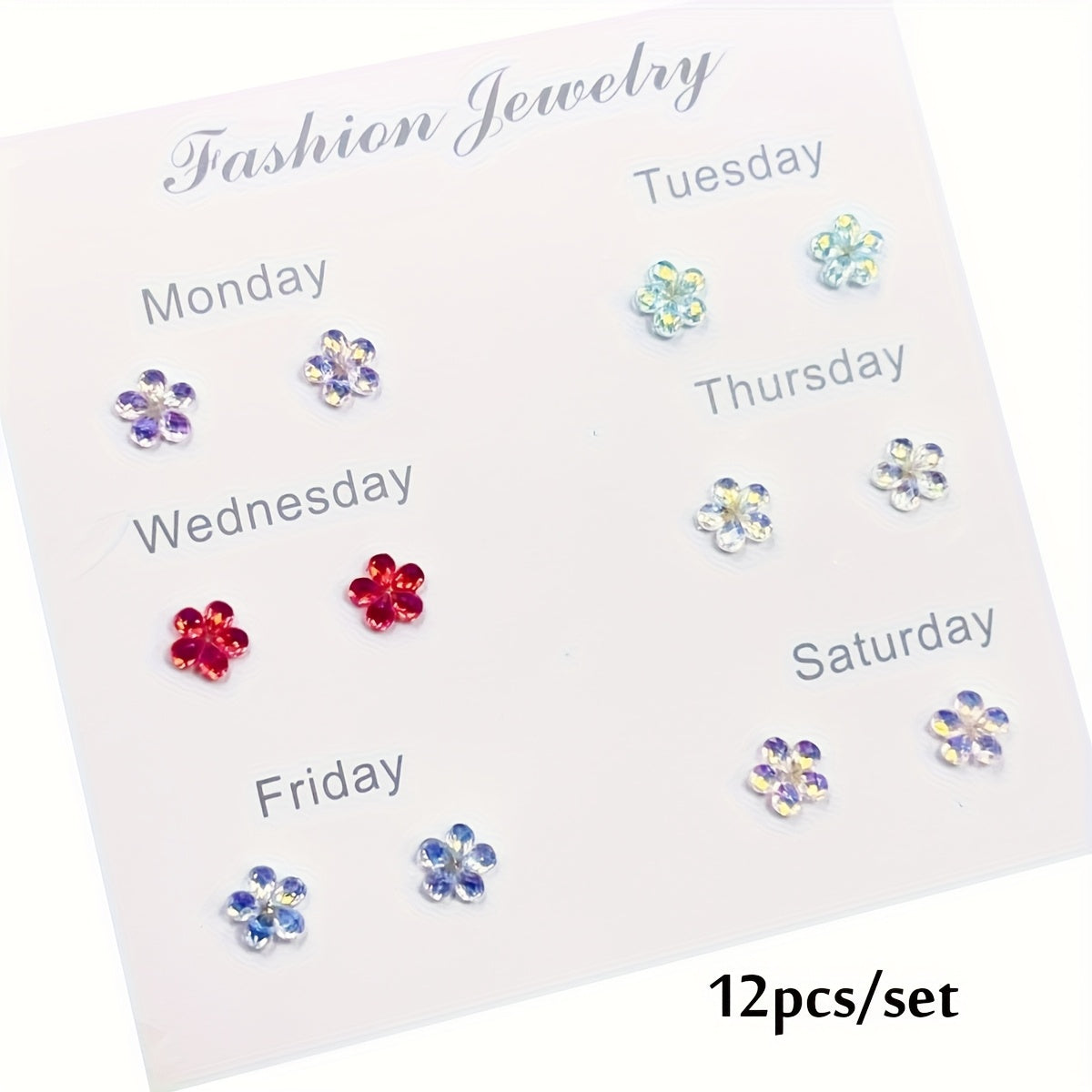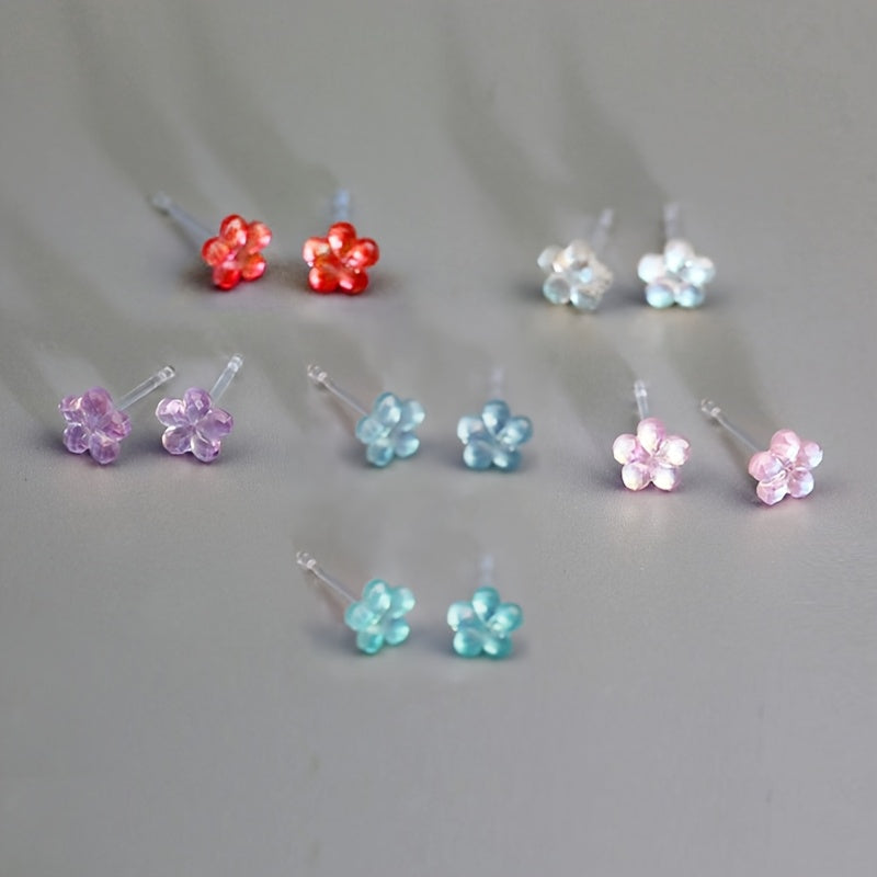 This set includes 12 small flower resin earrings in various colors with plastic ear needles to prevent allergies. The earrings are vibrant and perfect for daily wear.