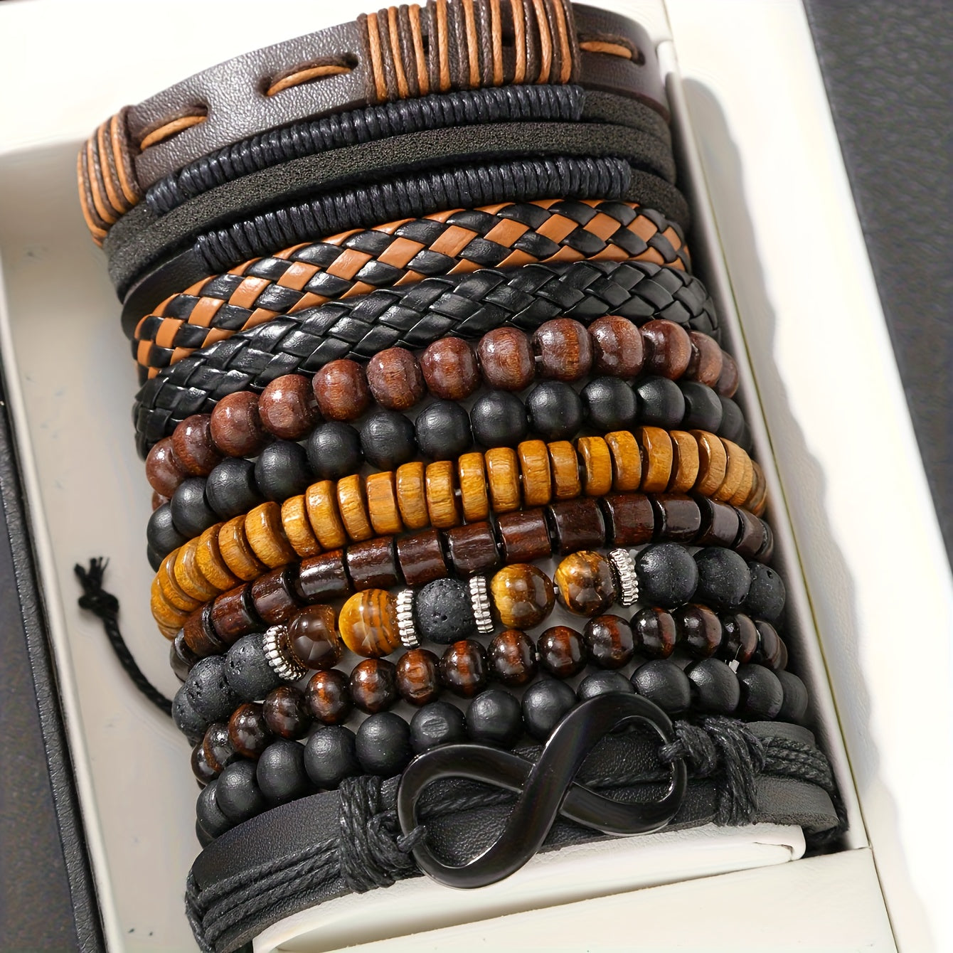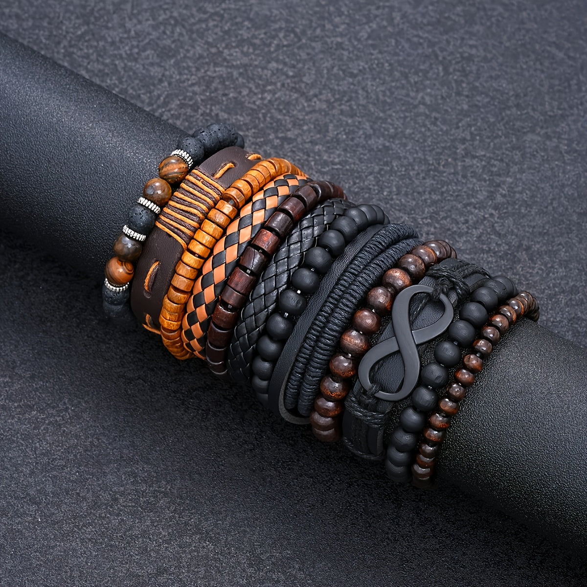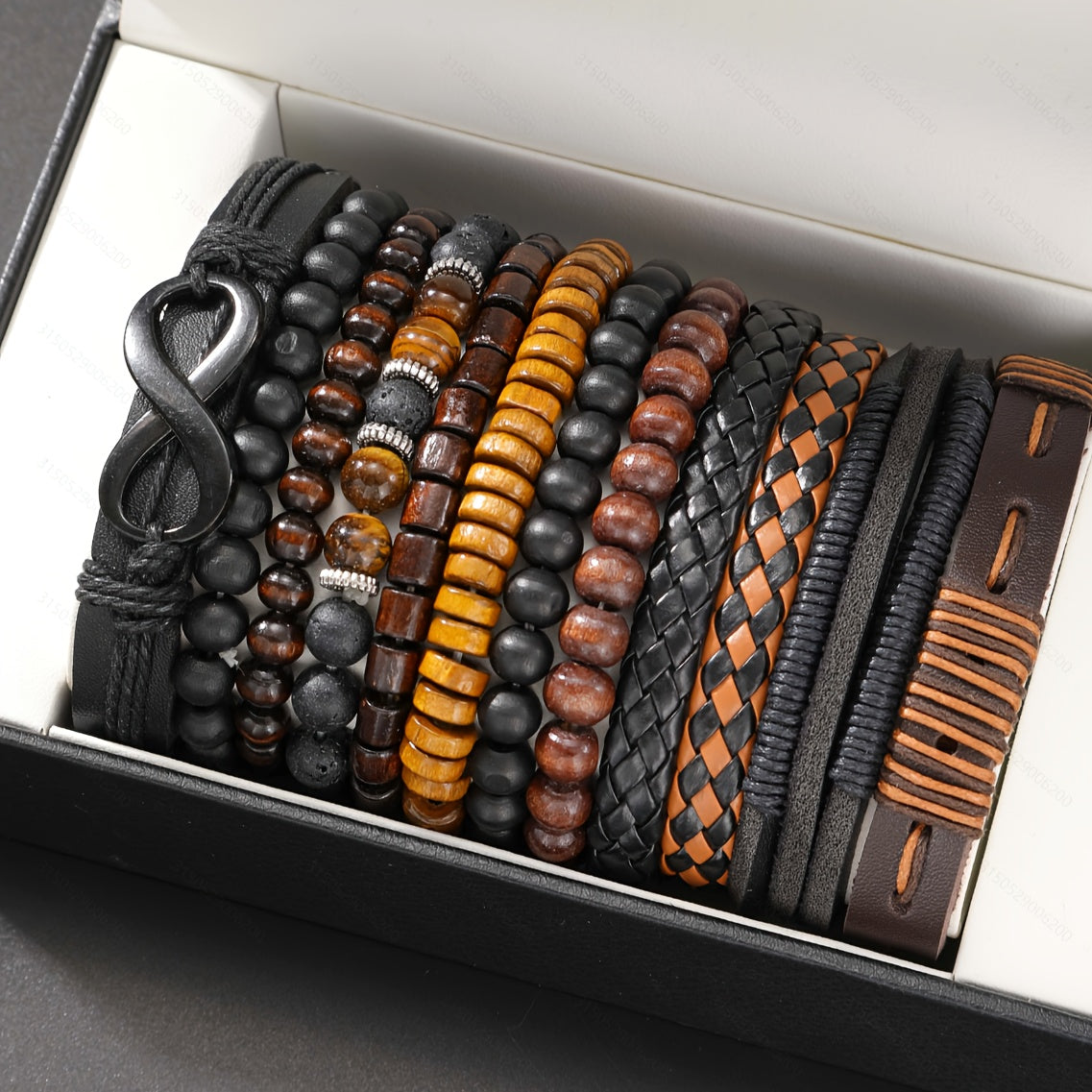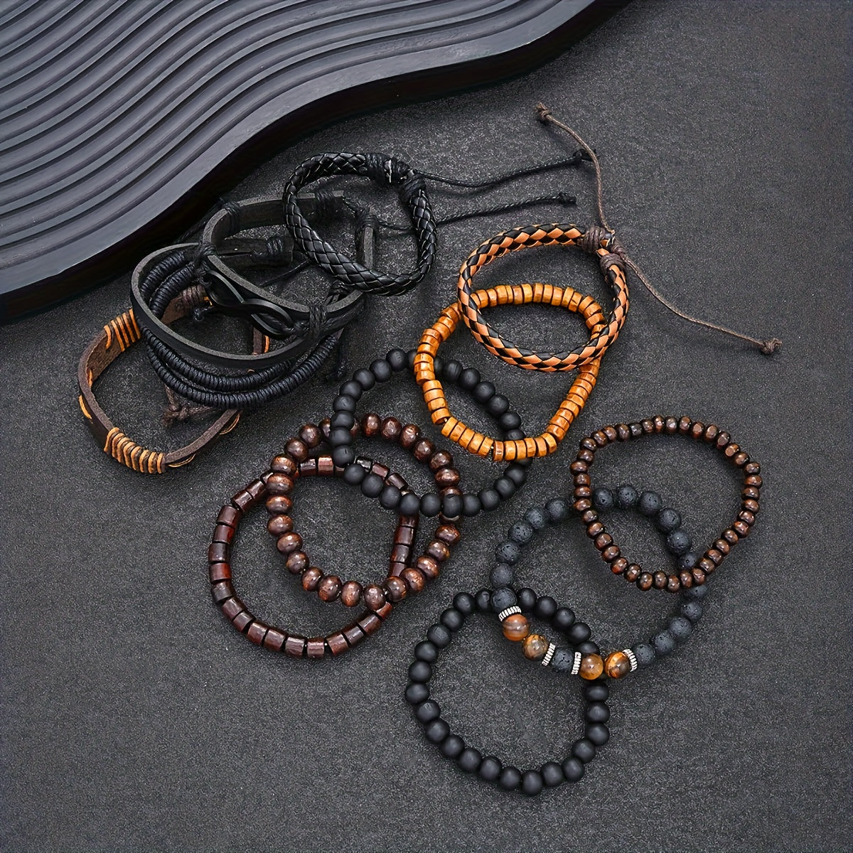 Enhance your look with this 12-piece set of street style wooden bead beaded faux leather bracelets. Perfect for men's jewelry collection.