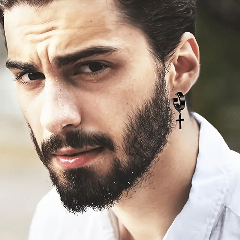 This set includes 15 pairs of stainless steel earrings featuring various designs like studs, dangles, crosses, and huggies. The earrings are hypoallergenic, suitable for men and women.