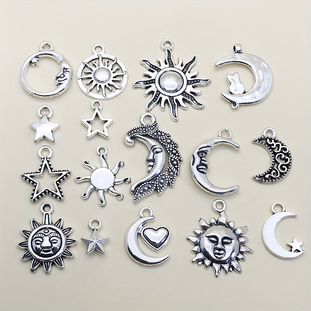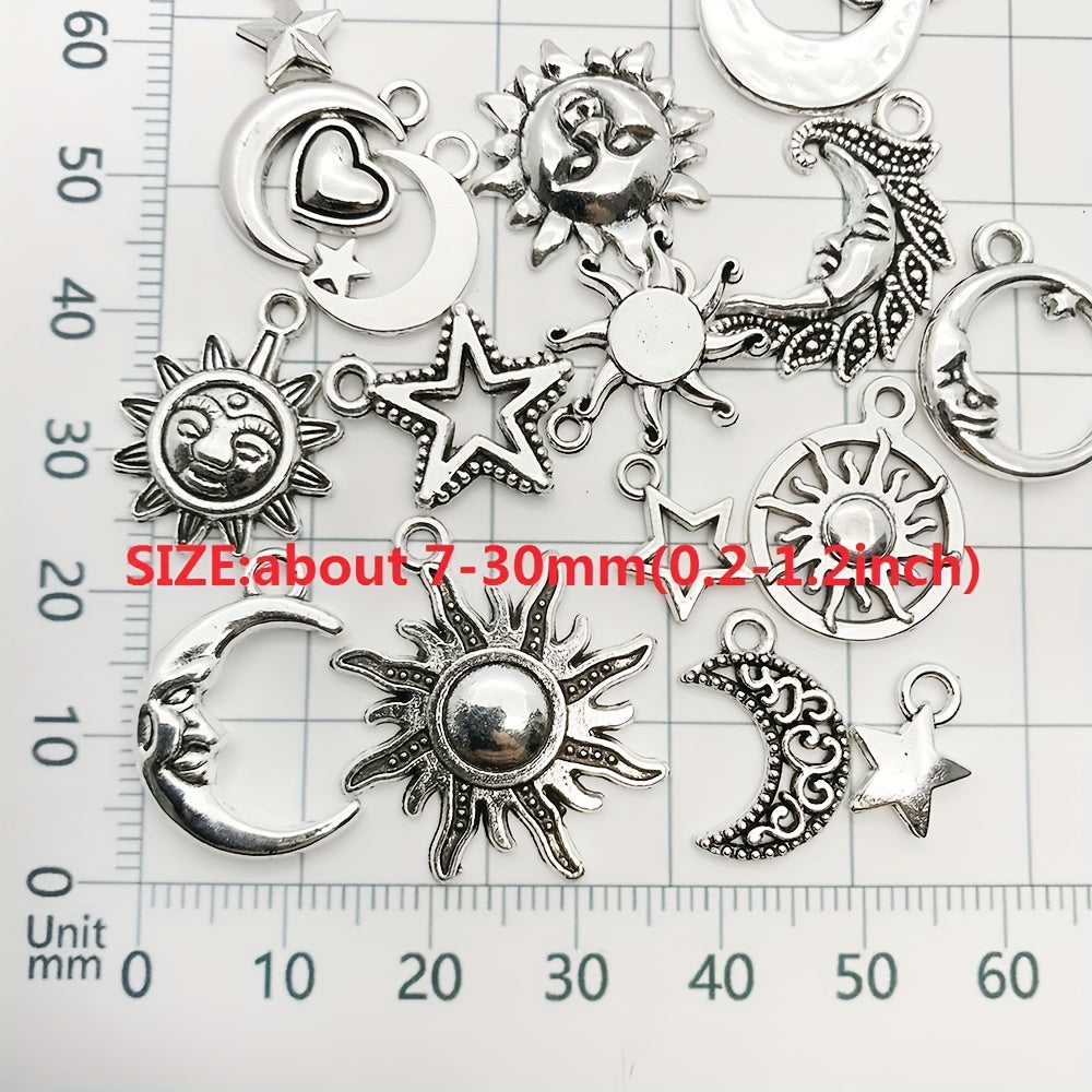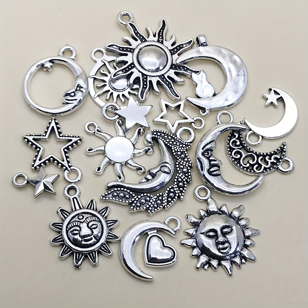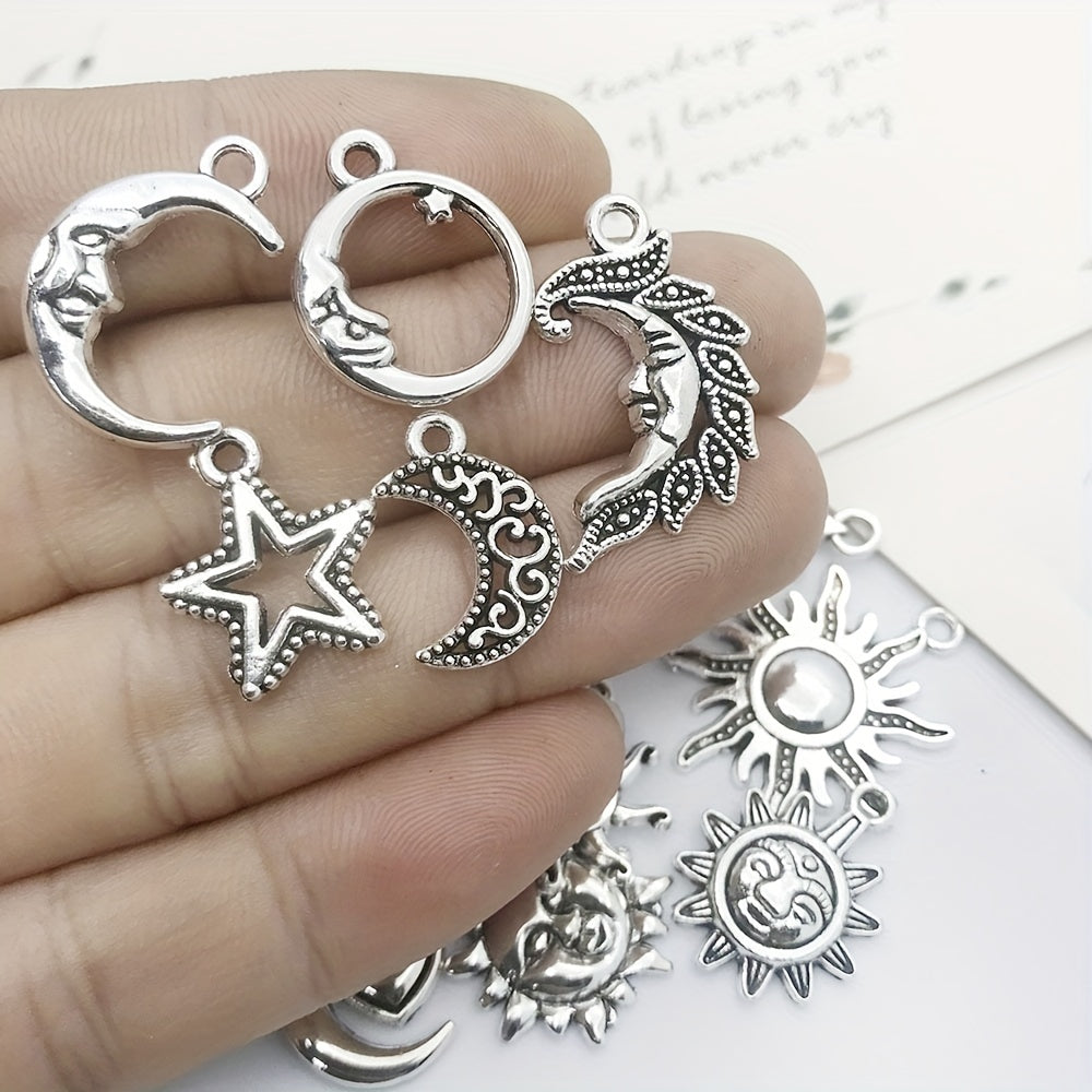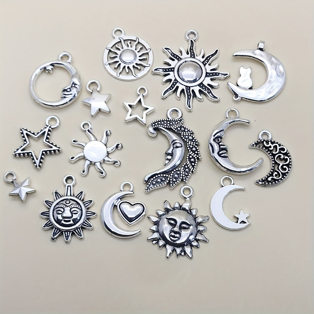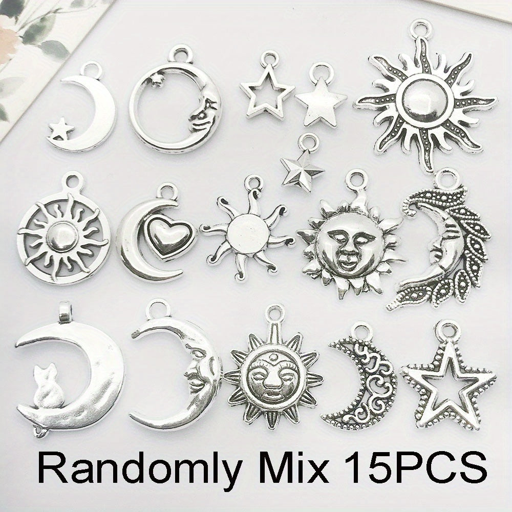 Enhance your DIY projects with this set of 15 antique silver sun, moon, and star charms pendants. Ideal for creating unique necklaces, bracelets, and earrings.