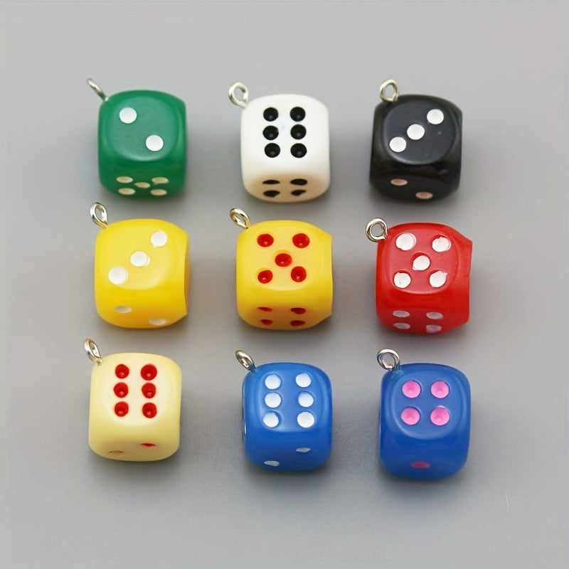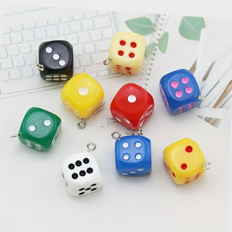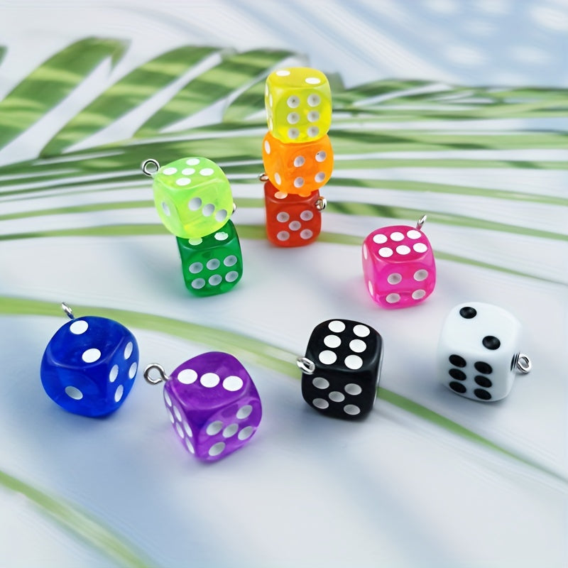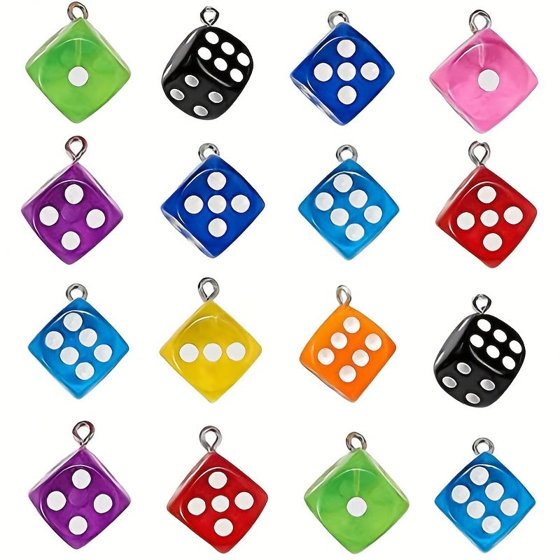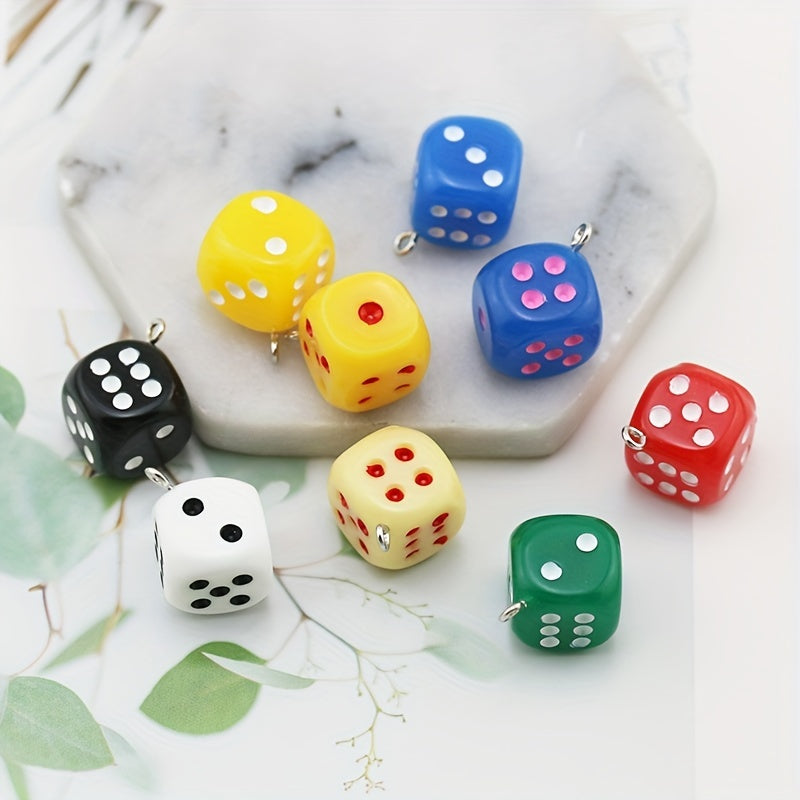 Get this set of 15 resin dice in various colors to create unique jewelry pieces. These small pendants can be used for earrings, keychains, necklaces, and more!