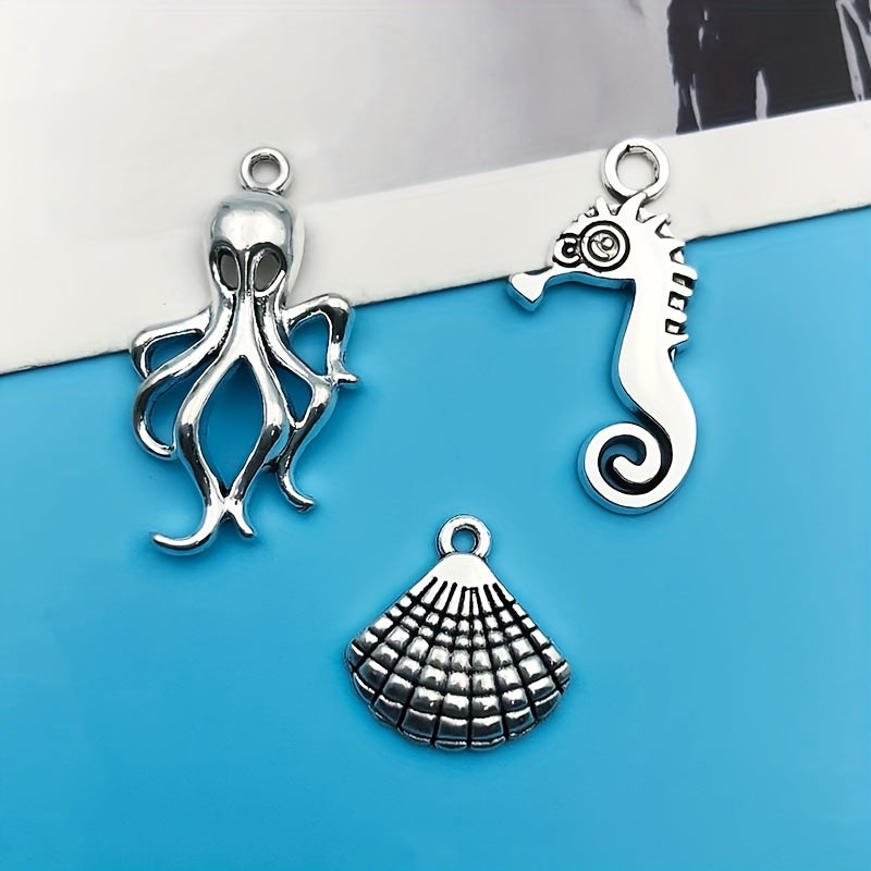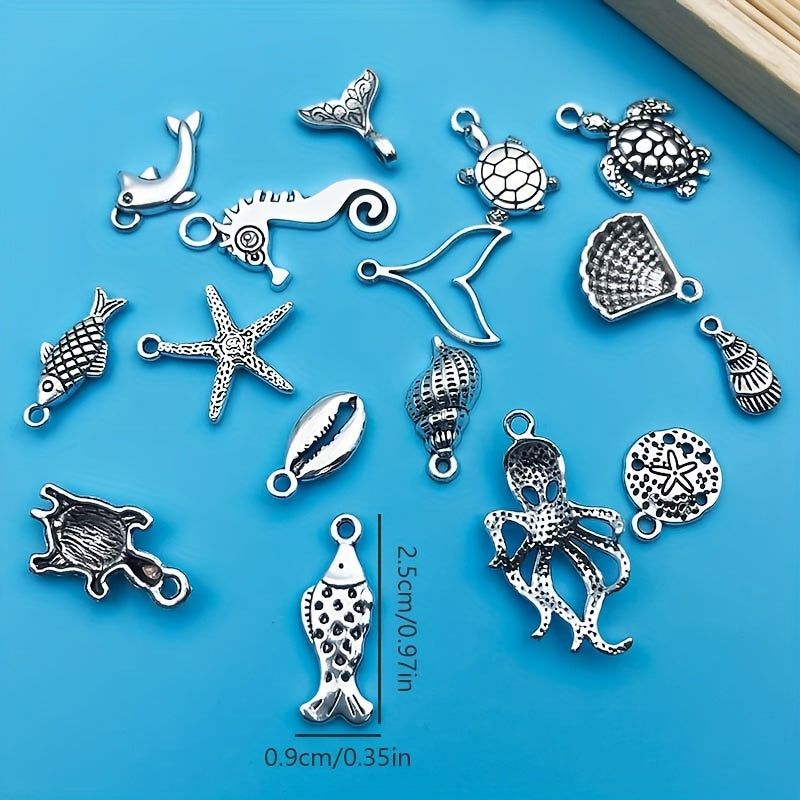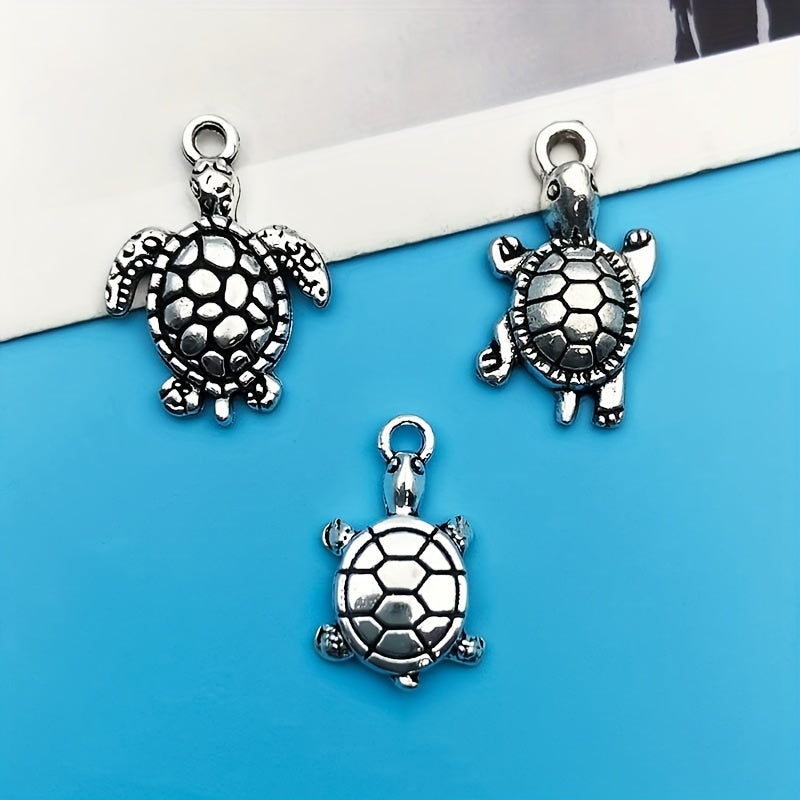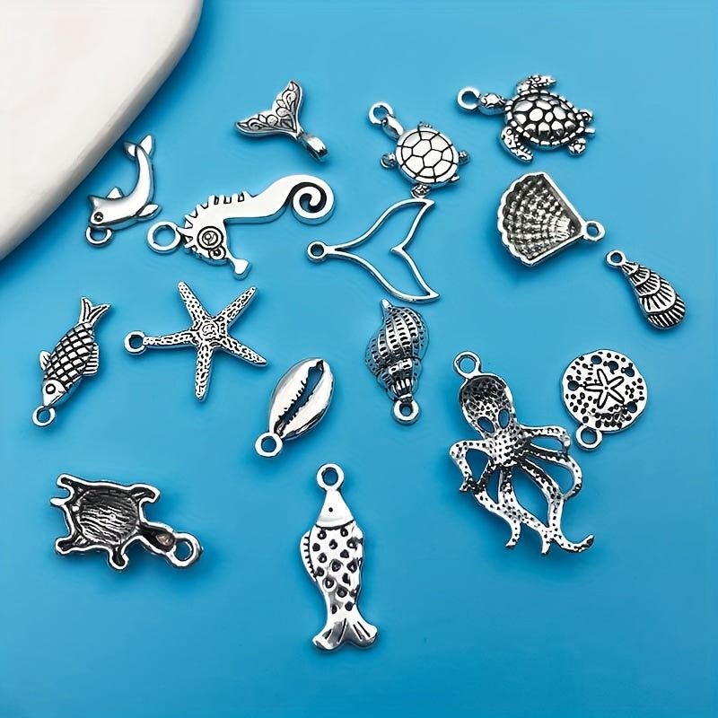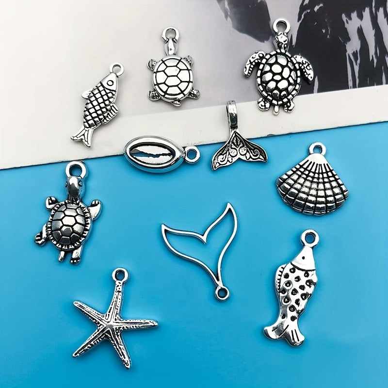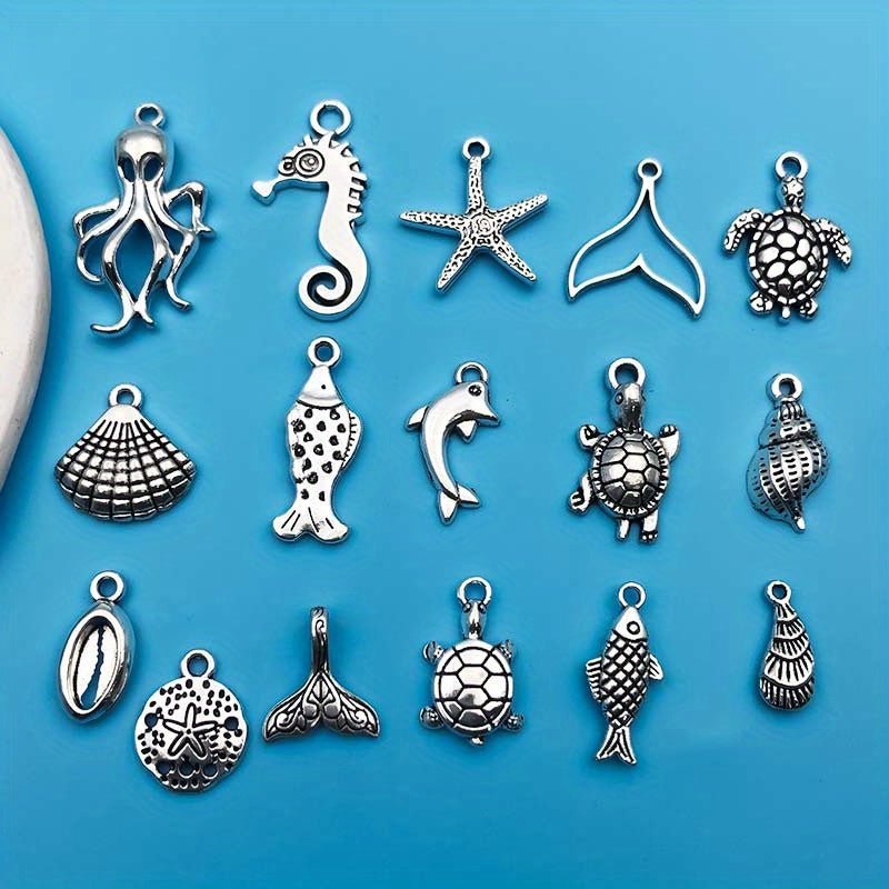 Create stunning jewelry with this set of 15 zinc alloy pendants in antique silver finish featuring ocean-inspired starfish and turtle shapes. Perfect for necklaces, bracelets, earrings, and more.