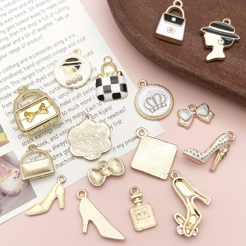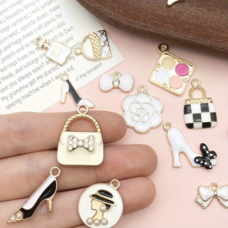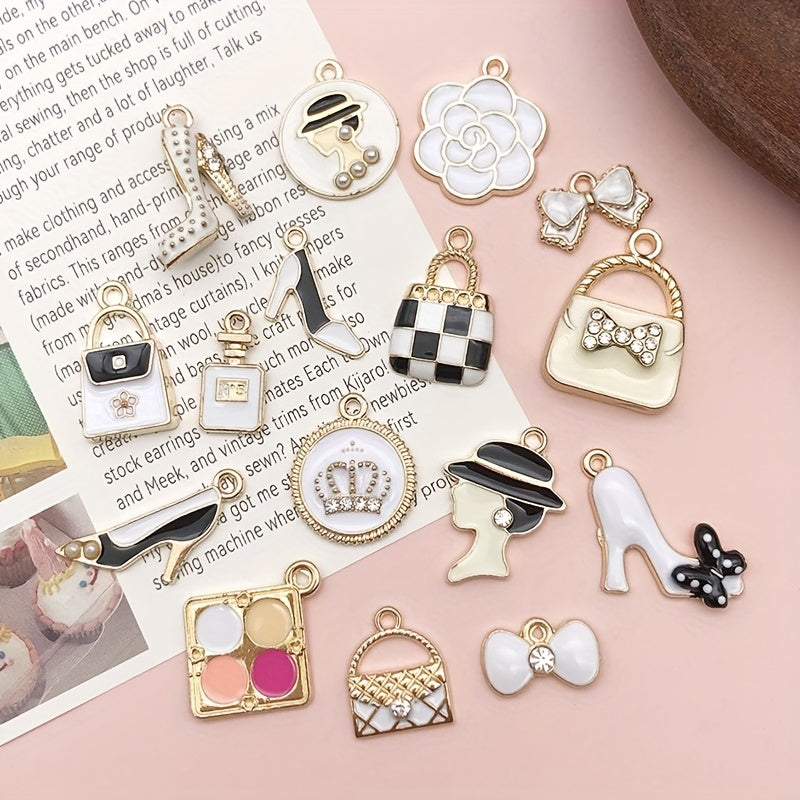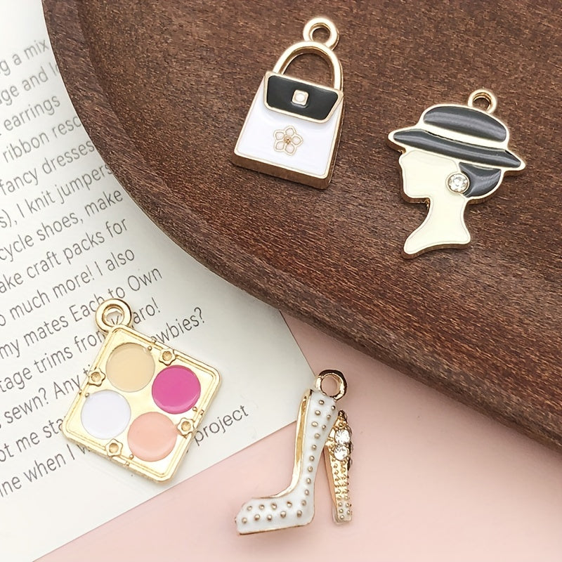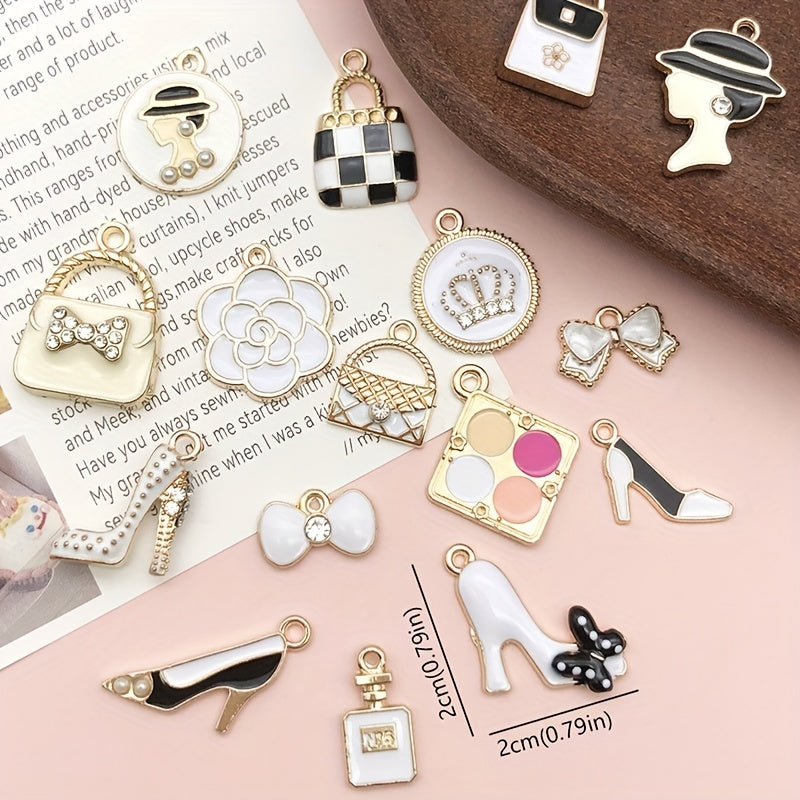Add charm to your DIY jewelry with this set of 16 assorted mini plated enamel charms featuring lipstick and perfume designs. Perfect for necklaces, bracelets, and earrings.