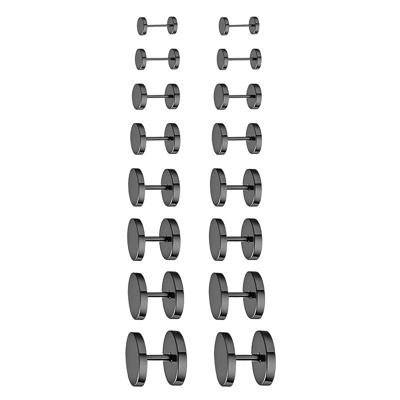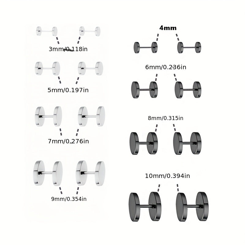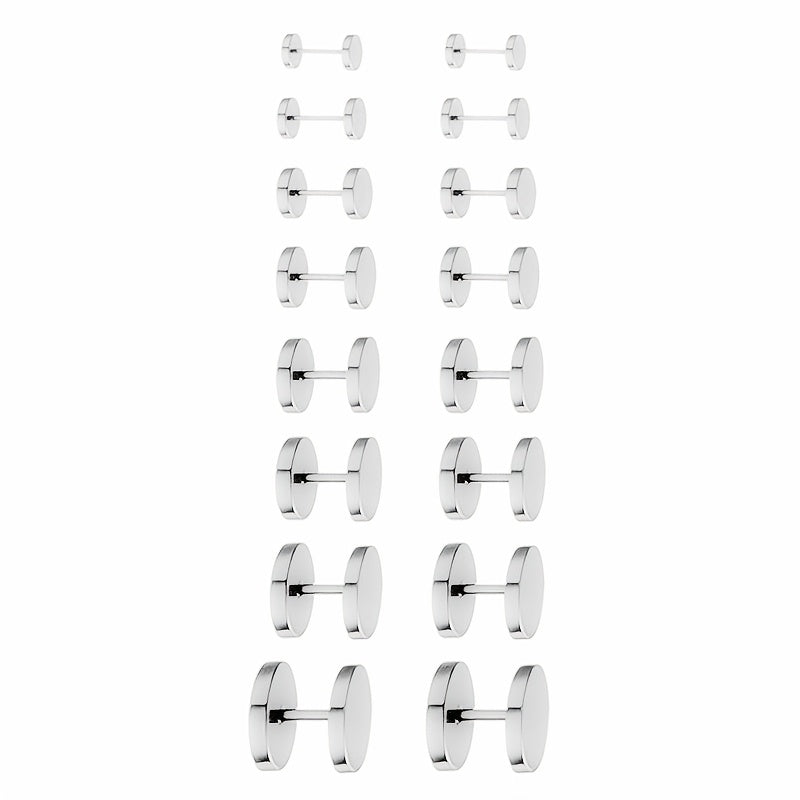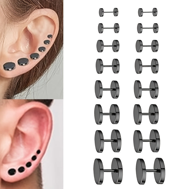 This set includes 16 stainless steel barbell stud earrings with flat back screw posts. Ideal for cartilage piercings and versatile for everyday wear.