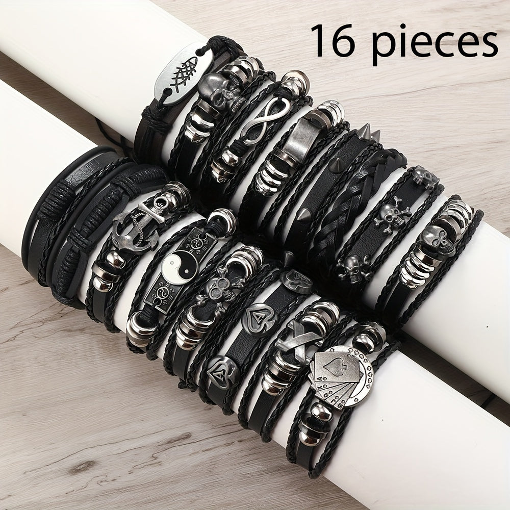 Add a touch of personality to your outfit with this set of 16 vintage faux leather woven bracelets. Perfect for daily wear or parties, these bracelets make a great gift for men.