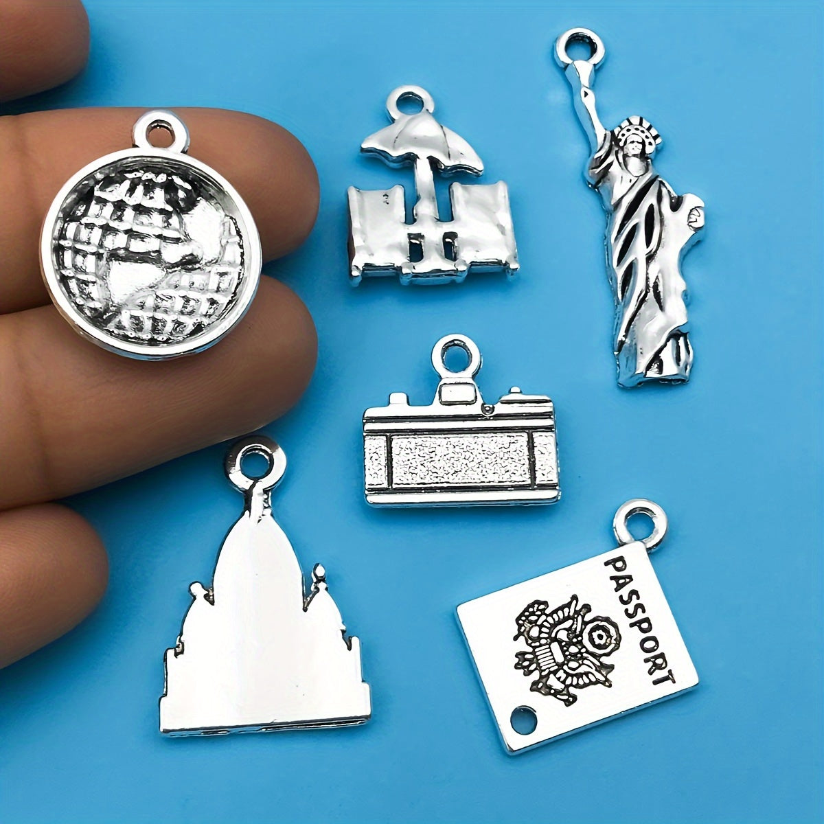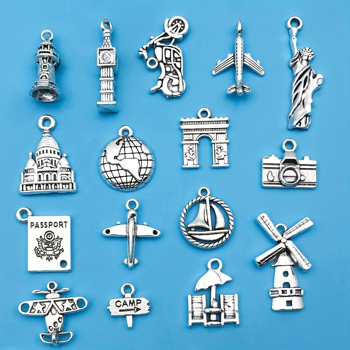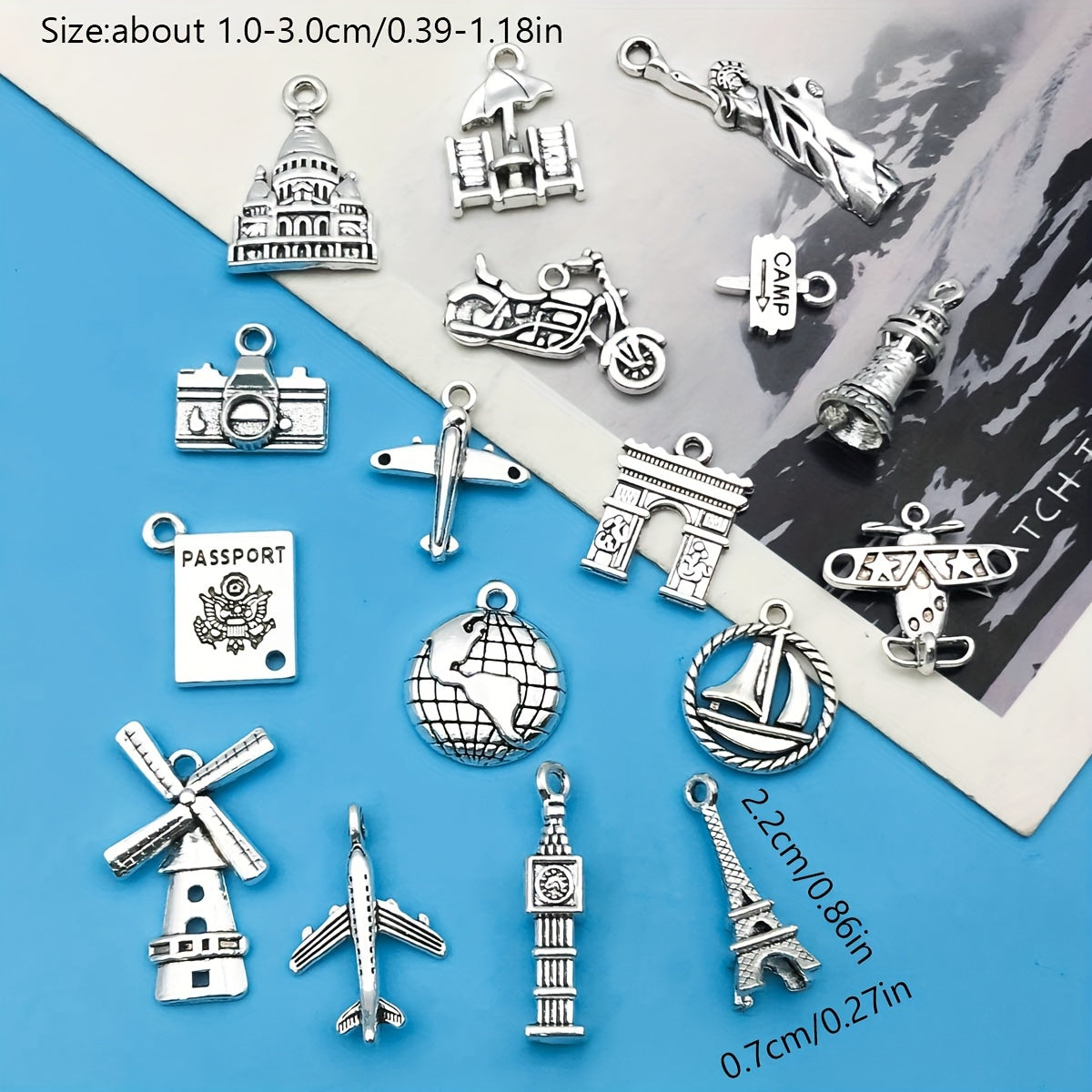 Add a touch of wanderlust to your creations with this set of 17 randomly mixed zinc alloy antique silvery travel charms in aircraft and earth shapes. Perfect for DIY necklace, bracelet, and earring projects.
