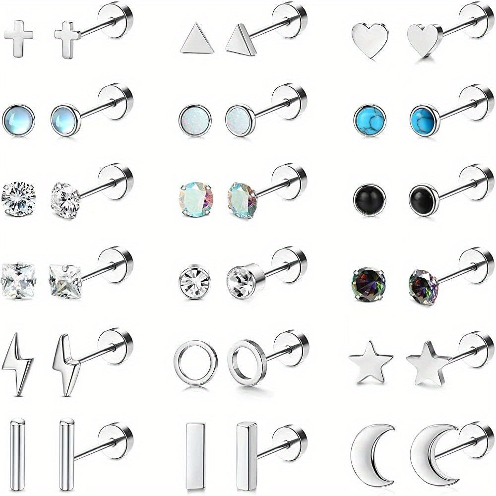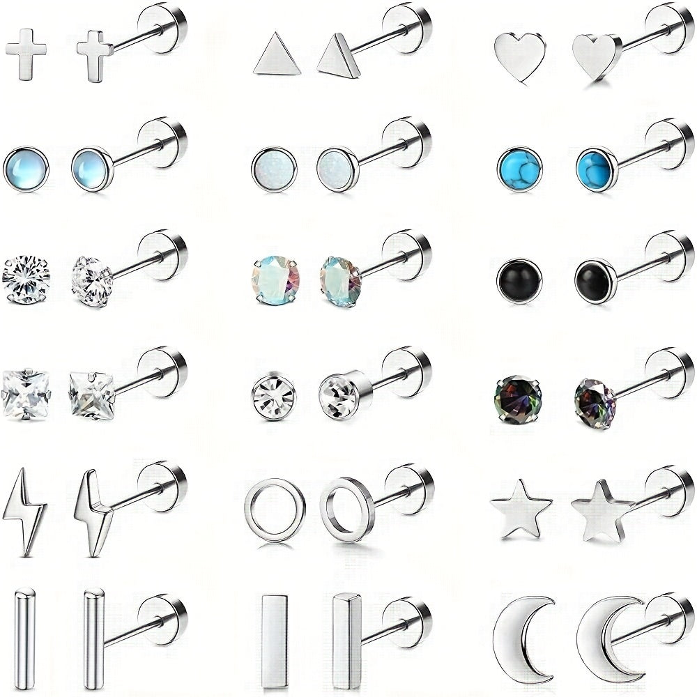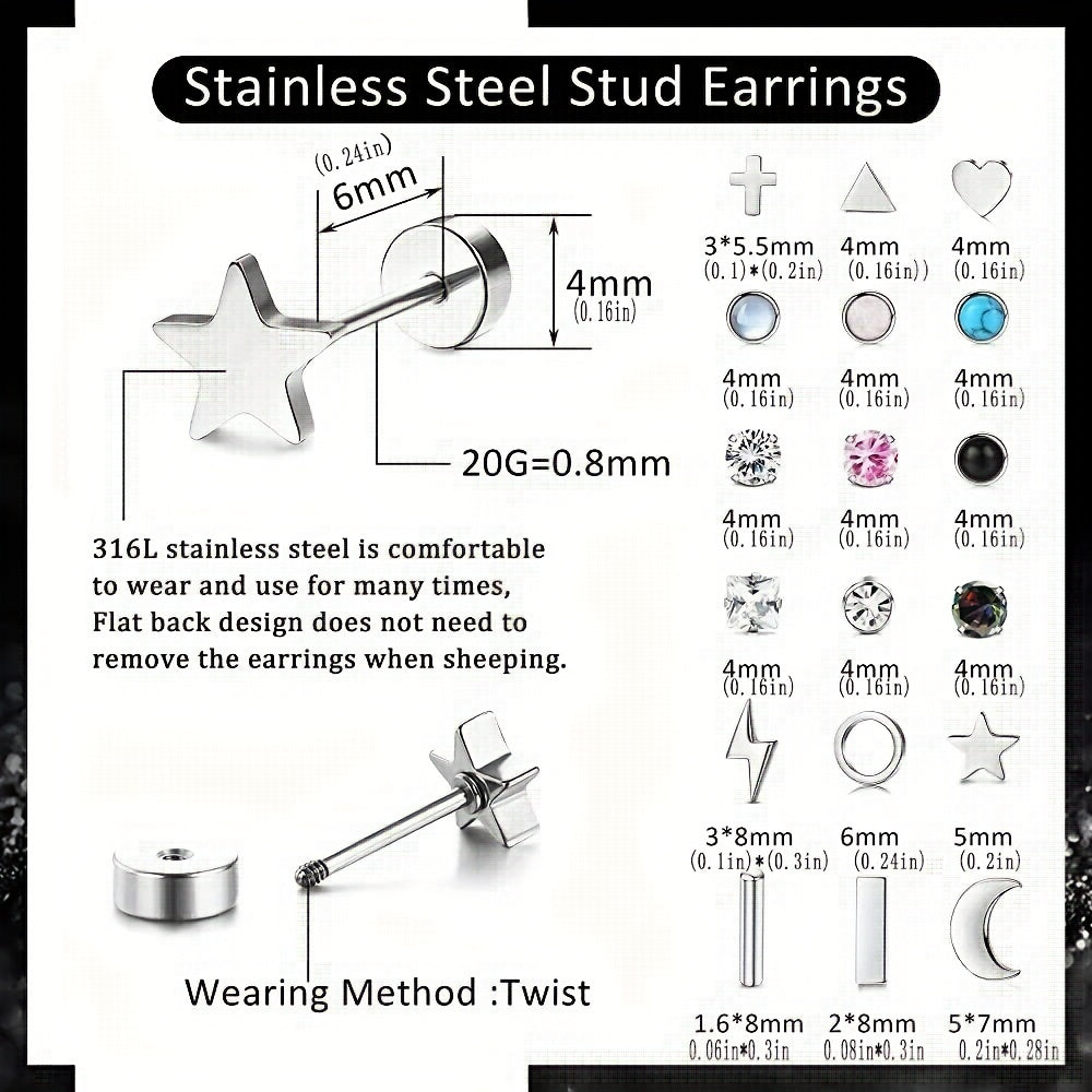 This pack includes 18 pairs of stainless steel zircon stud earrings in universal styles like star, moon, and heart shapes. Perfect for boys.