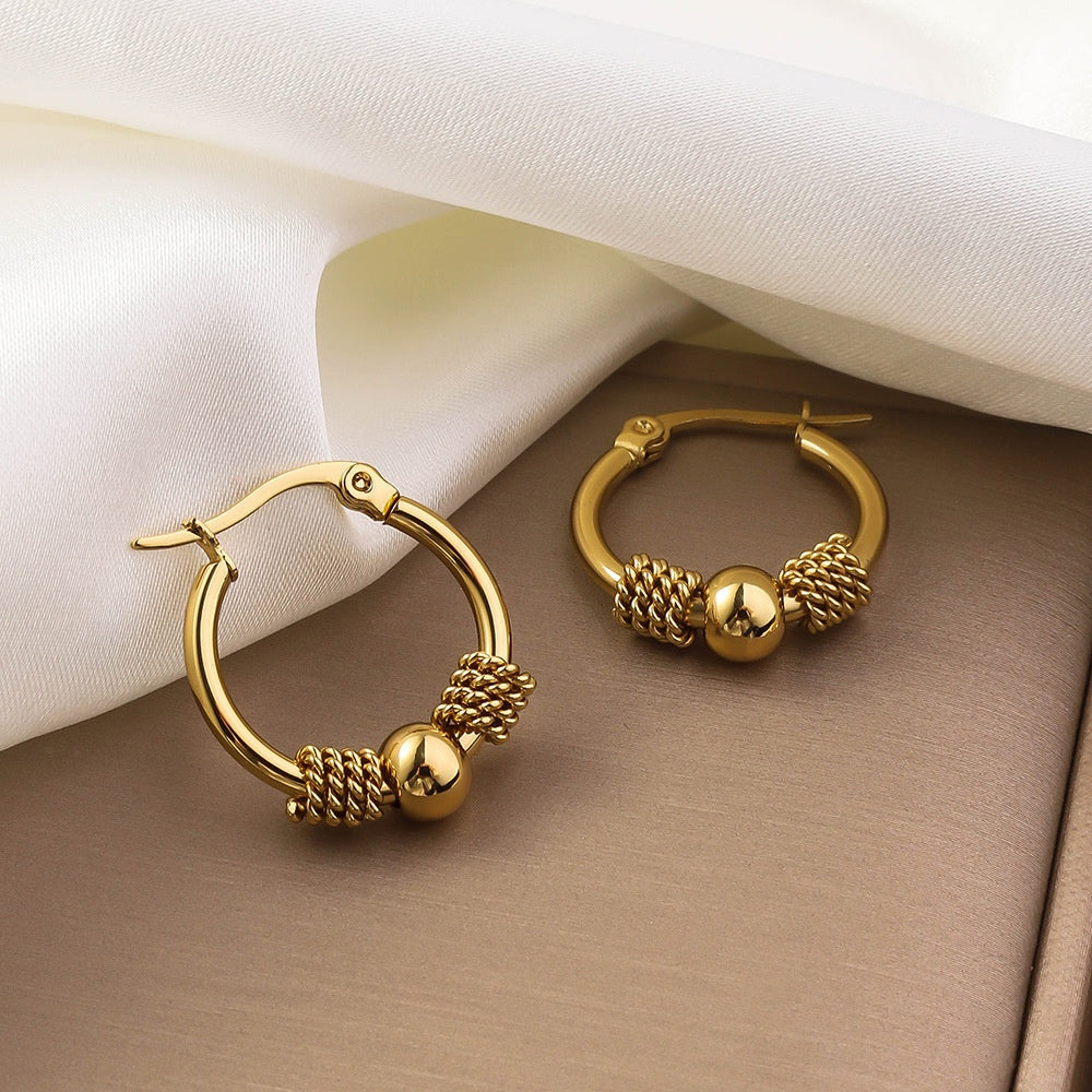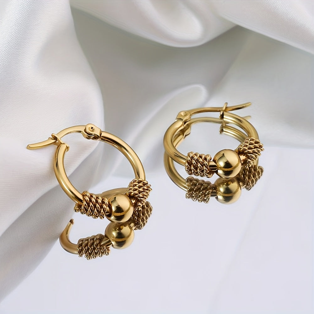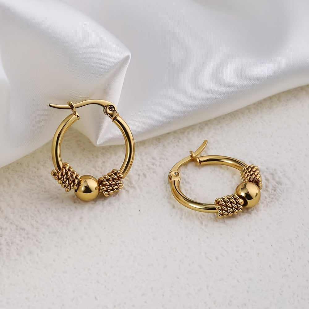 Elevate your style with these chic hoop earrings featuring braided and spherical beads. Made of stainless steel with 18K gold plating, these earrings are perfect for daily wear and make a great gift for your loved ones.