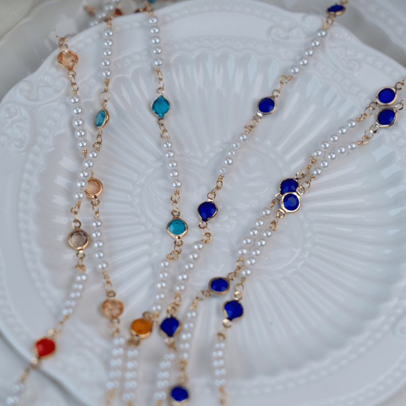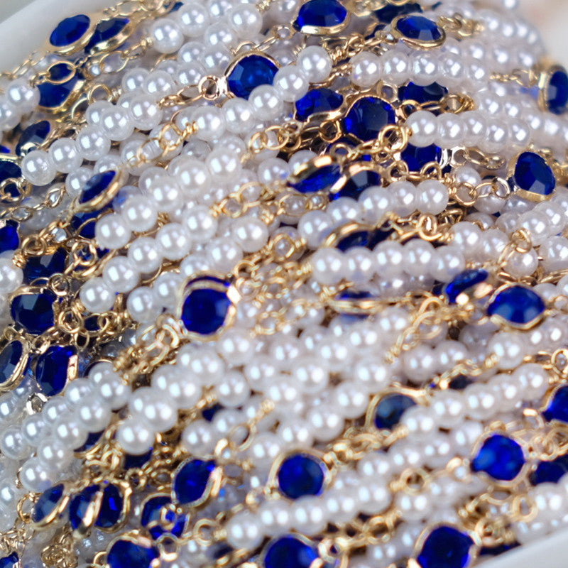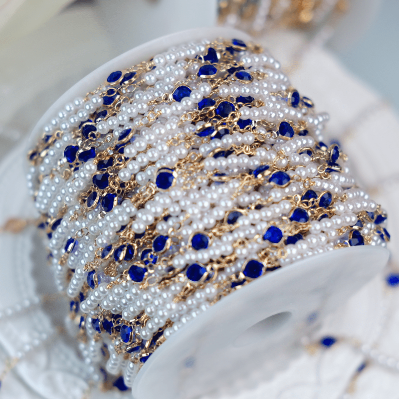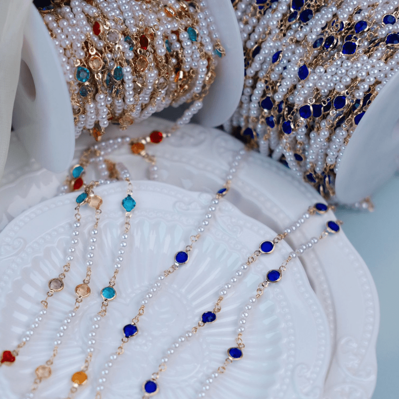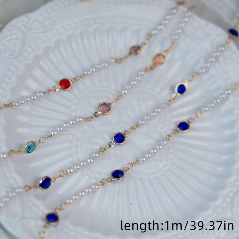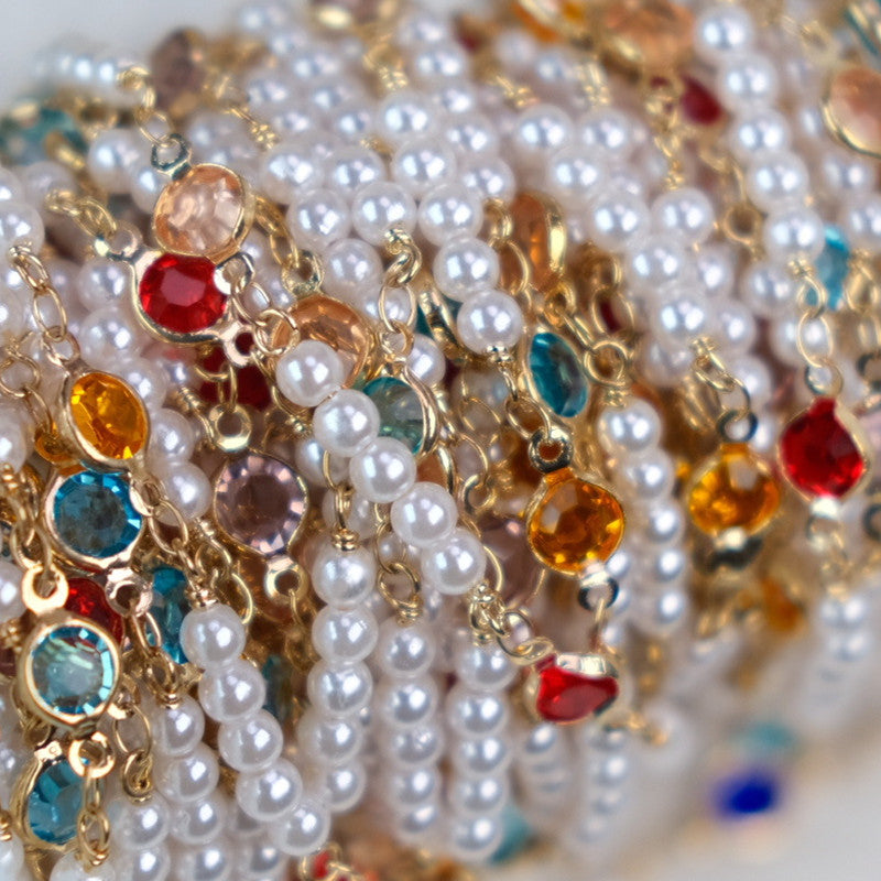 Create stunning bracelets, necklaces, and chokers with this colorful rhinestone and faux pearl bead chain. Perfect for your crafting needs.