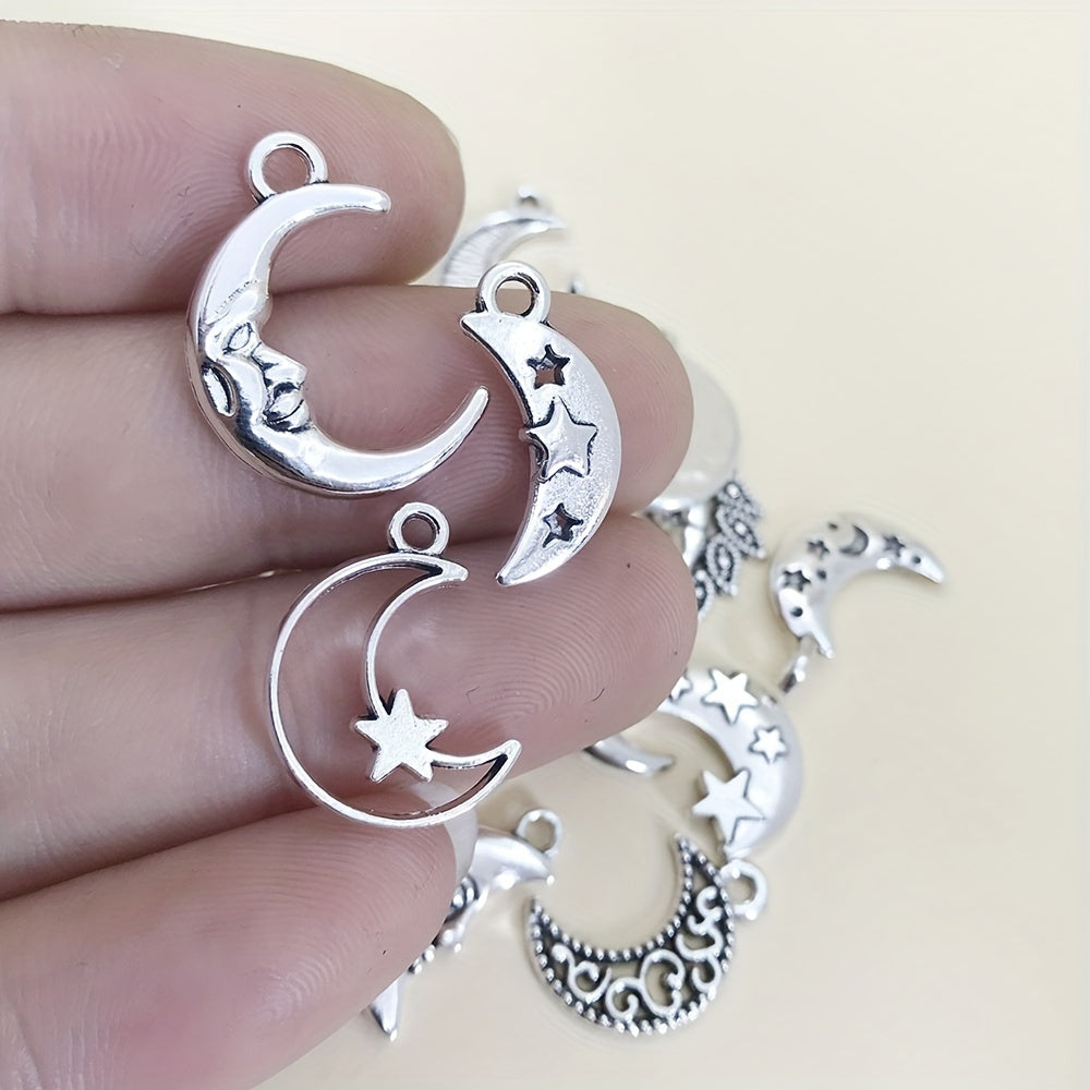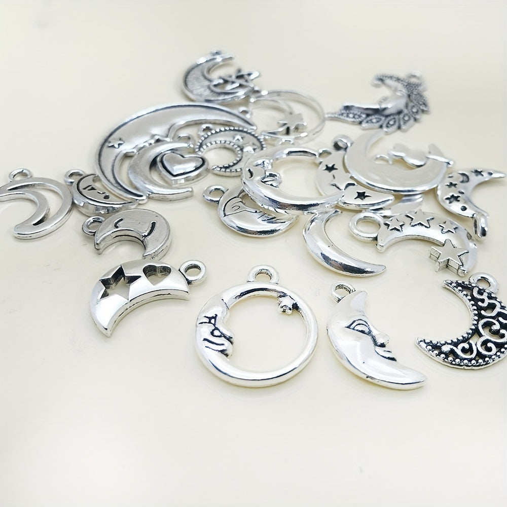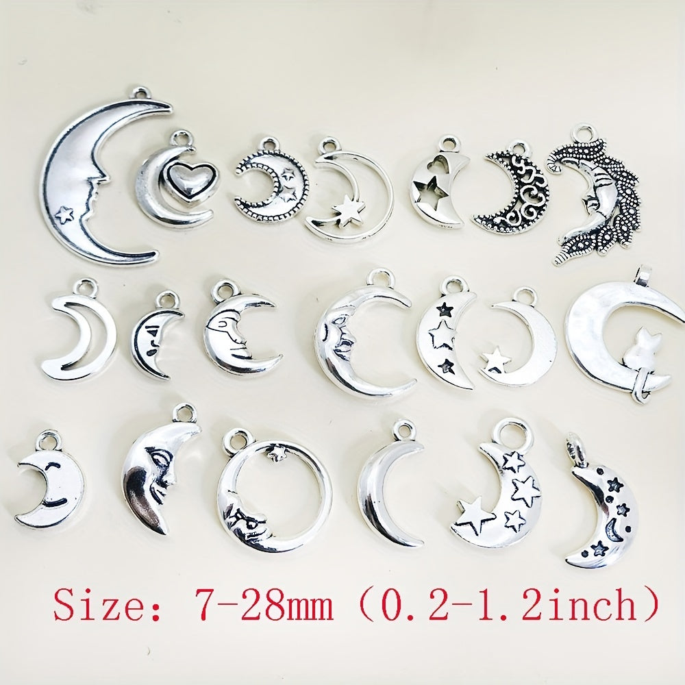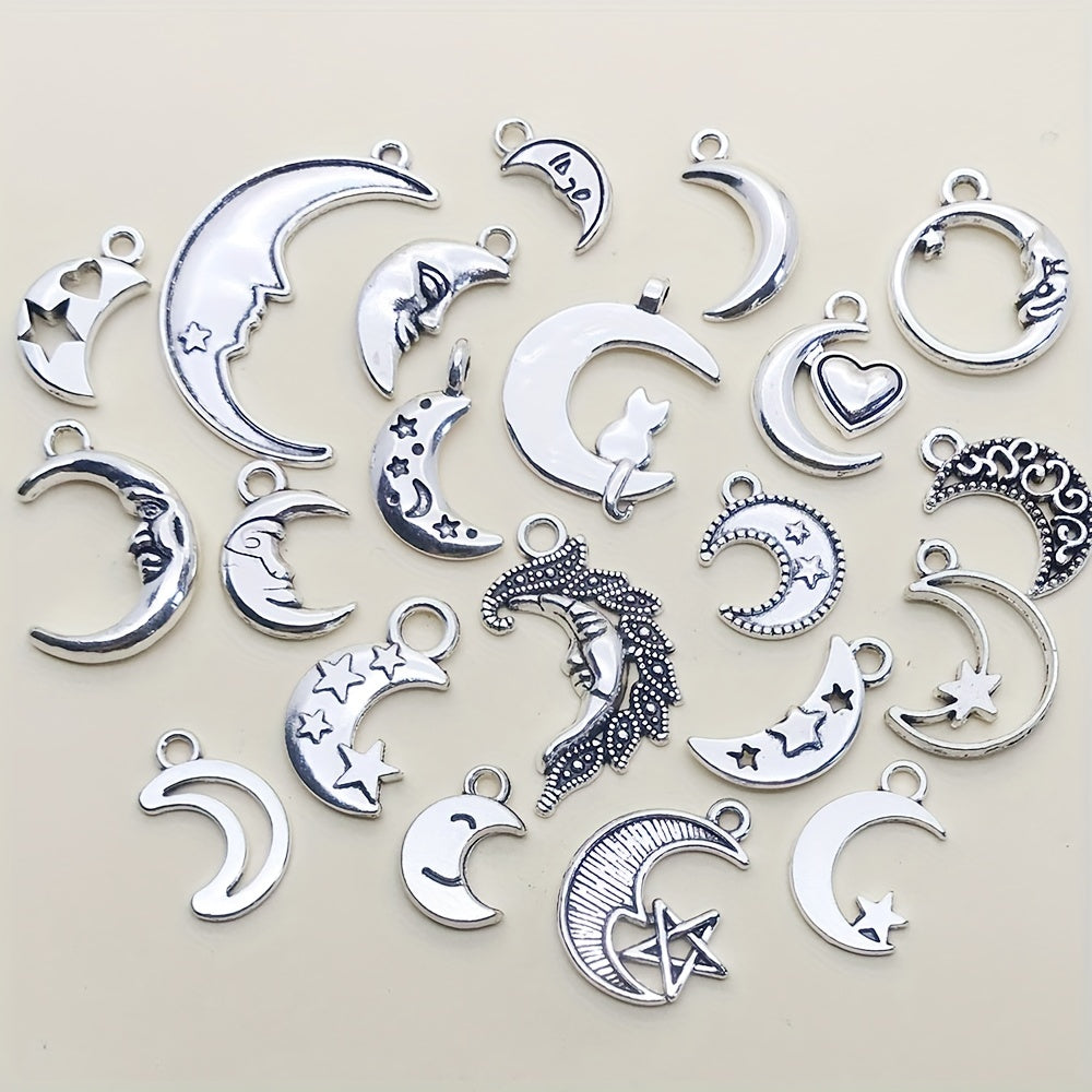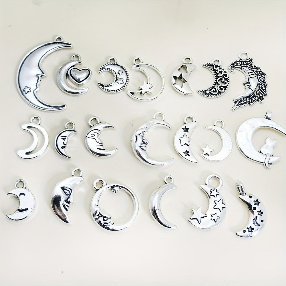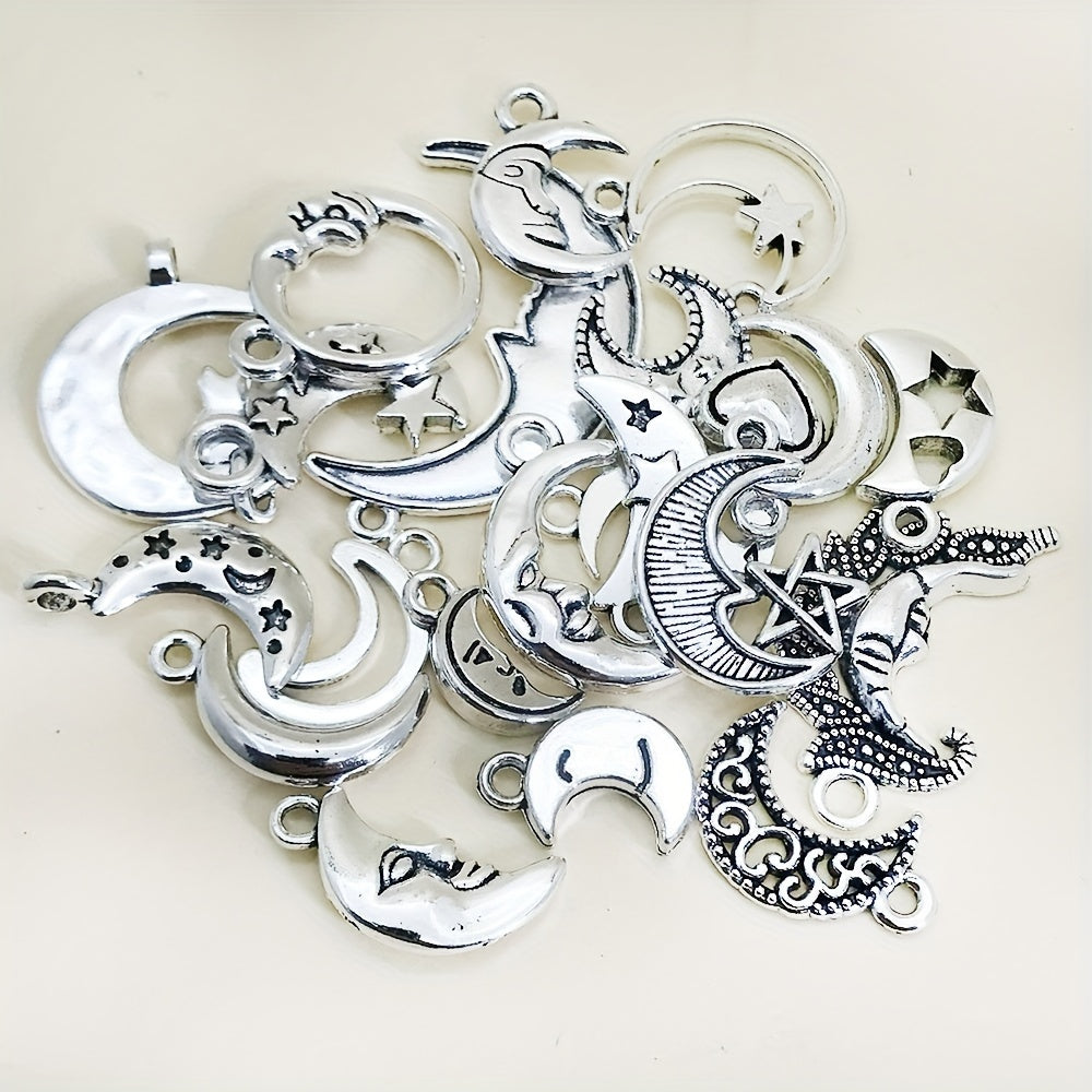 Enhance your jewelry crafting with this set of 20 antique silver moon, sun, and star charms pendants. Perfect for DIY necklace and bracelet projects.