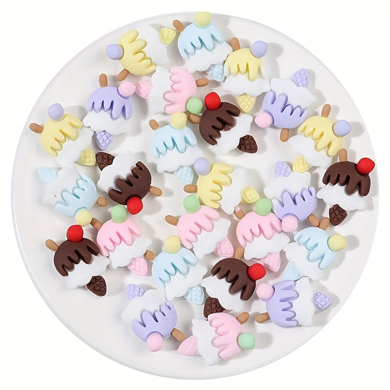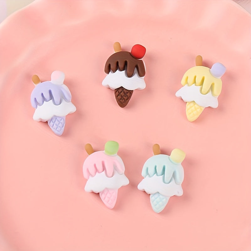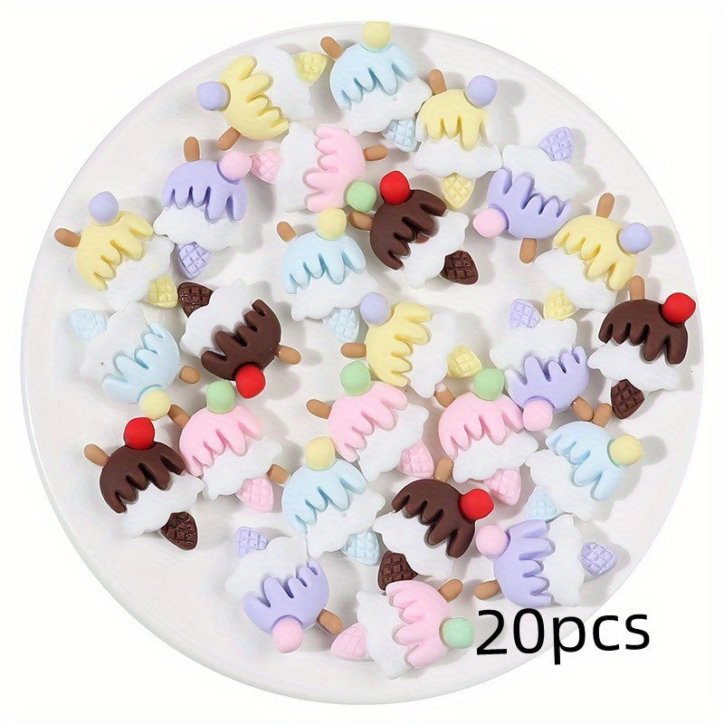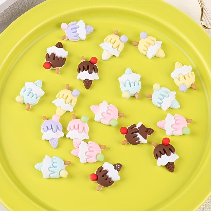 This set includes 20pcs of adorable cartoon ice cream resin pieces that can be used for various DIY projects. Perfect for creating jewelry, decorating mobile phone cases, making hairpins, brooches, car decorations, and dollhouse embellishments.