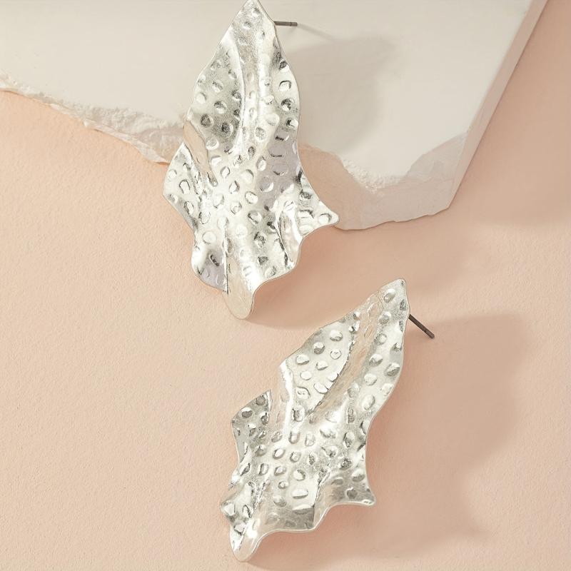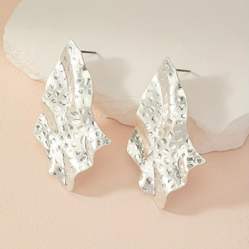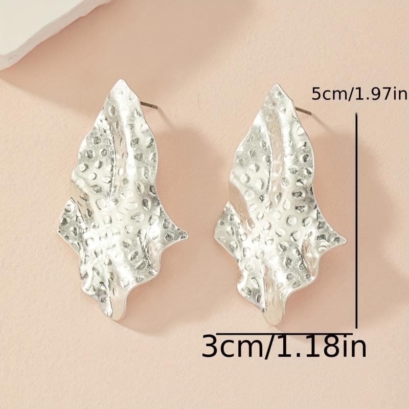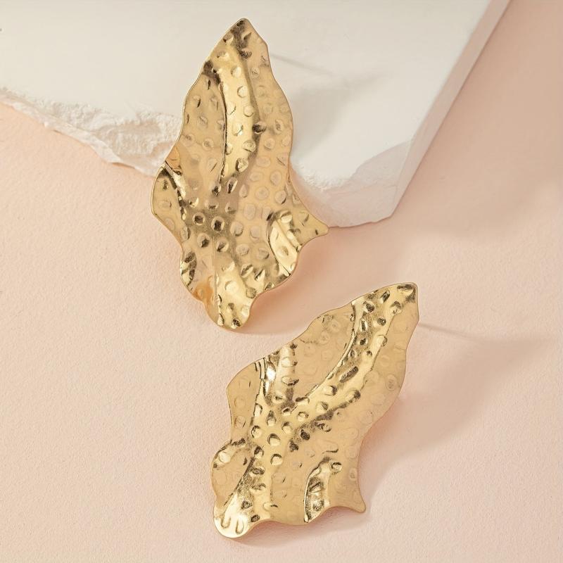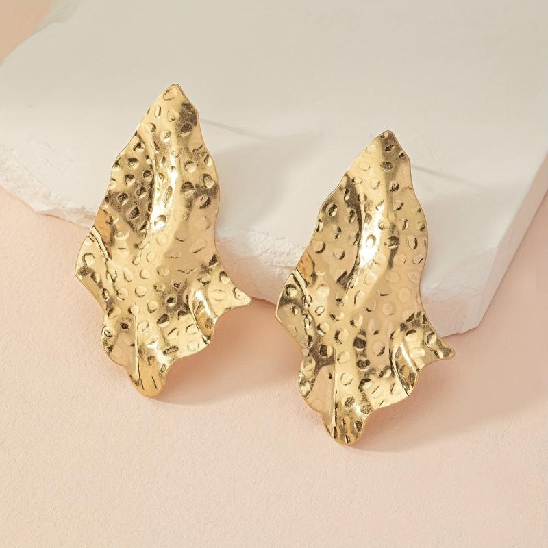 These quirky golden earrings feature irregular geometric shapes with a bold hammered texture, perfect for adding a unique touch to your casual attire, parties, and shows.