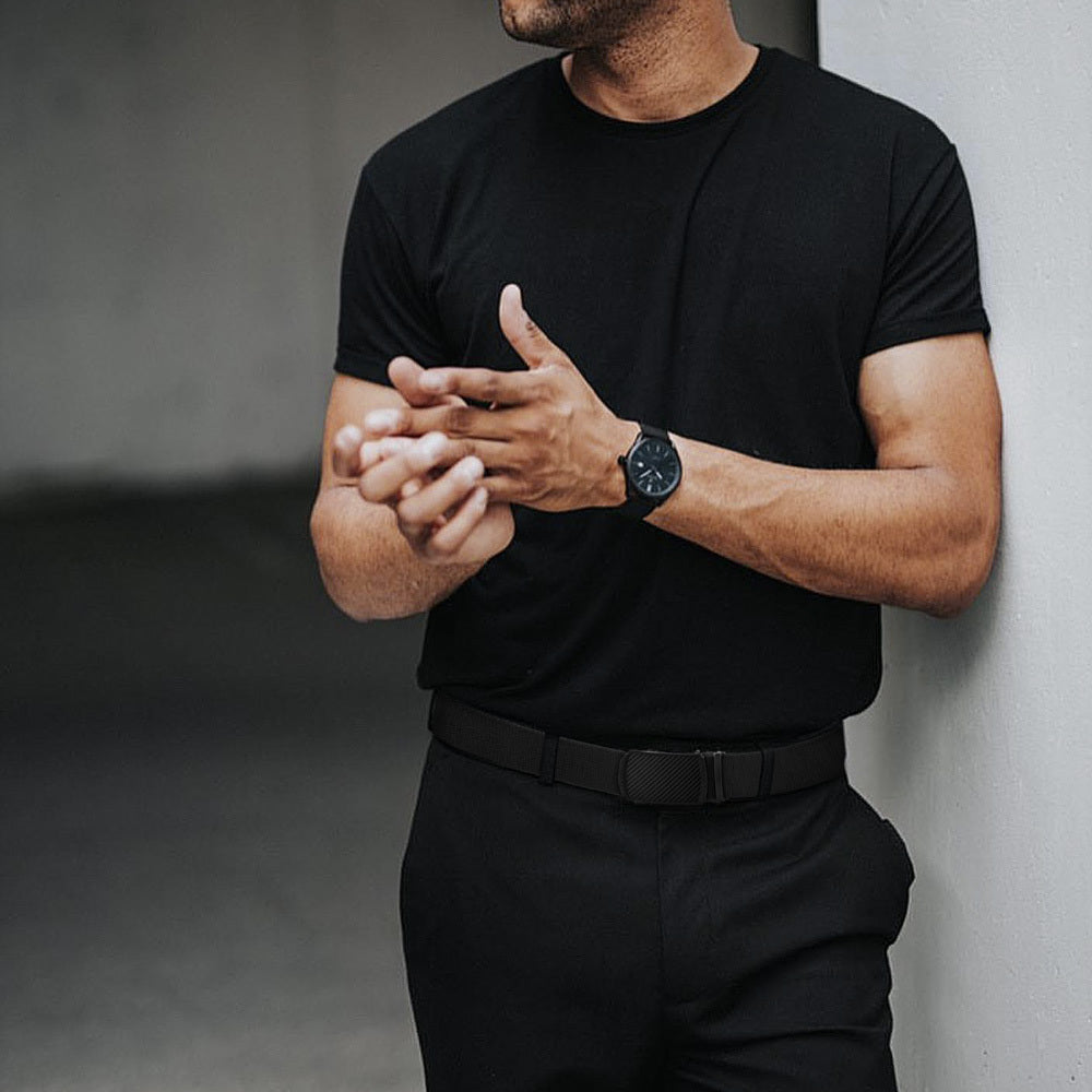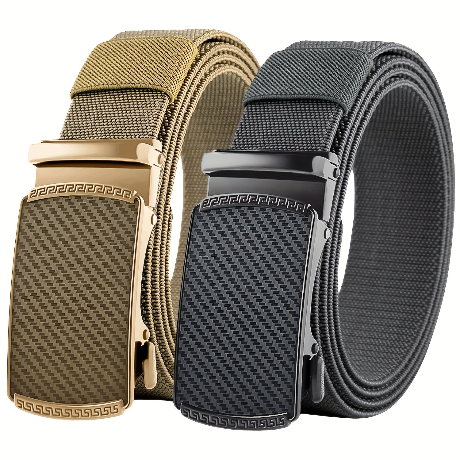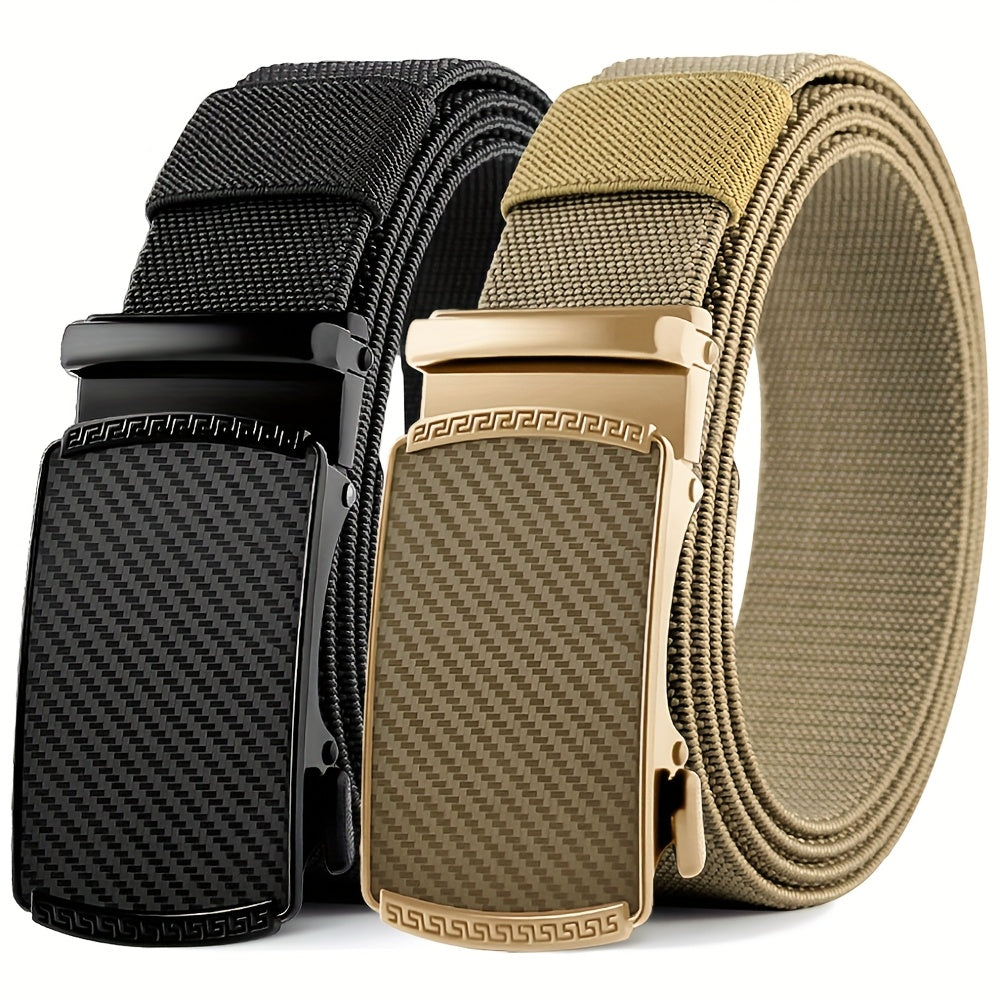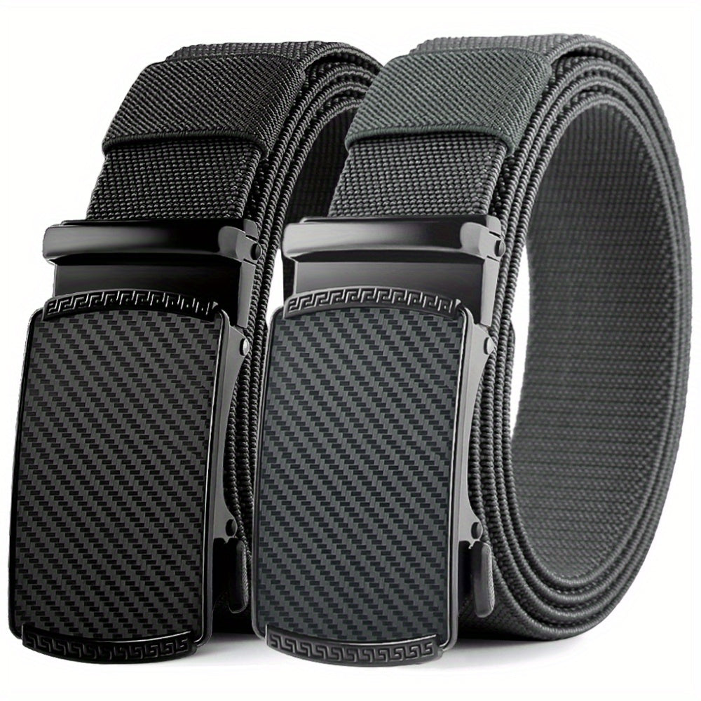 Casual to formal wear belt made of stretch elastic nylon with alloy buckle, ideal for various occasions. Durable and stylish ratchet belt for men.