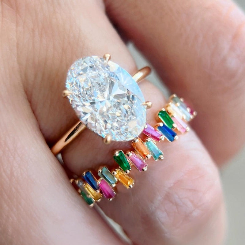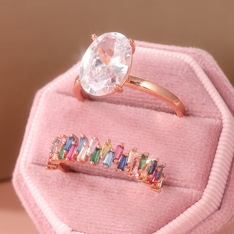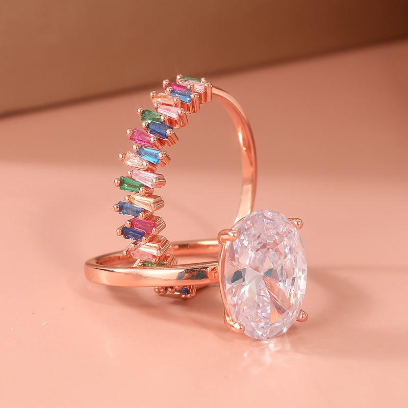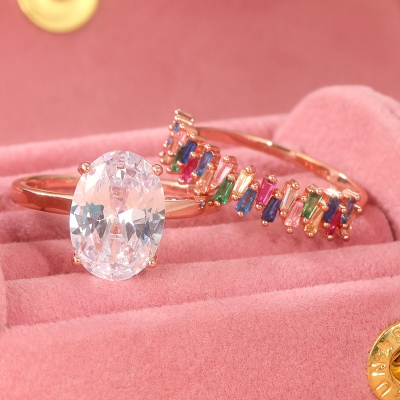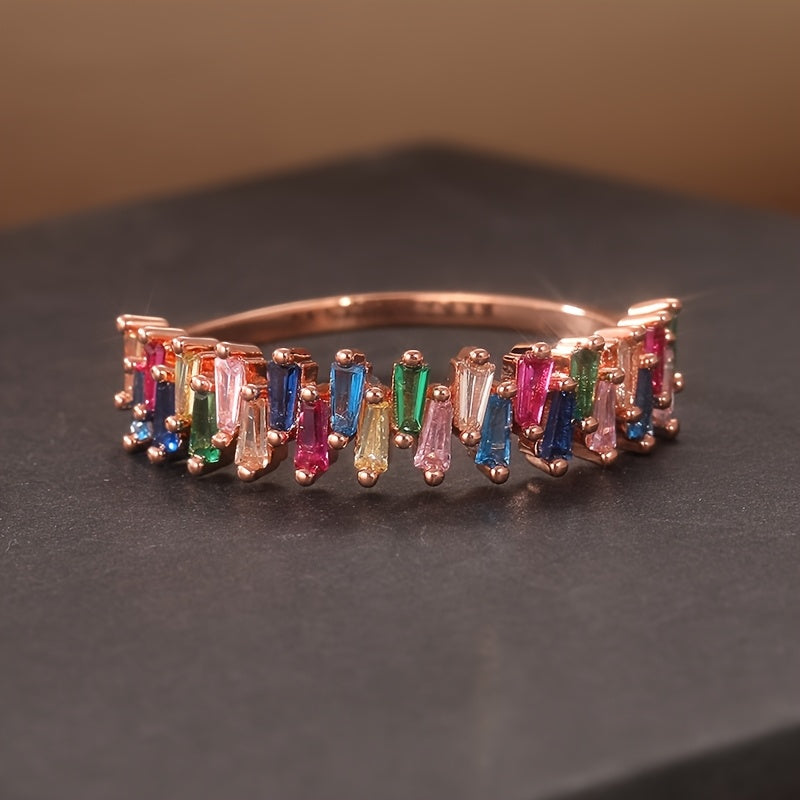 Add a touch of elegance with these stunning anniversary rings featuring vibrant rainbow synthetic zirconia stones. The KC golden plated copper bands are perfect for daily wear or as a Christmas gift.