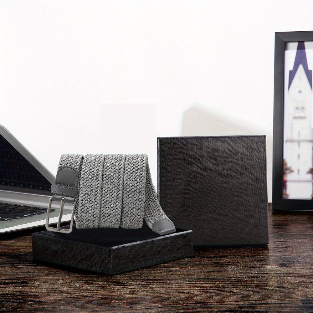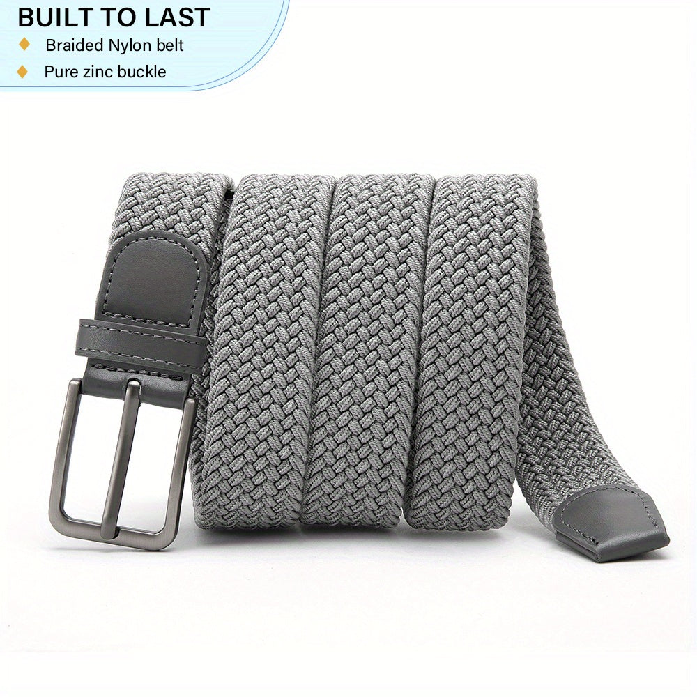 These men's braided stretch belts are made of elastic woven fabric with a width of 1 3/8 inches. They feature an alloy buckle for a secure fit and stylish look.