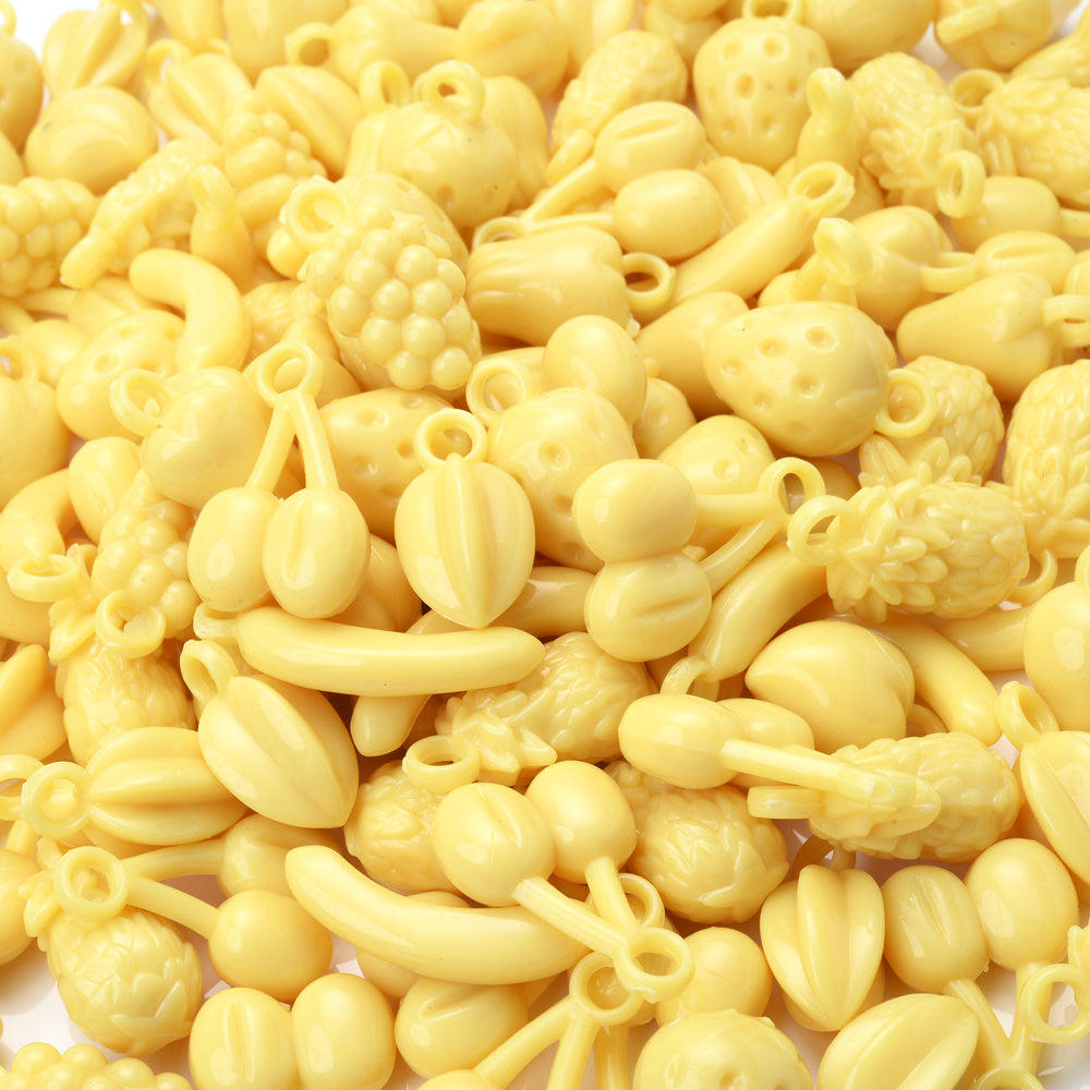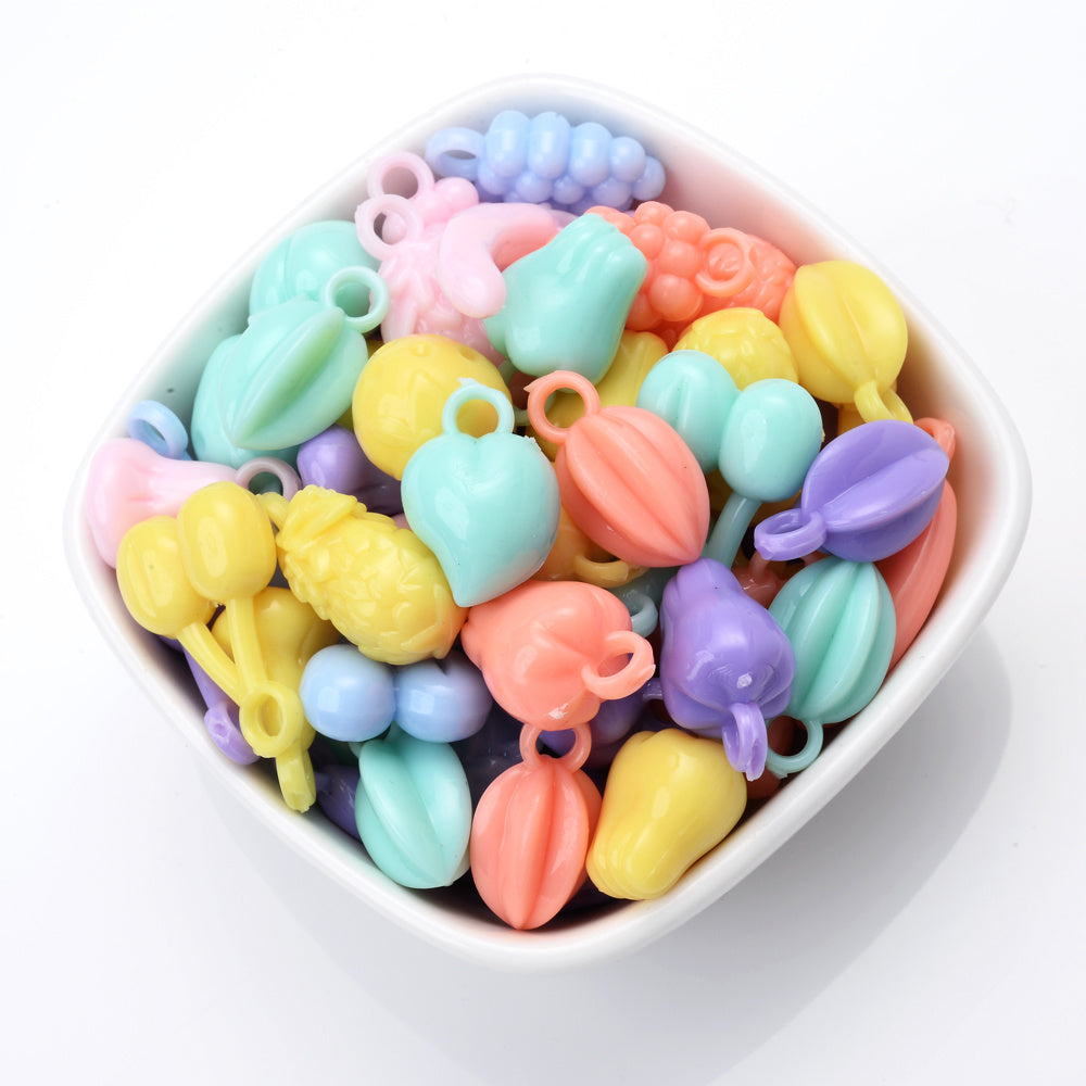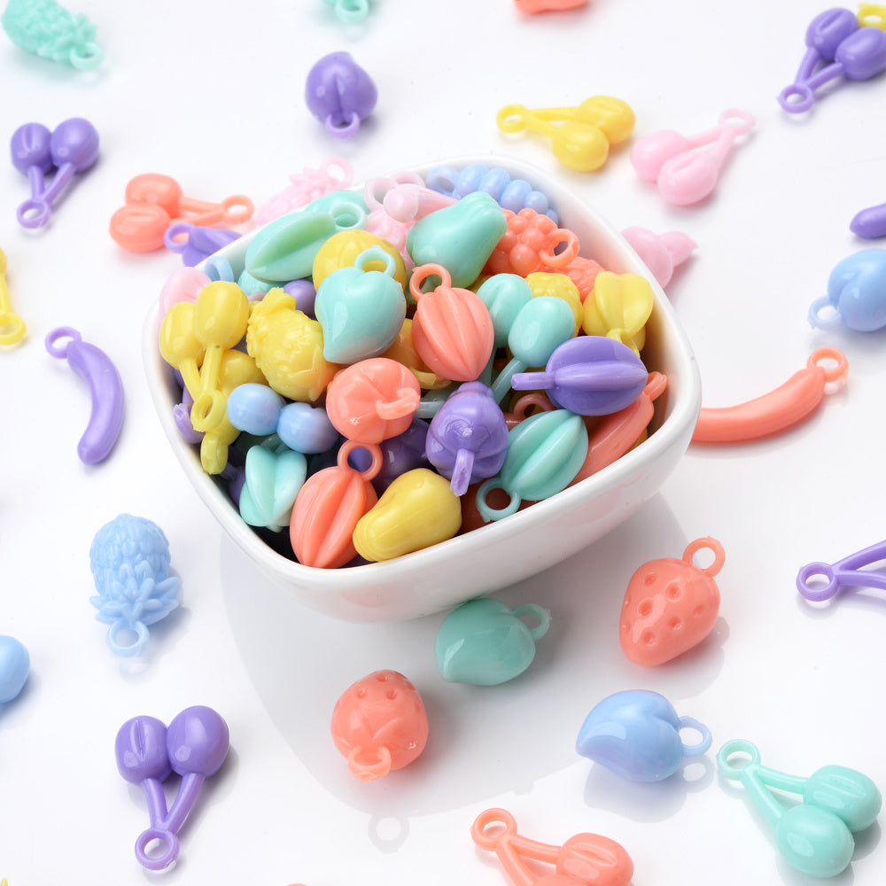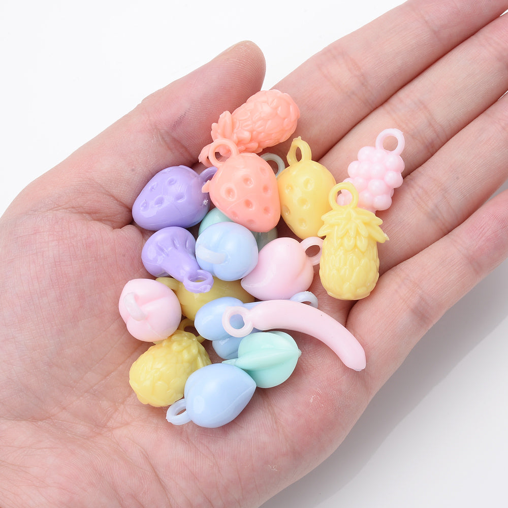 Add a touch of fruity charm to your jewelry-making projects with this set of 30 acrylic charms in assorted fruit shapes. Create fun and colorful necklaces and bracelets with cherry, pineapple, peach, banana, and grape pendants.