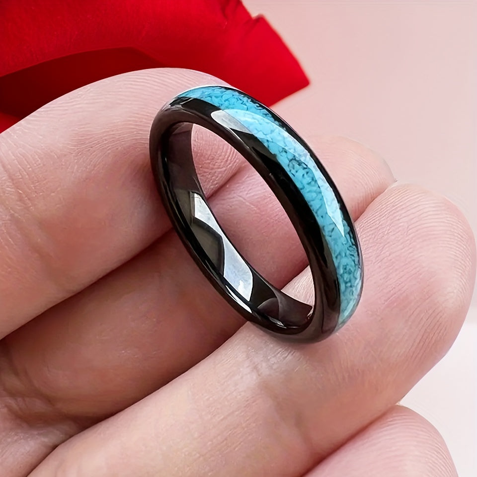 This stunning ring features crushed turquoise inlay set in a domed Tungsten band, perfect for both engagement and wedding occasions.