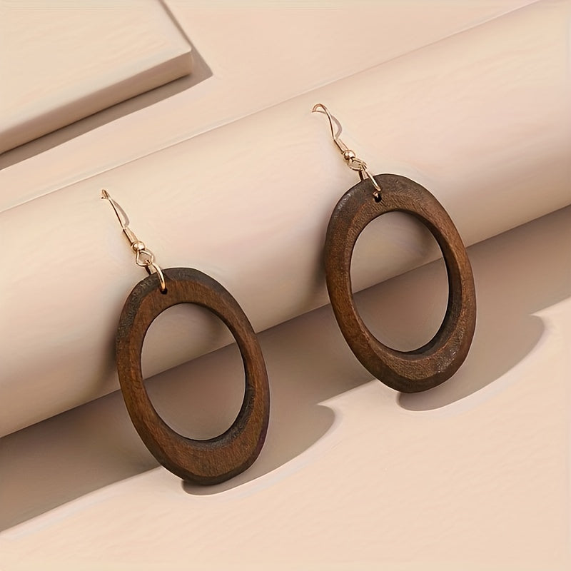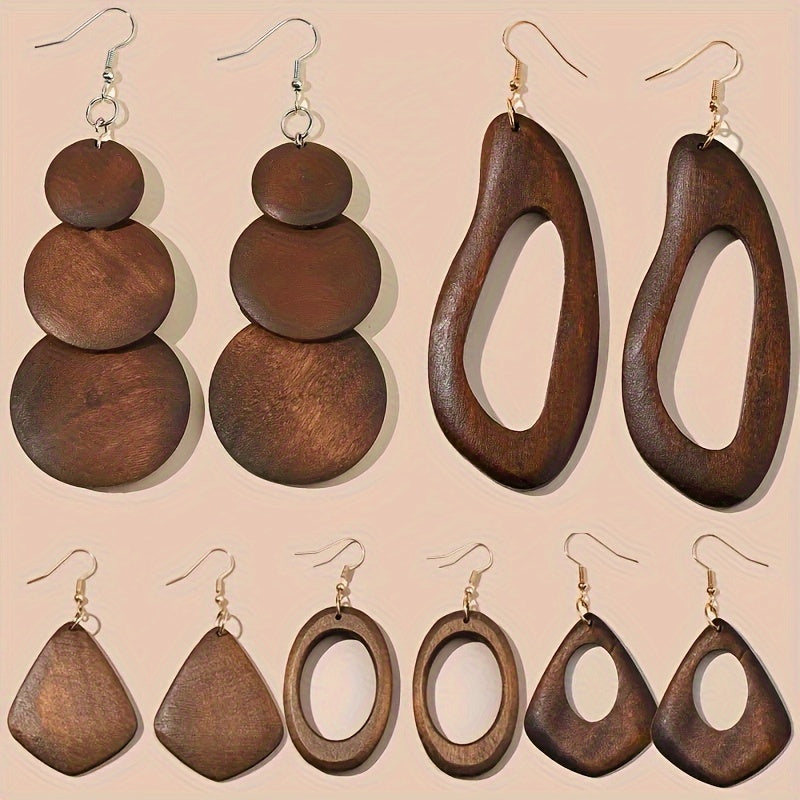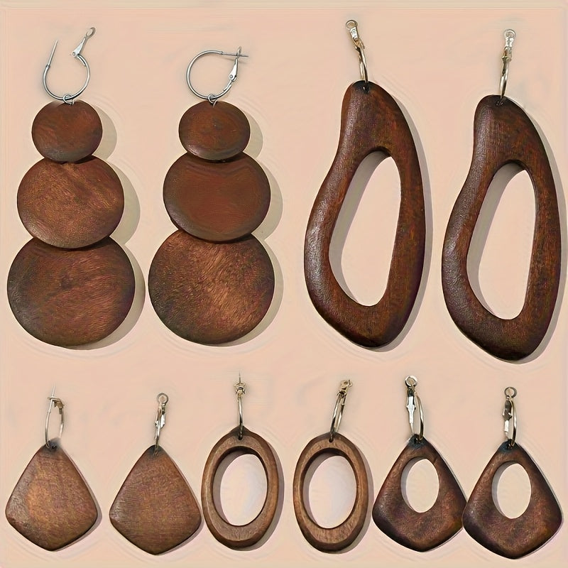 Enhance your style with this set of 5 vintage-inspired brown dangle earrings crafted from solid wood.