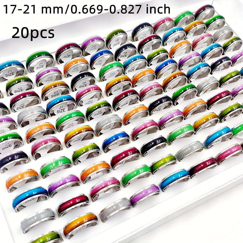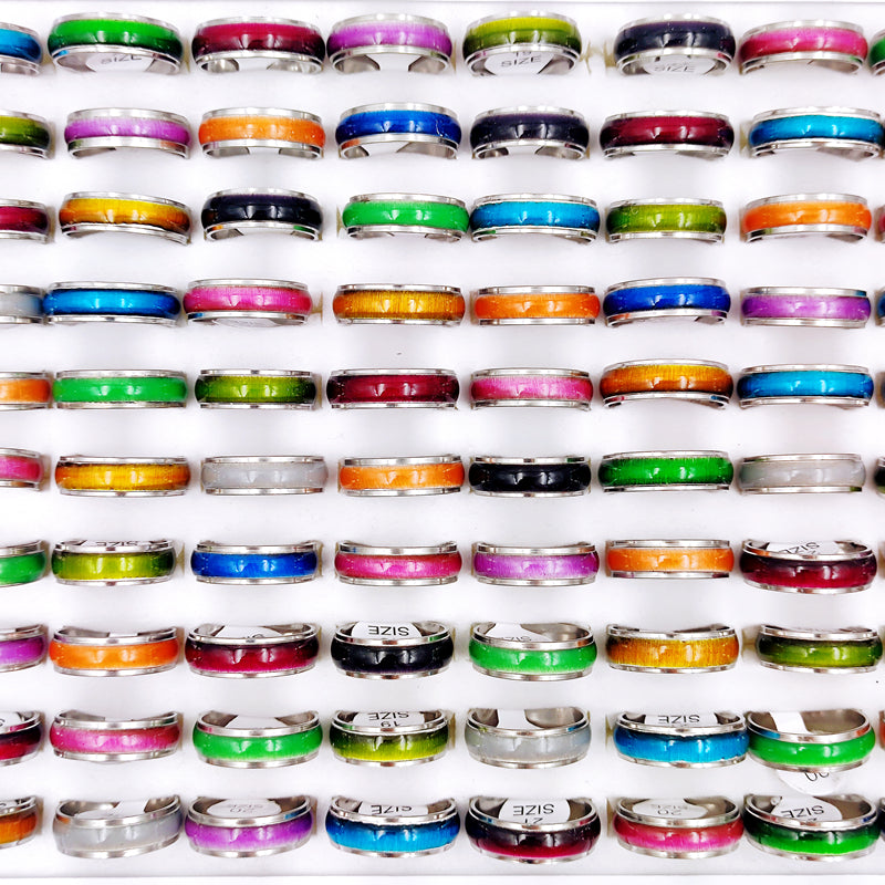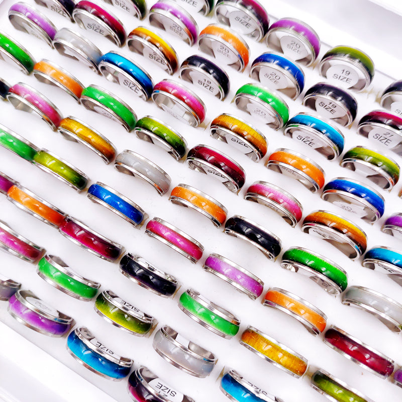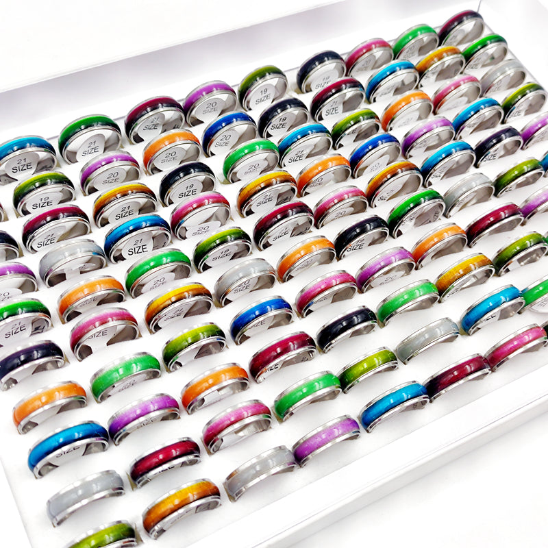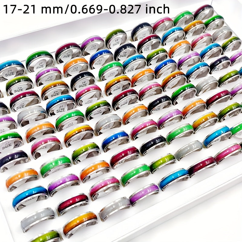 Enhance your style with this lot of 50 stainless steel rings in various colorful designs. Perfect as a gift or accessory.