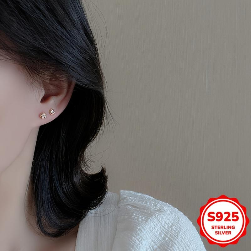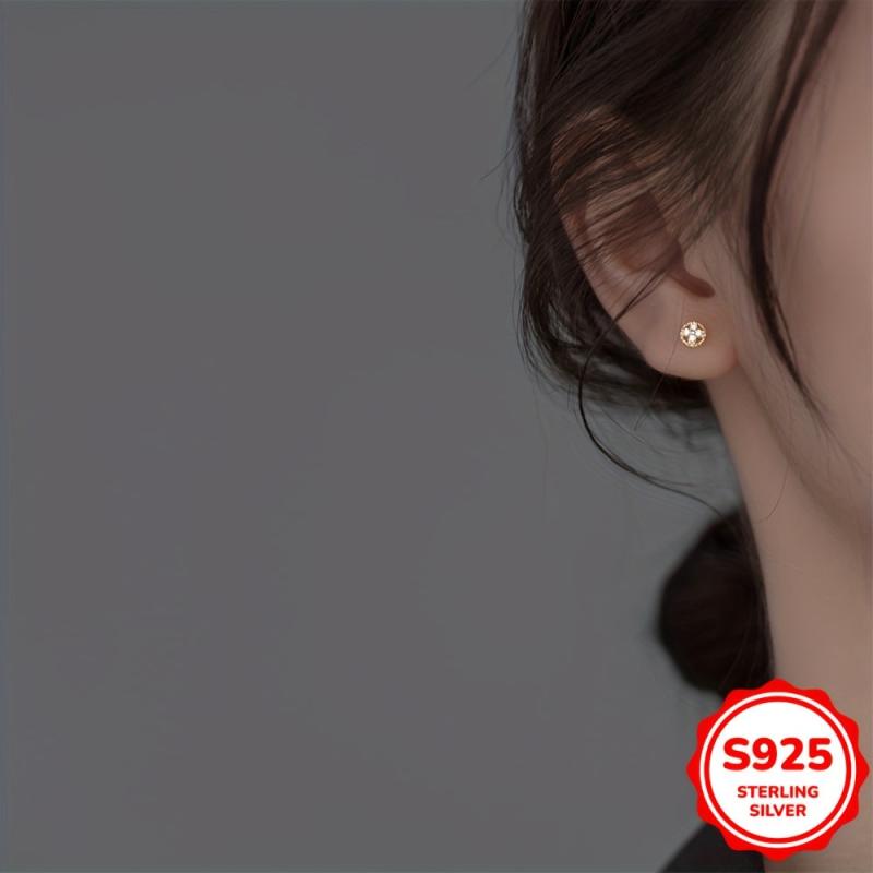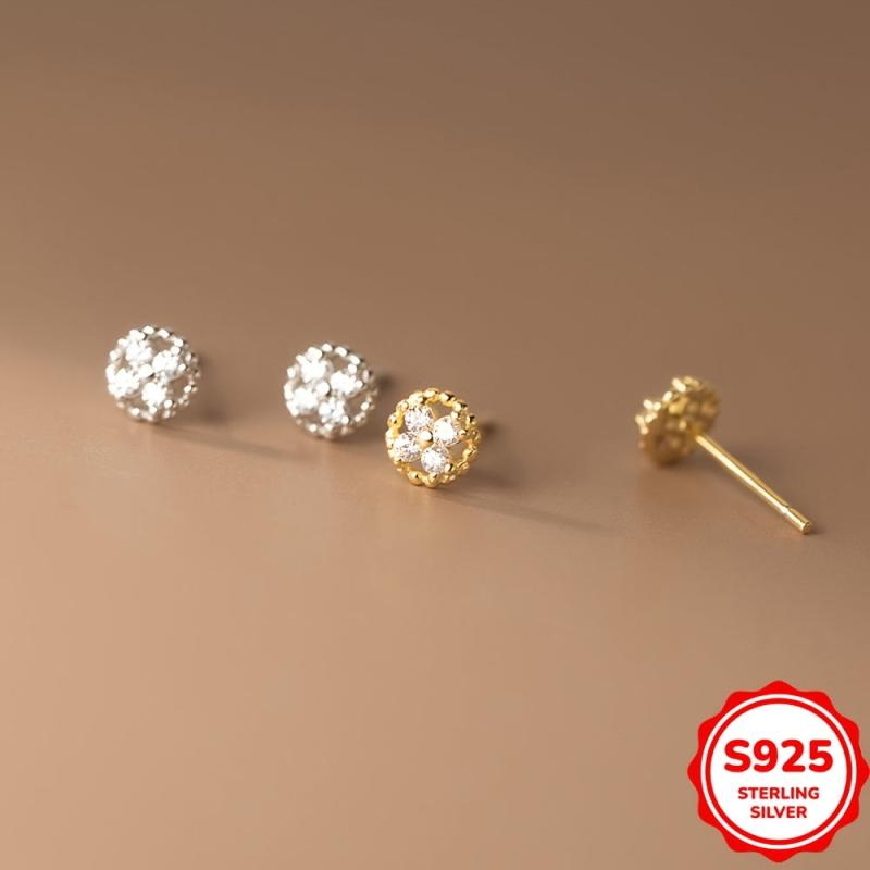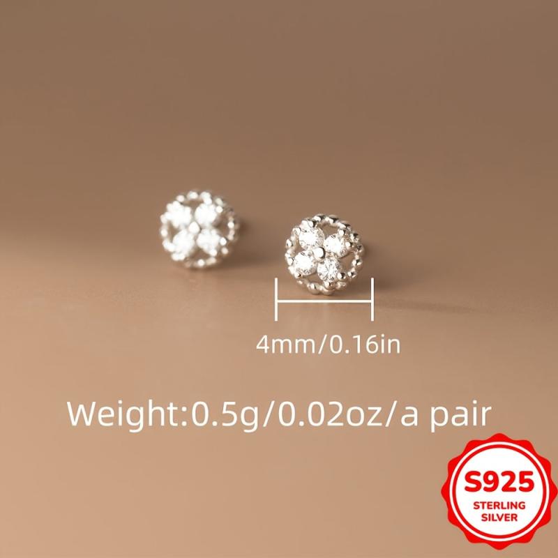 Elegant and delicate S925 sterling silver earrings with zircon inlay, featuring a tiny flower shape design. These hollow round four petal flower earrings are perfect for adding a touch of sparkle to any outfit.
