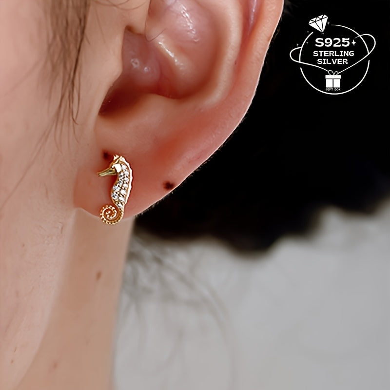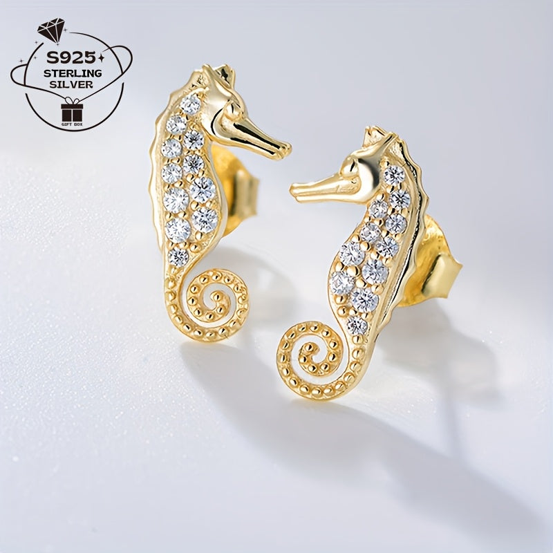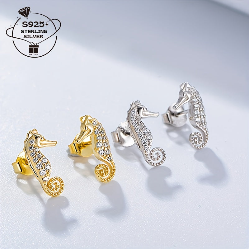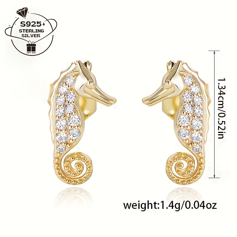 These elegant earrings are made of 925 sterling silver and feature micro inlaid synthetic zirconia seahorses. They are lightweight and perfect for any occasion.