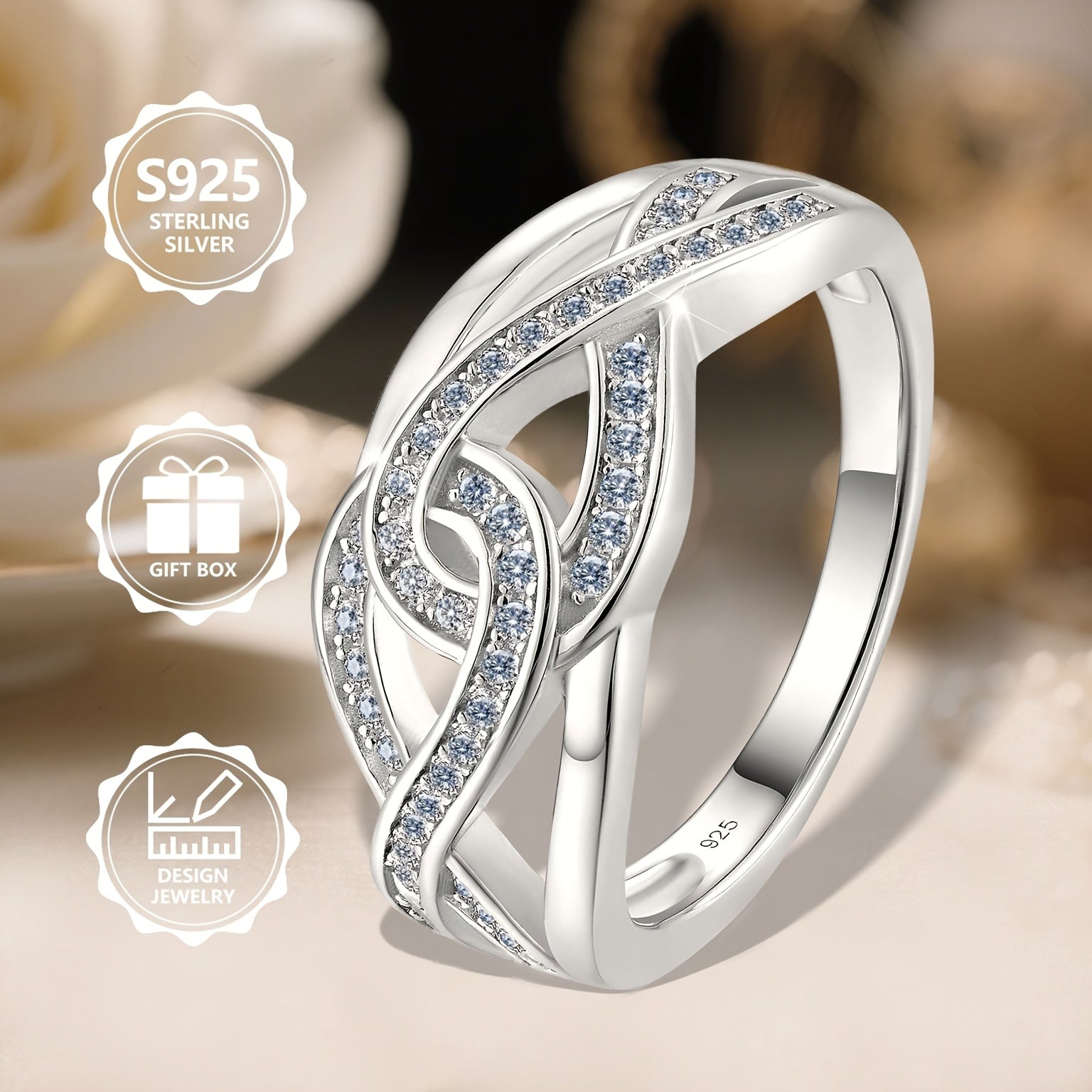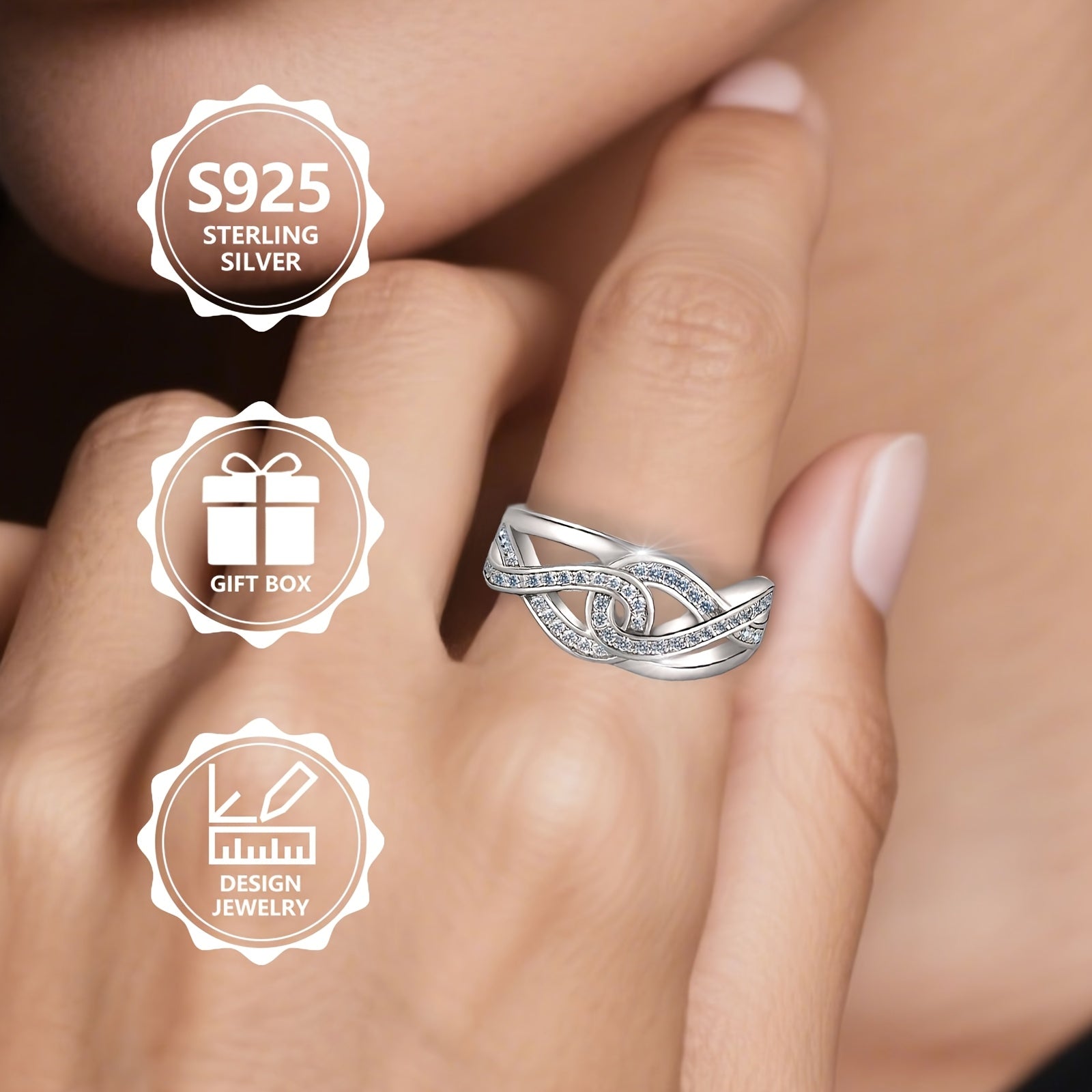 This elegant ring is crafted from 925 sterling silver, featuring a twisted infinity cross design adorned with sparkling cubic zirconia. Perfect for daily wear, weddings, dates, and special occasions.