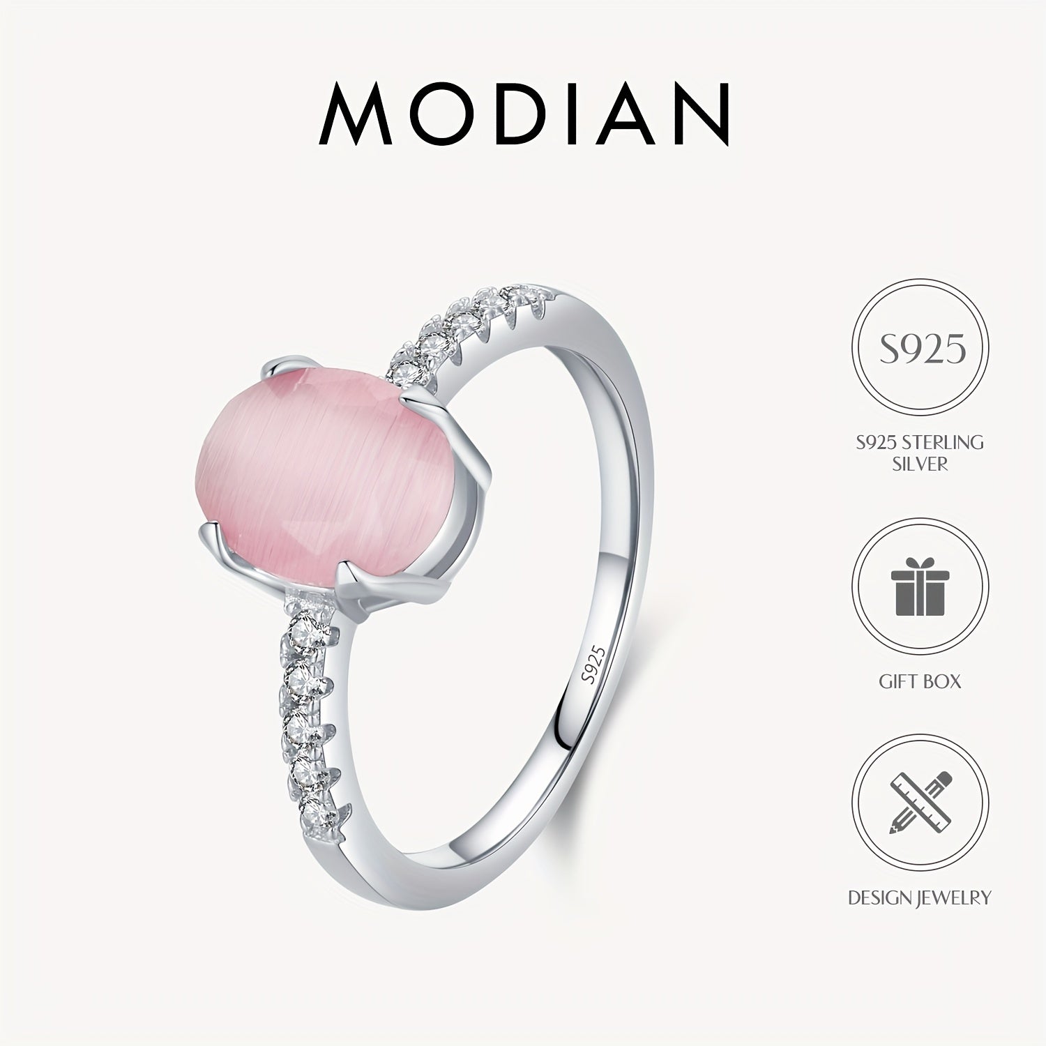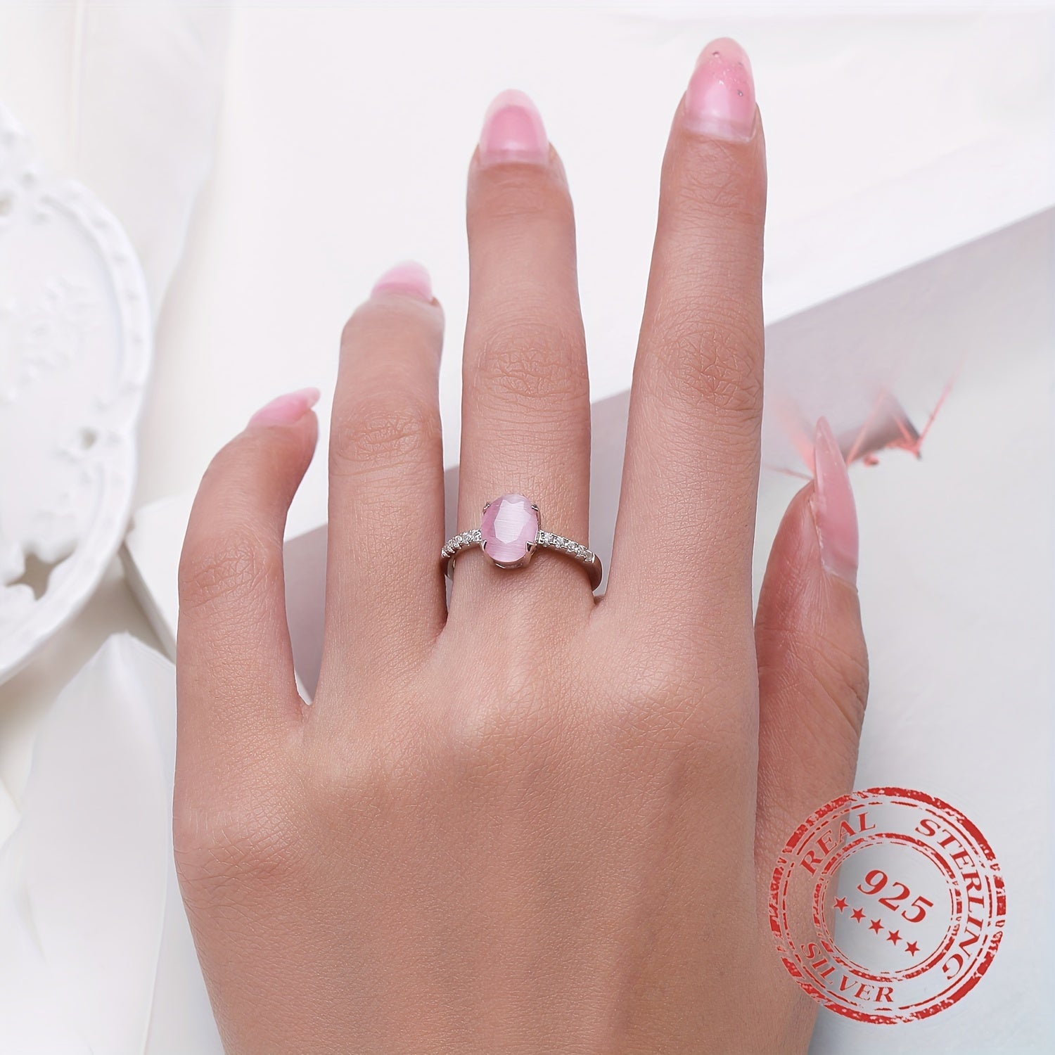 This stunning 925 sterling silver ring features an inlaid oval pink stone, perfect for adding a touch of elegance to any outfit. It's a great accessory for parties and weddings, and also makes a beautiful gift idea. Weighing 2.05g, this ring is lightweight and comfortable to wear.