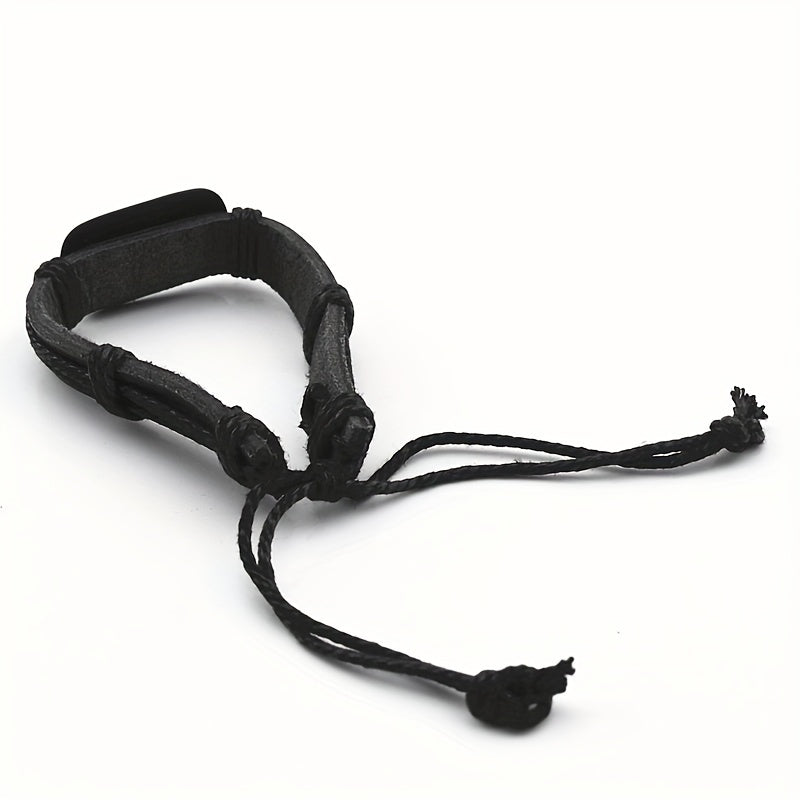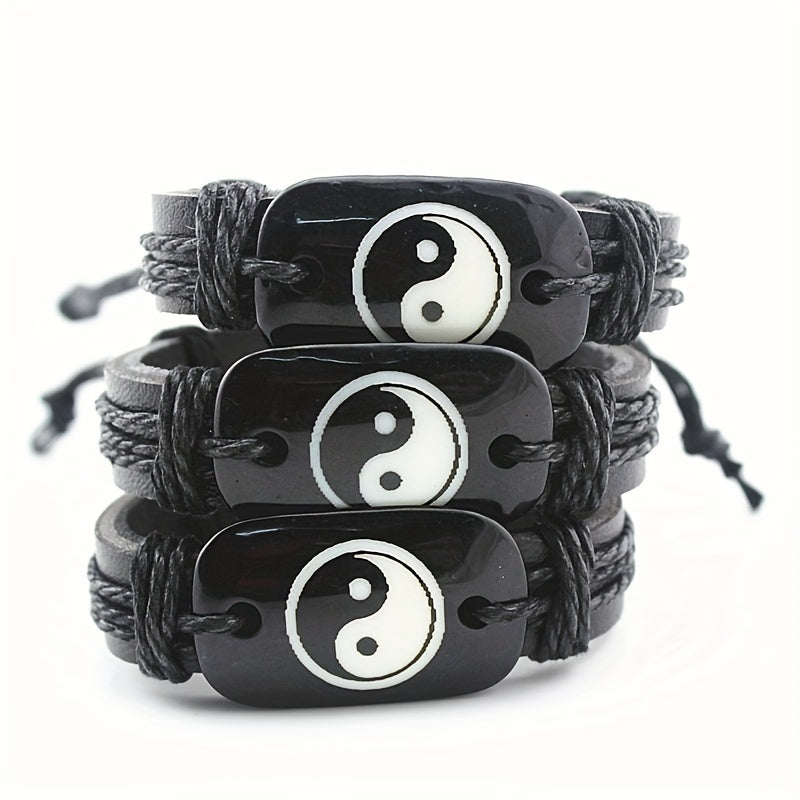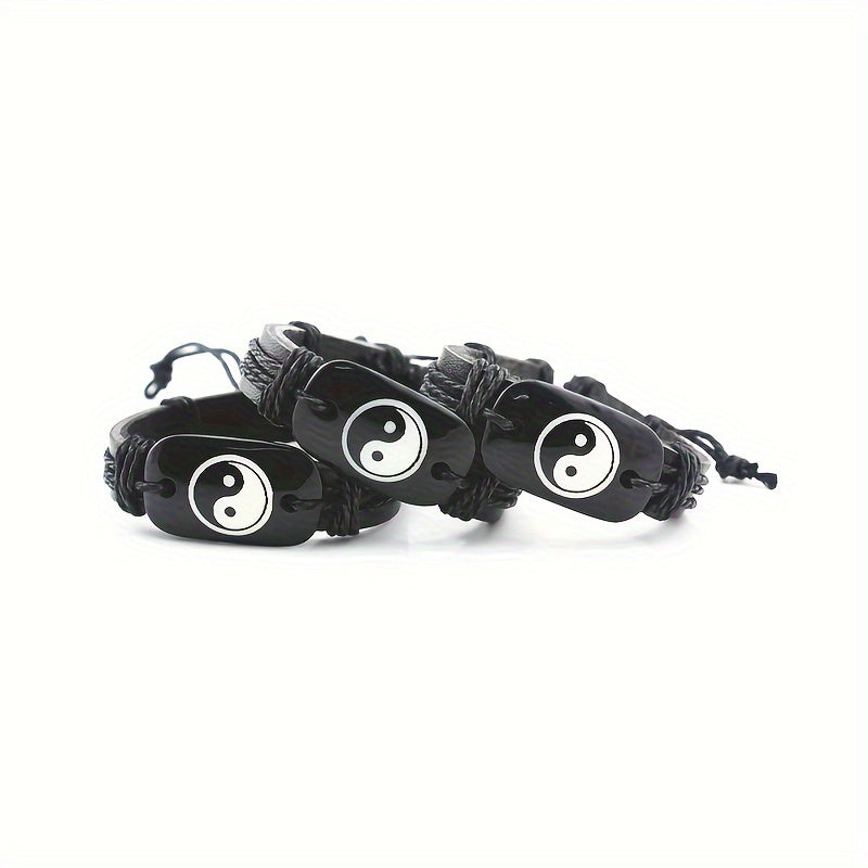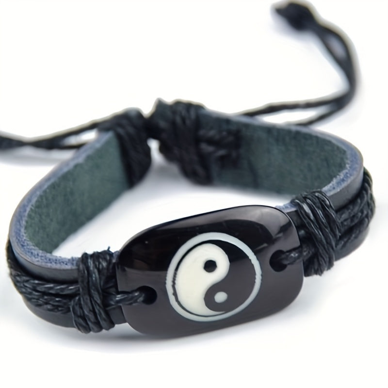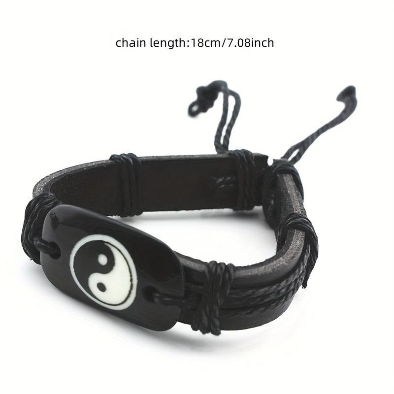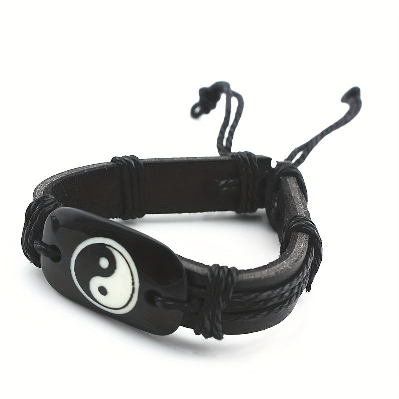 Handcrafted adjustable faux leather bracelet with Yin Yang symbol for men. Vintage-inspired design suitable for any wrist size.