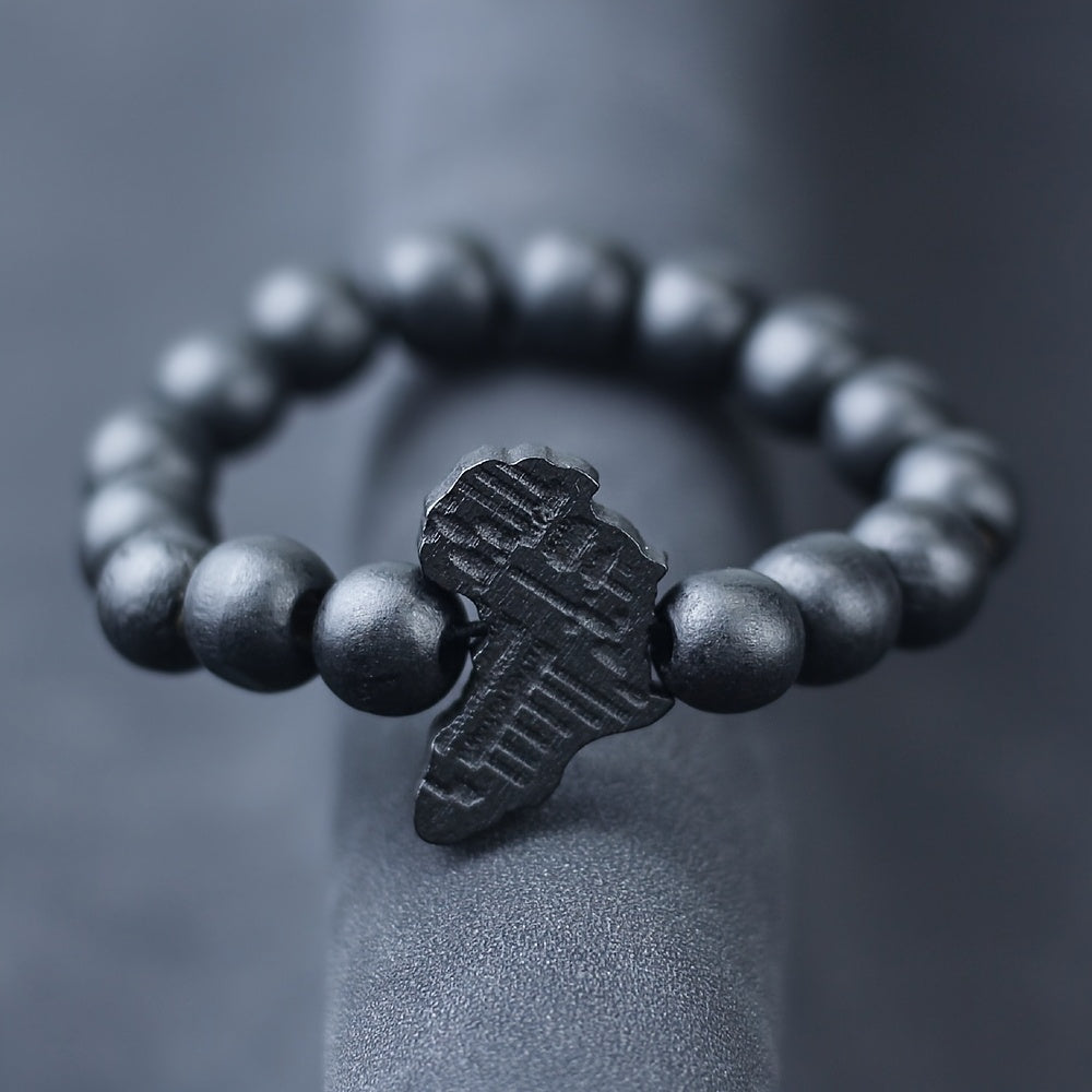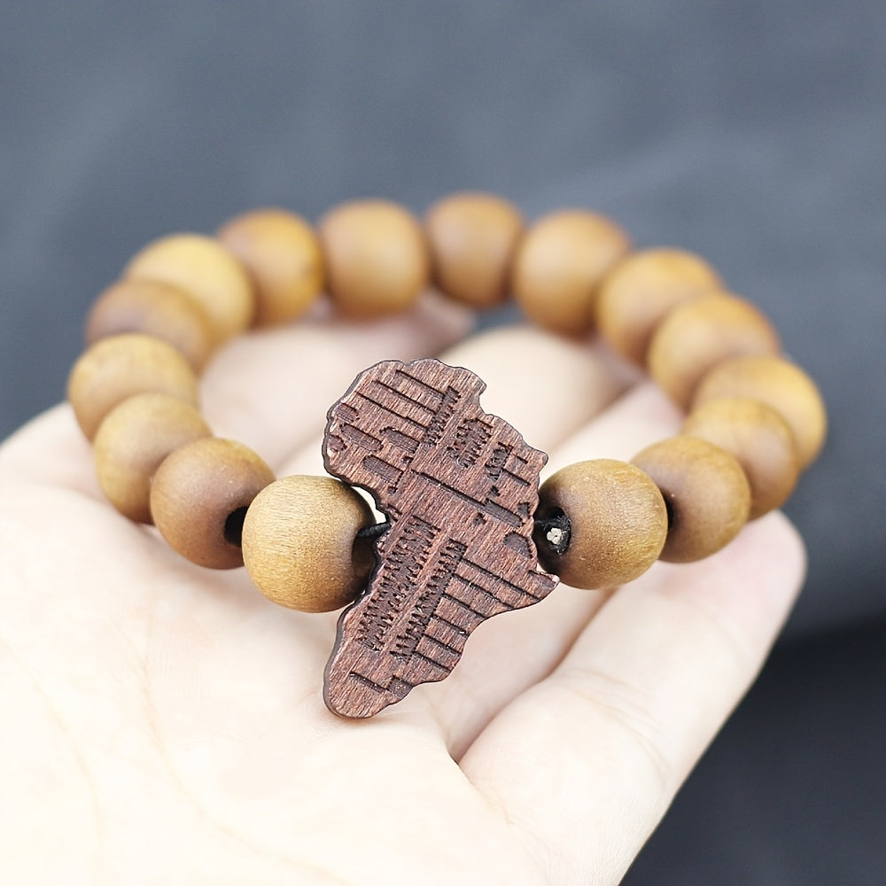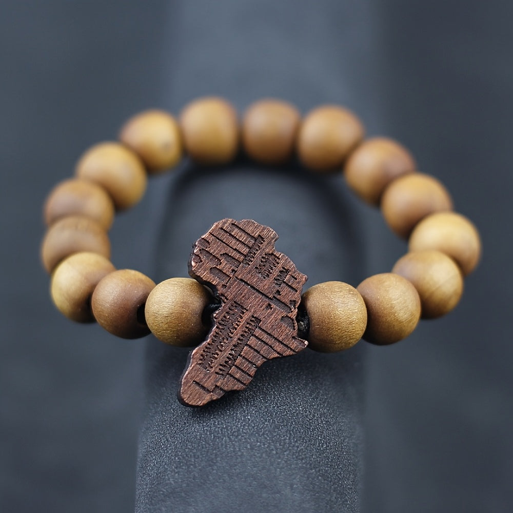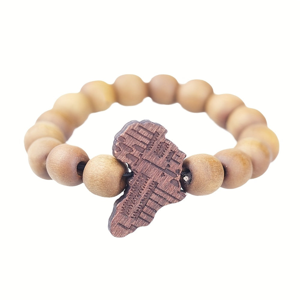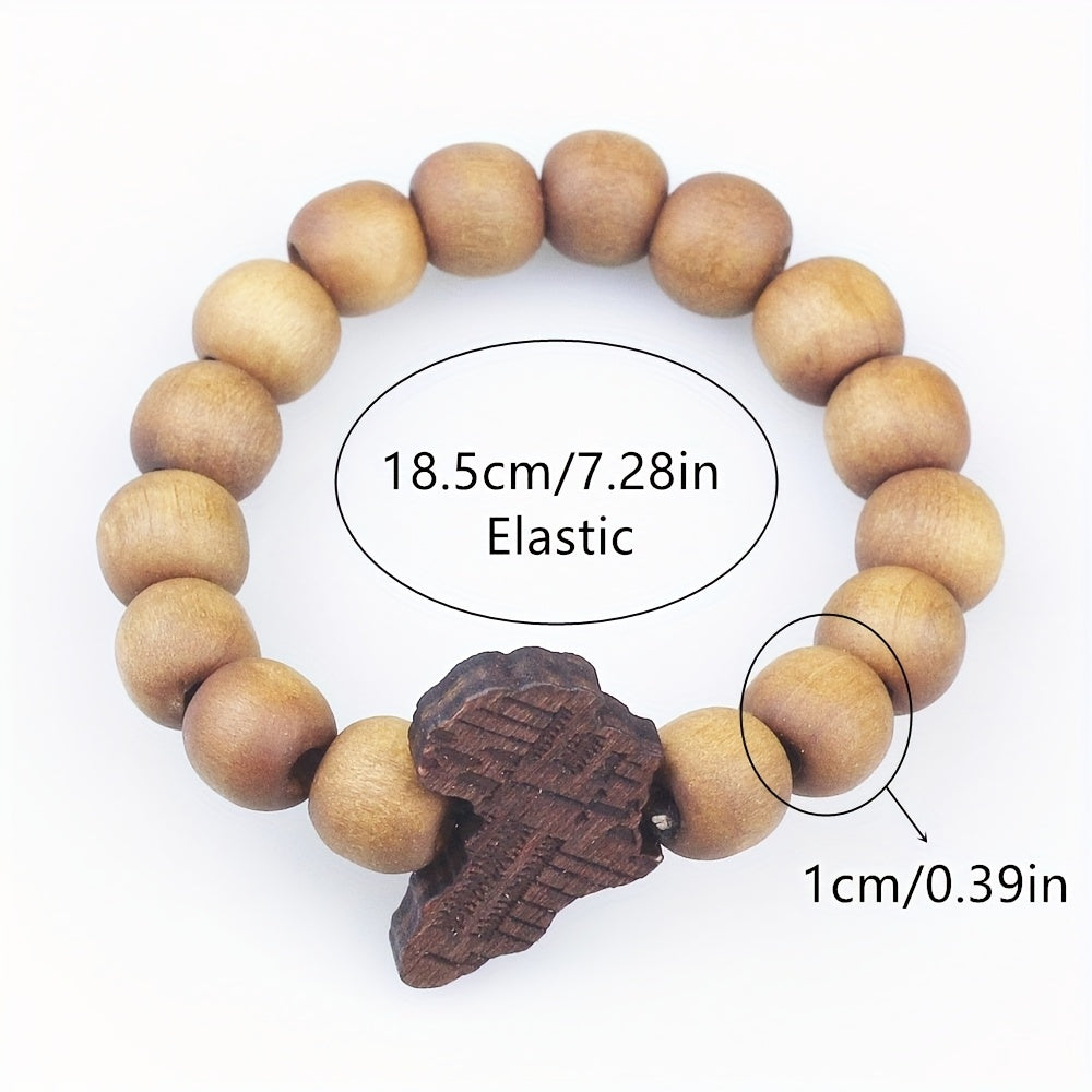 Brown wooden beaded bracelet featuring African map design with a tribal style, stretchy and ideal for daily wear, parties, and holidays. Adorned with an elephant pendant for added charm.