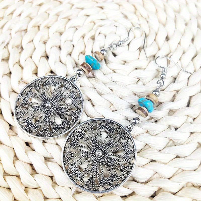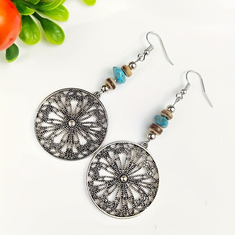 Get these stunning earrings with intricate alloy carved hollow flower design and stone pendant. Perfect for adding a touch of elegance to your outfit.
