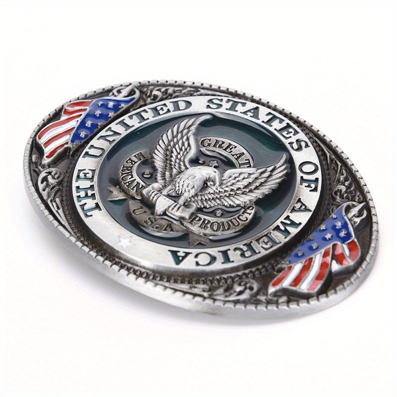 Add a touch of patriotic flair to your outfit with this high-quality alloy belt buckle. It fits 3" wide belts and features an intricate design of the American flag, perfect for showcasing your love for your country.