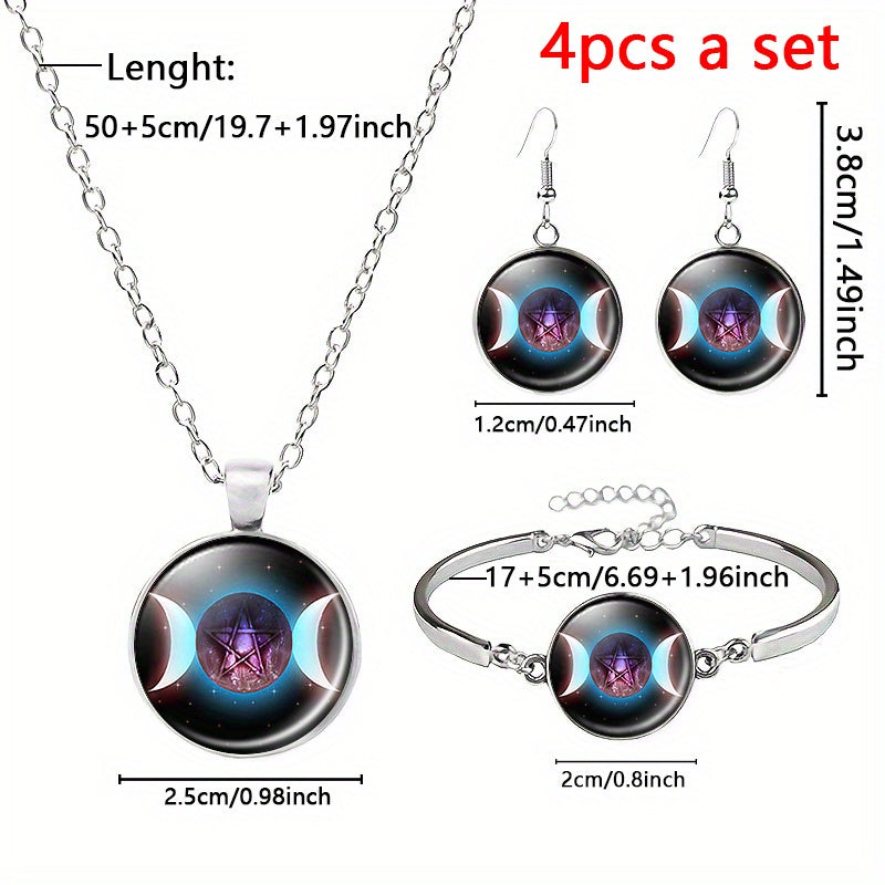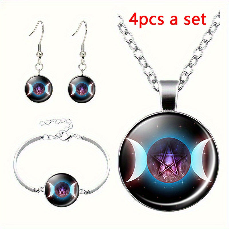 Alloy Jewelry Set Triple Moon Pentagram Pendant Necklace Bracelet Earrings