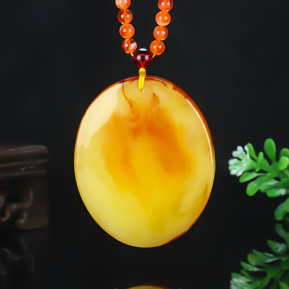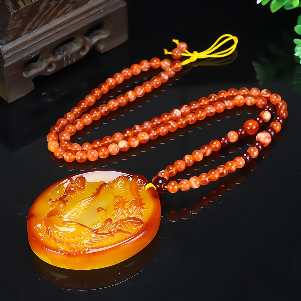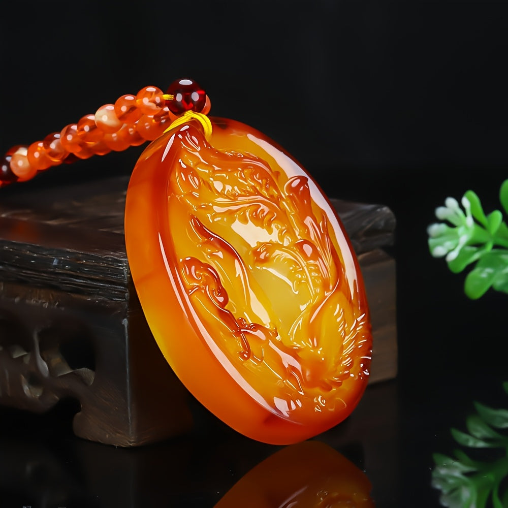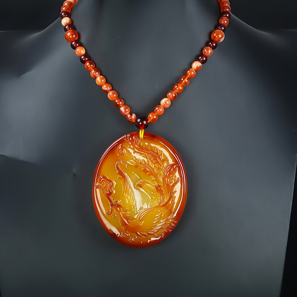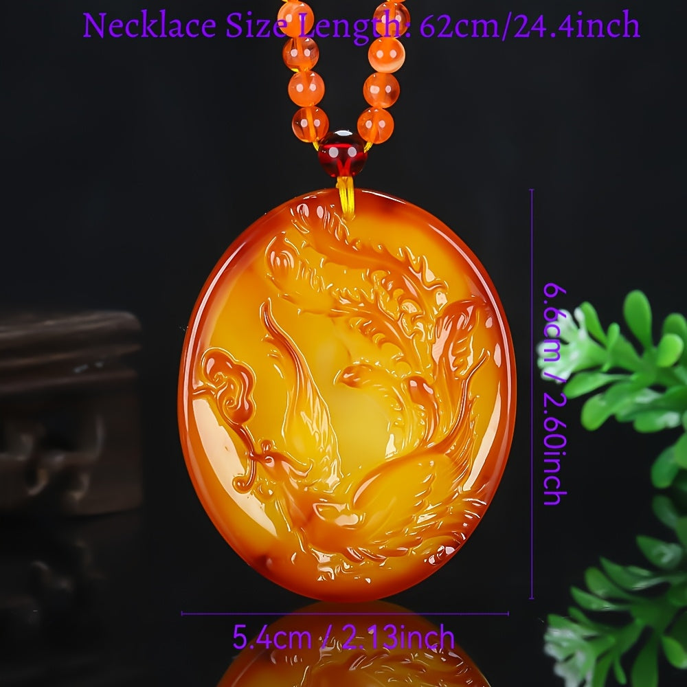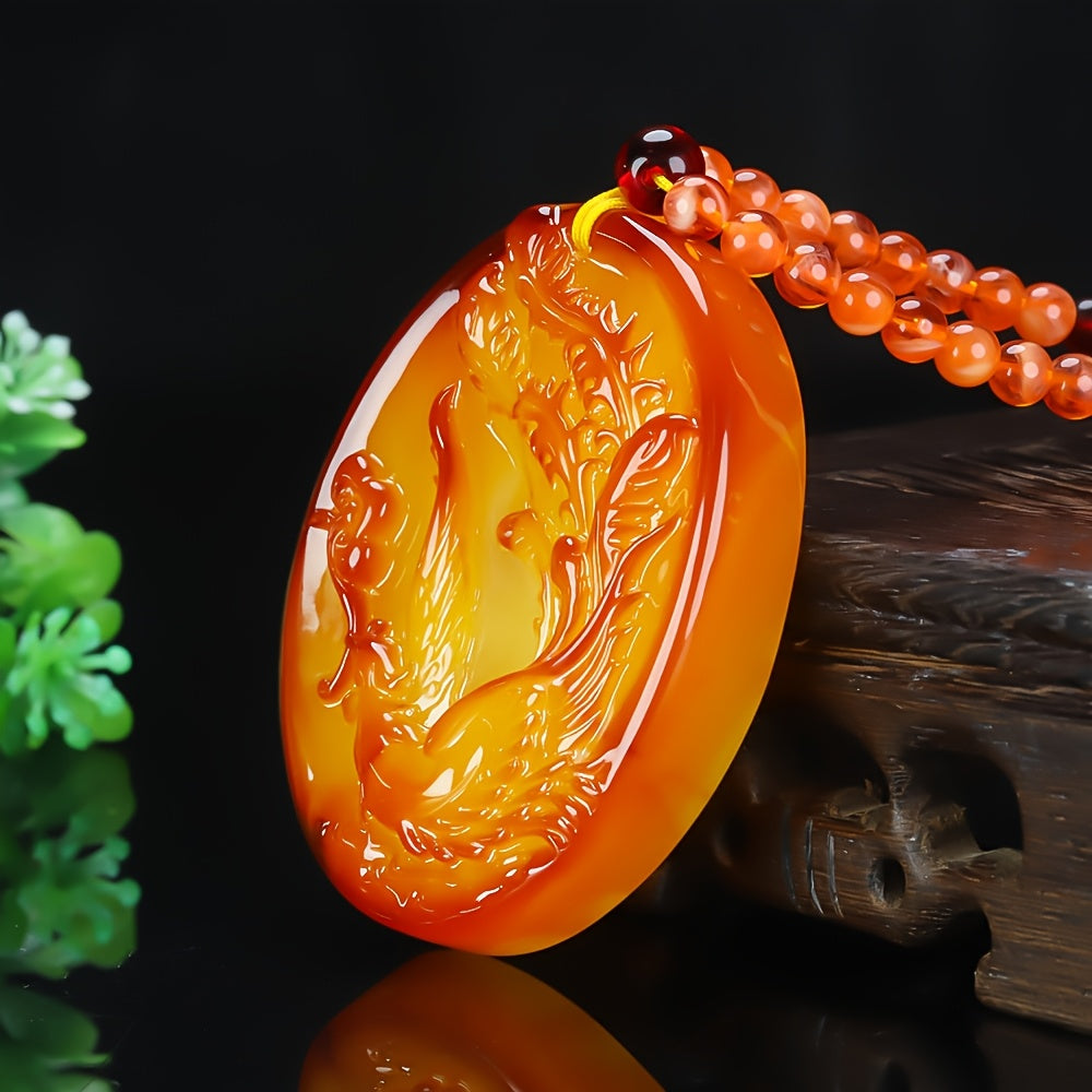 This Amber Pendant Necklace features a Phoenix pattern design for a peaceful and auspicious look.