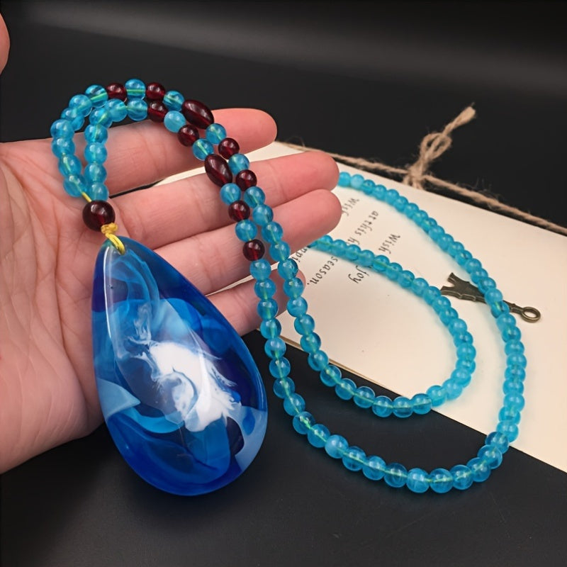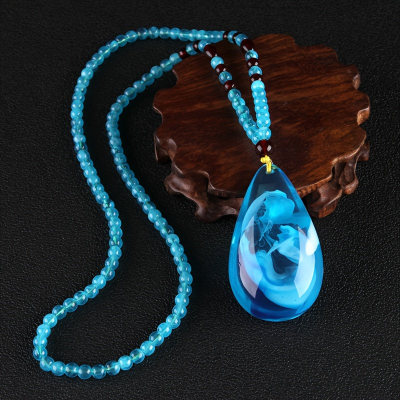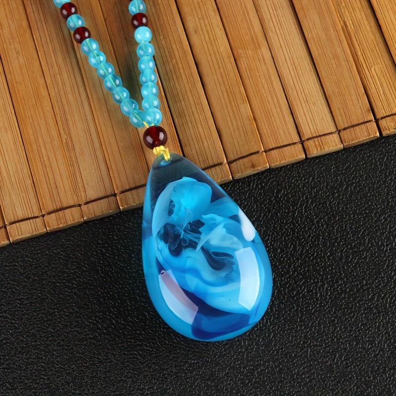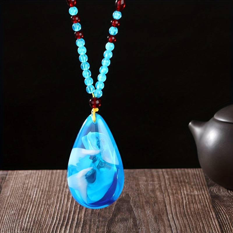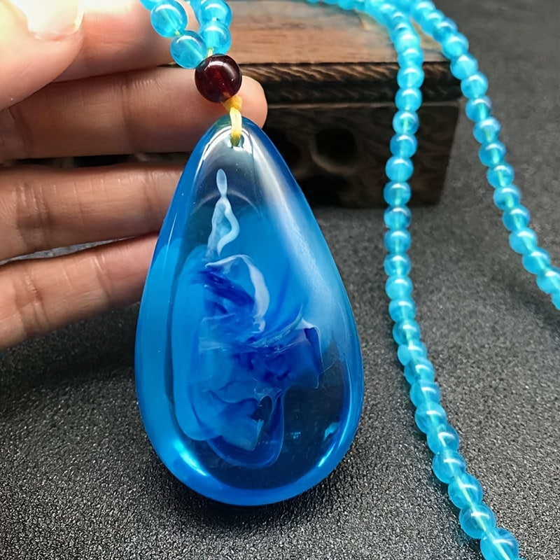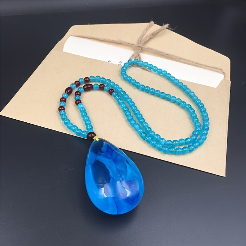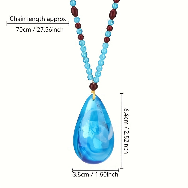 This amber transparent fossilized resin teardrop pendant necklace embodies a bohemian flair with its geometric pattern. Perfect for men and women, this fashionable accessory is ideal for daily wear.
