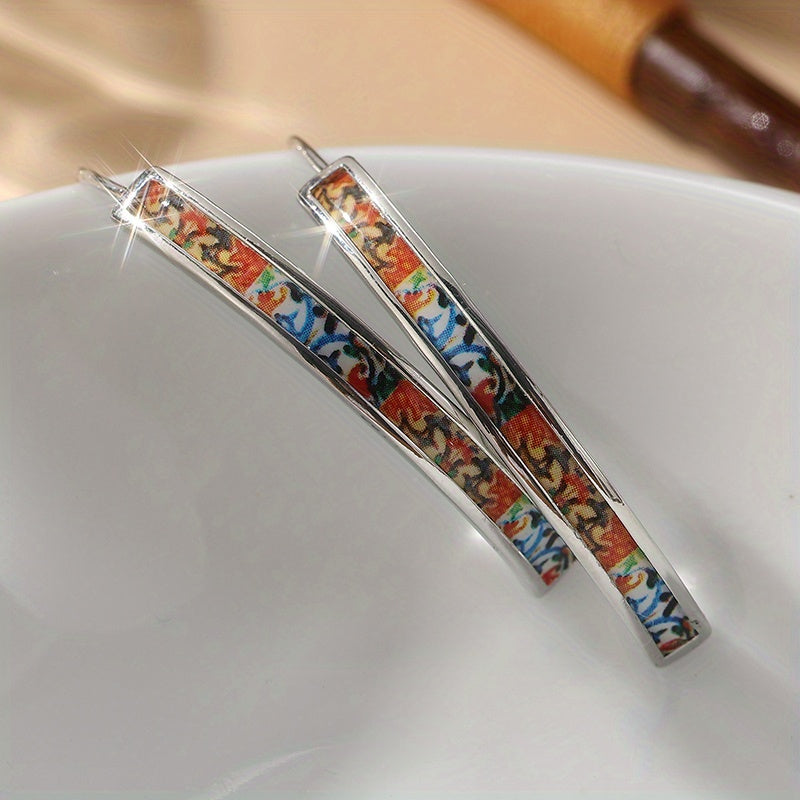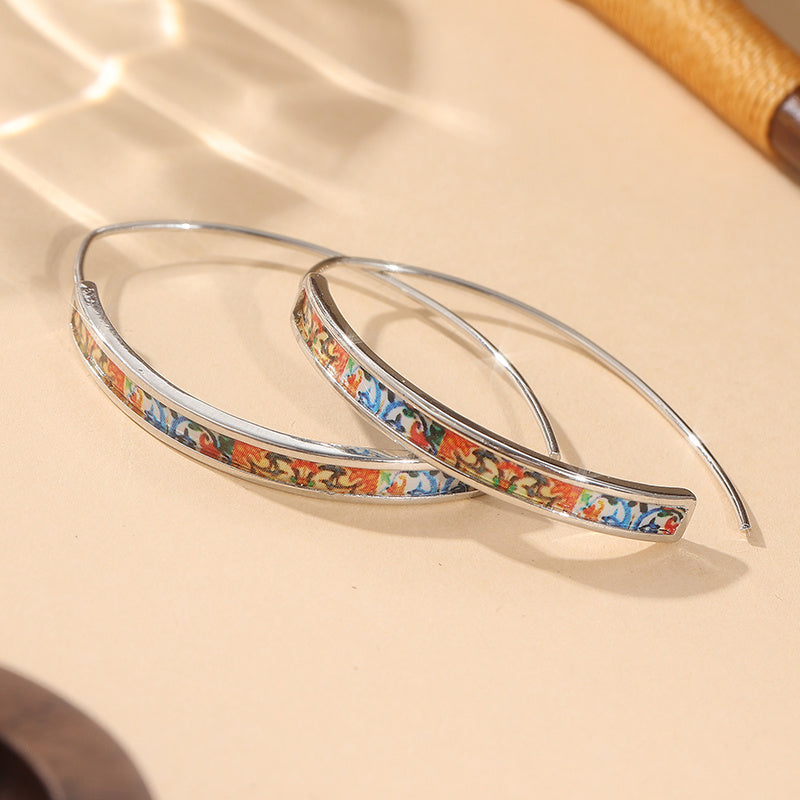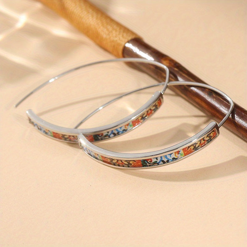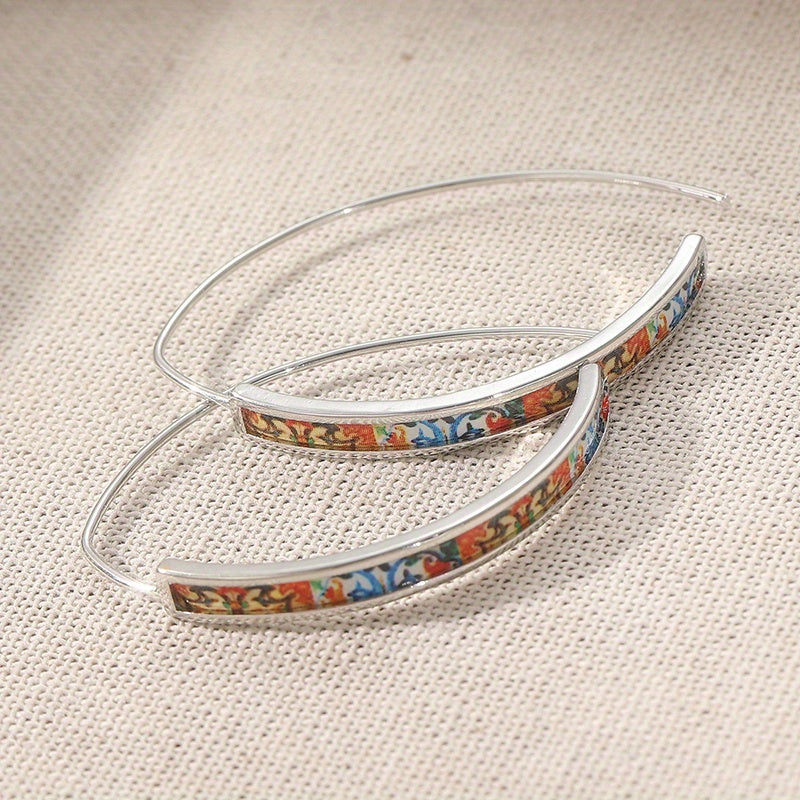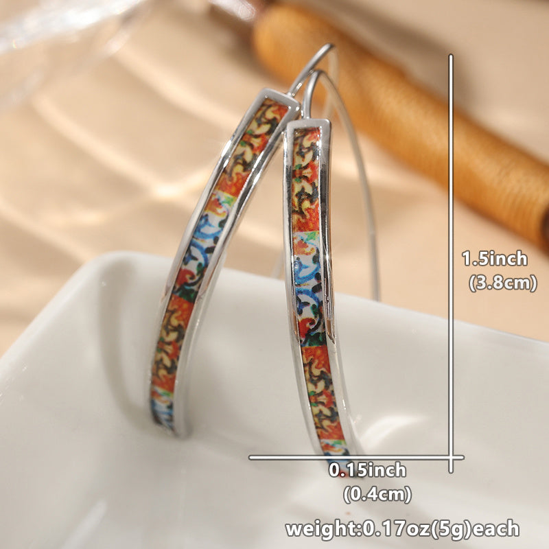 These beautiful earrings feature multicolor artwork on golden plated copper hoops. Perfect for weddings and special occasions. They come gift boxed for easy gifting.