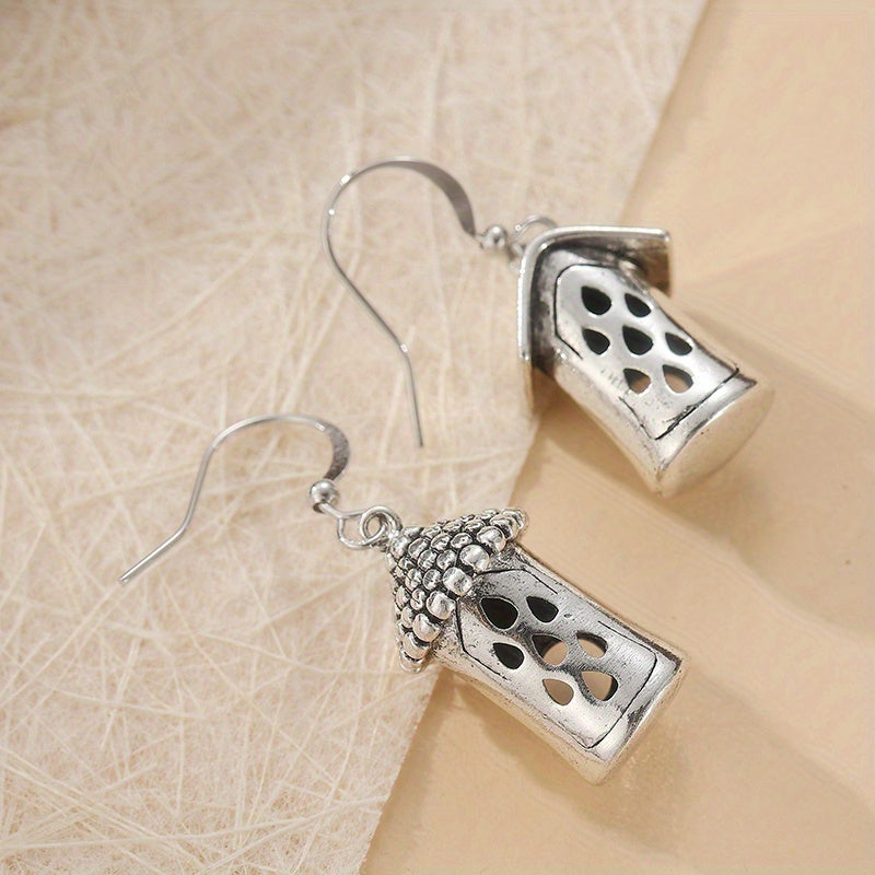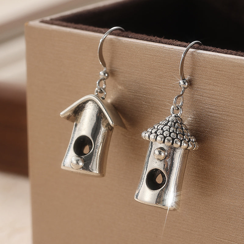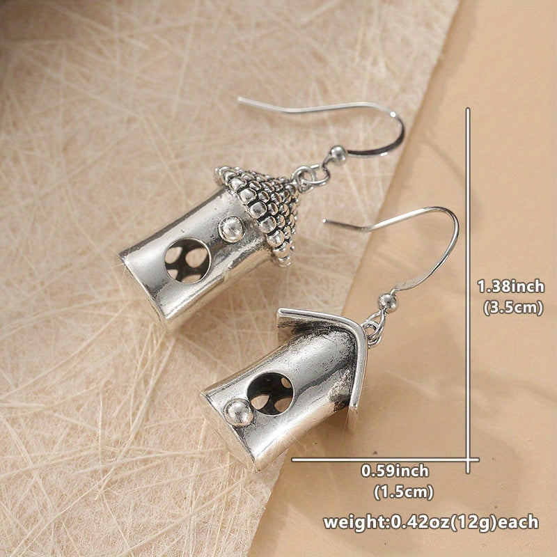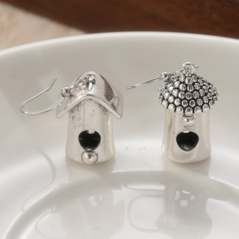 Hand-carved mini dangle earrings featuring a pair of asymmetric retro bohemian copper mushroom houses with a K plated finish. Perfect as a Christmas gift or everyday jewelry accessory.