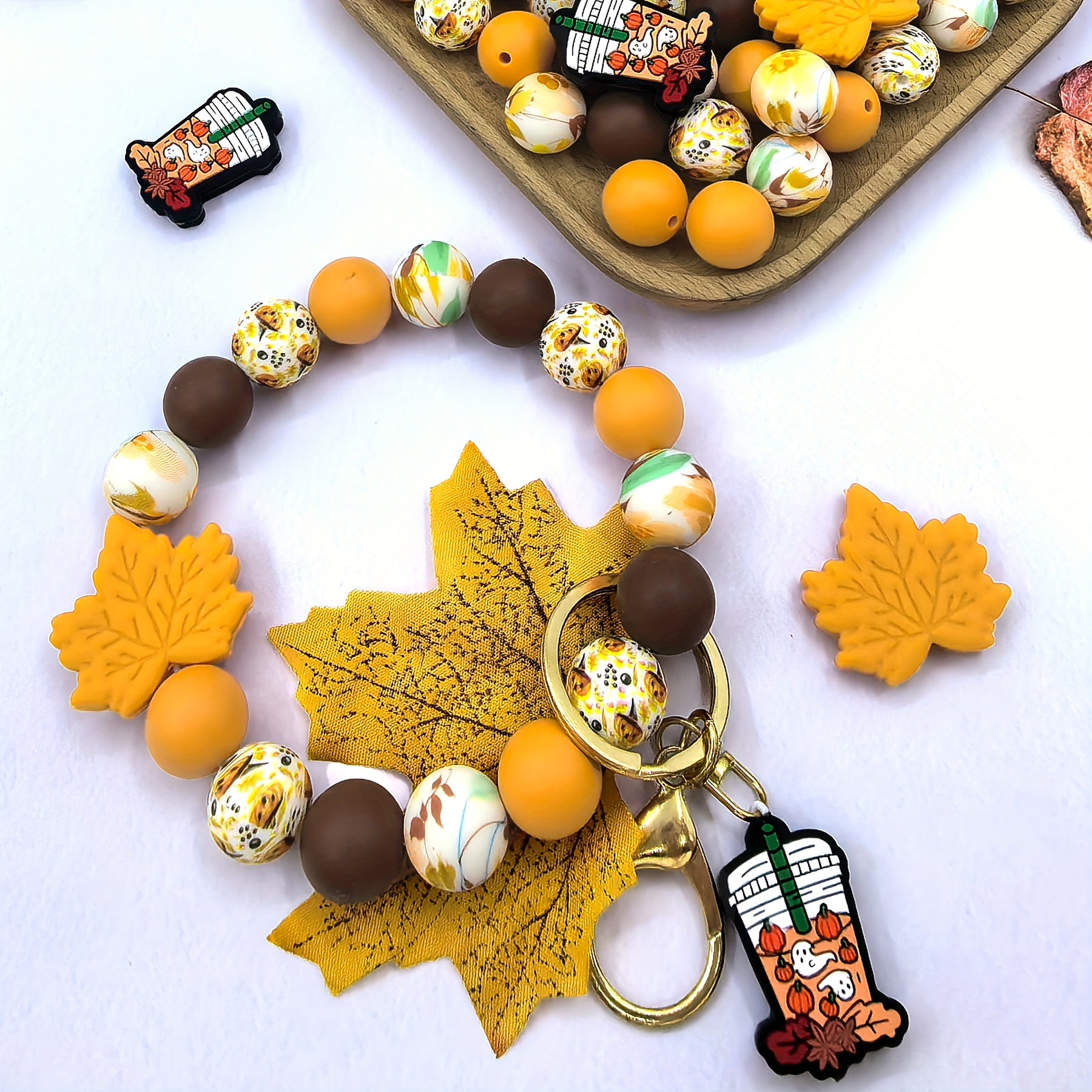 This silicone bead set includes scattered beads with autumn maple leaf and ghost maple leaf elements, perfect for fall-themed jewelry making. Also includes round beads.