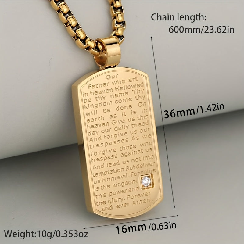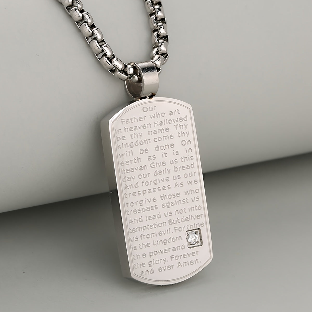 Vintage military style dog tag pendant necklace with CZ stones, featuring a Bible verse. Made of durable stainless steel.