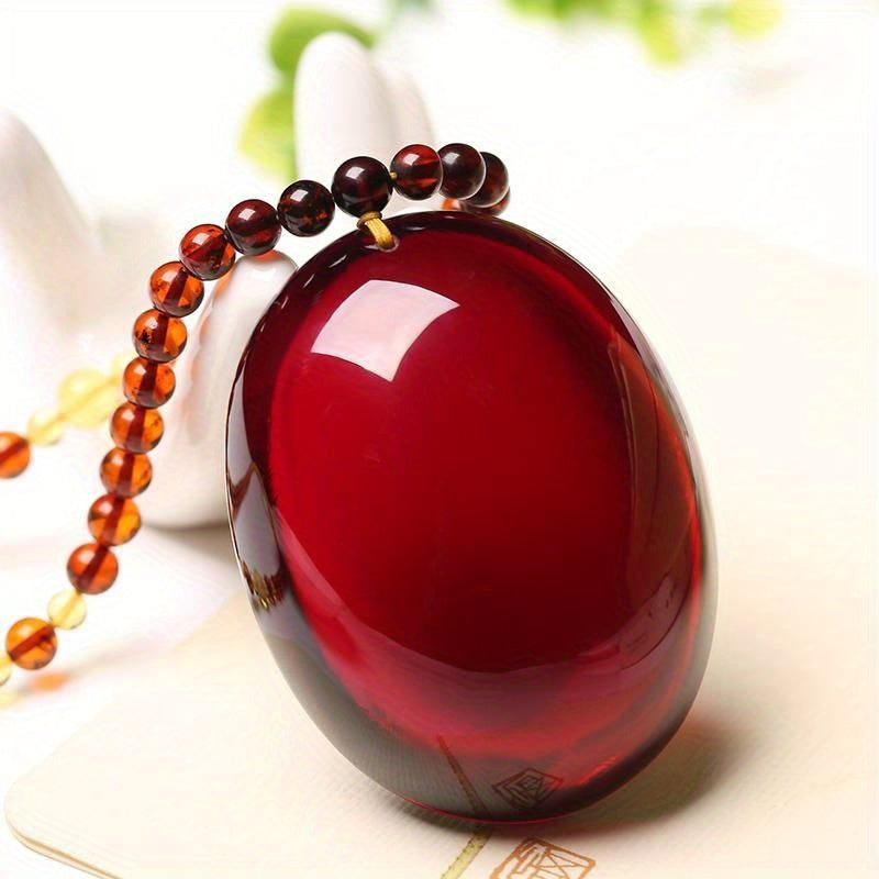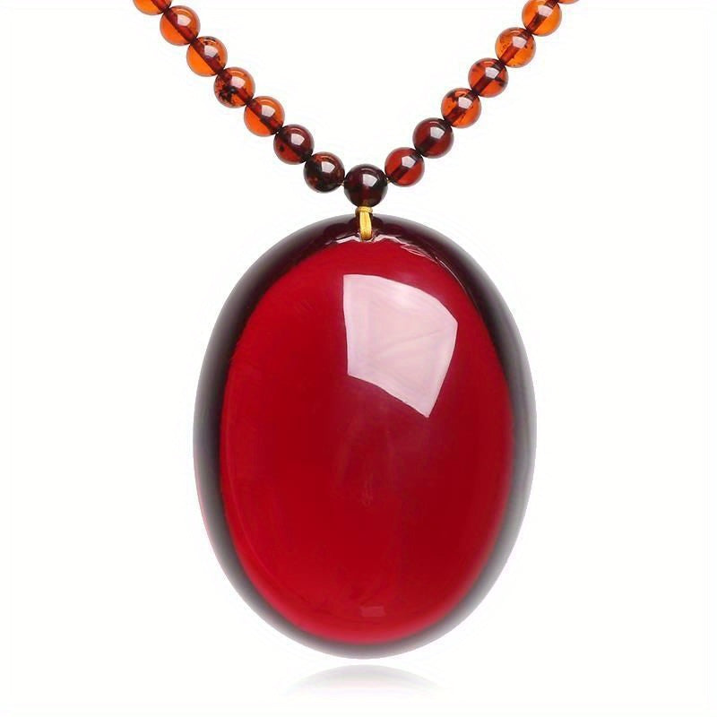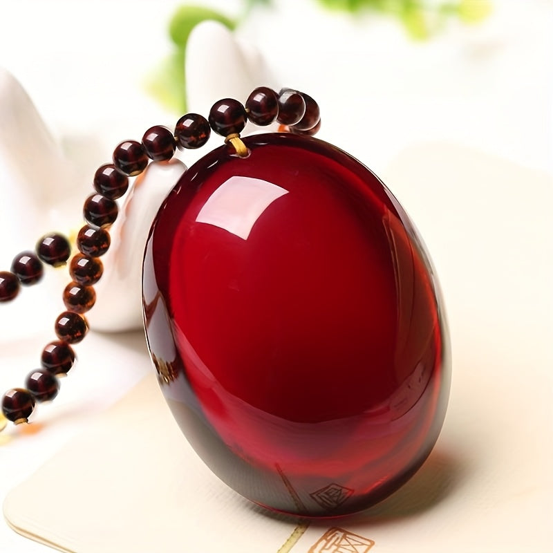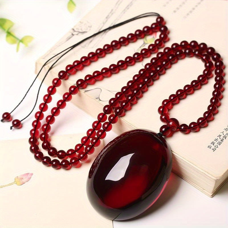 This necklace features a stunning blood red resin pendant on a sleek sweater chain. Perfect for holiday gifting or everyday wear.