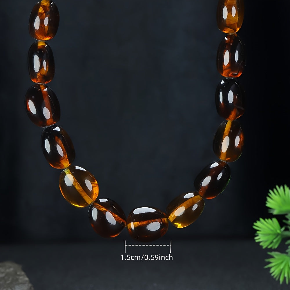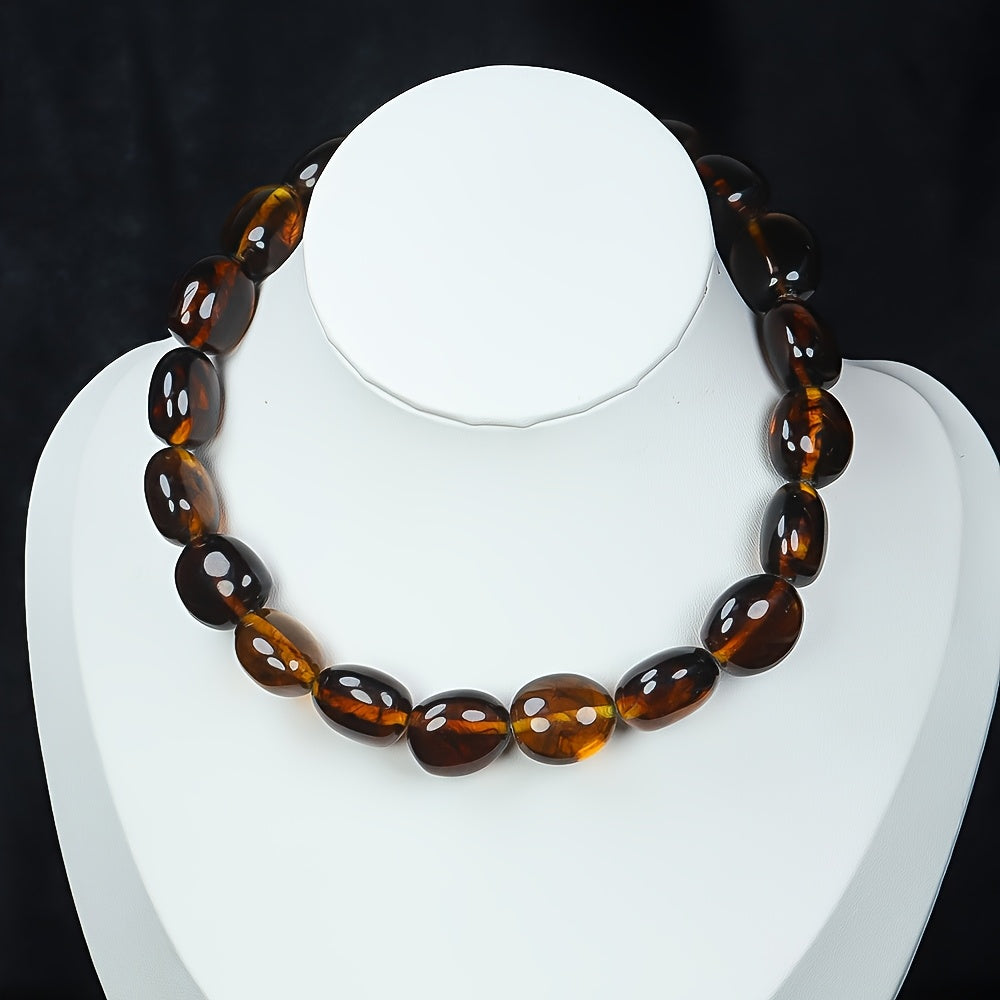 Elevate your casual attire with this bohemian amber beaded necklace featuring large round tubular beads and a delicate tree branch pendant. The combination of brown and amber beads adds a touch of earthy charm to your look.