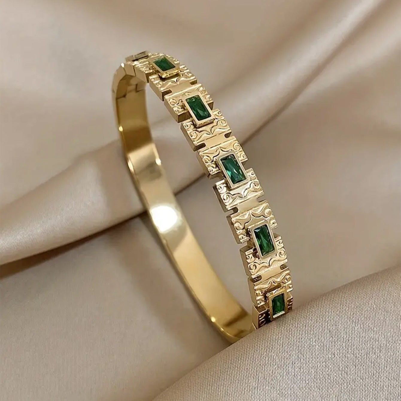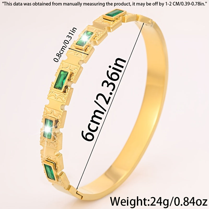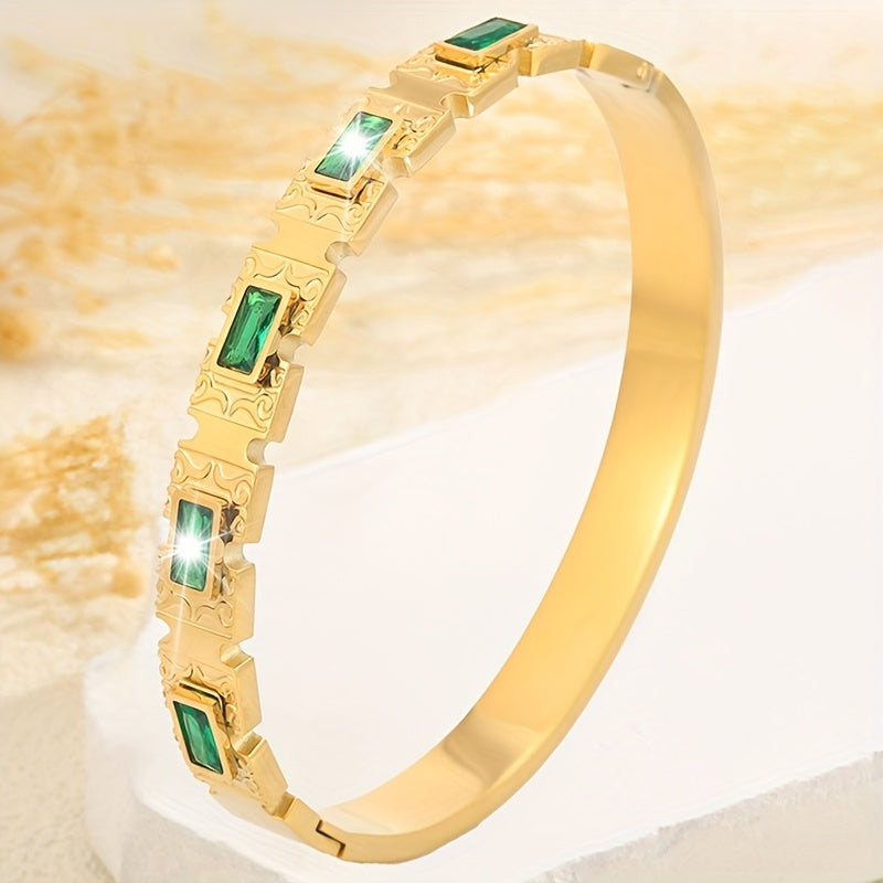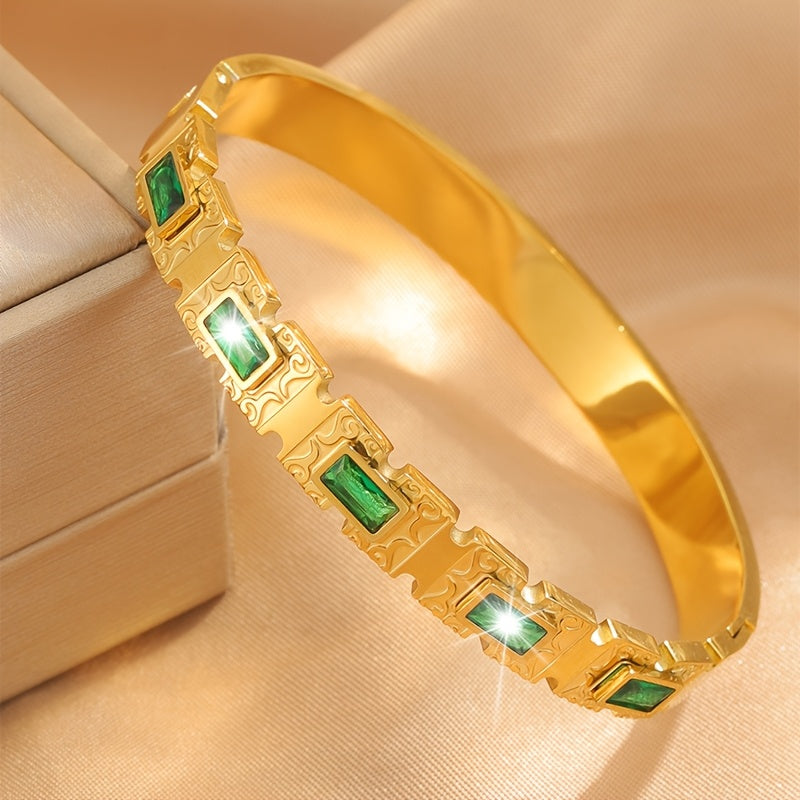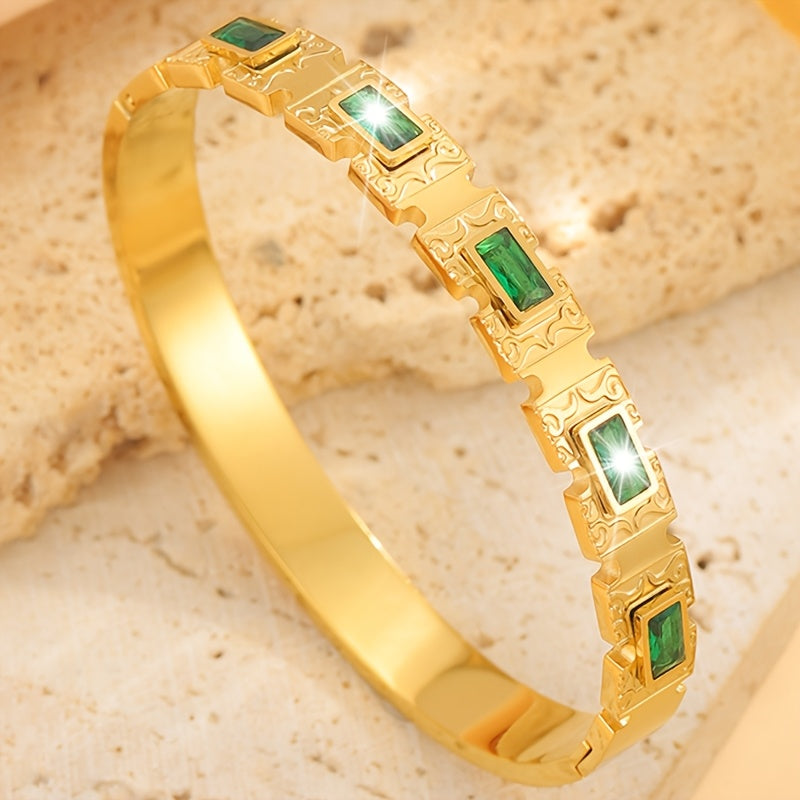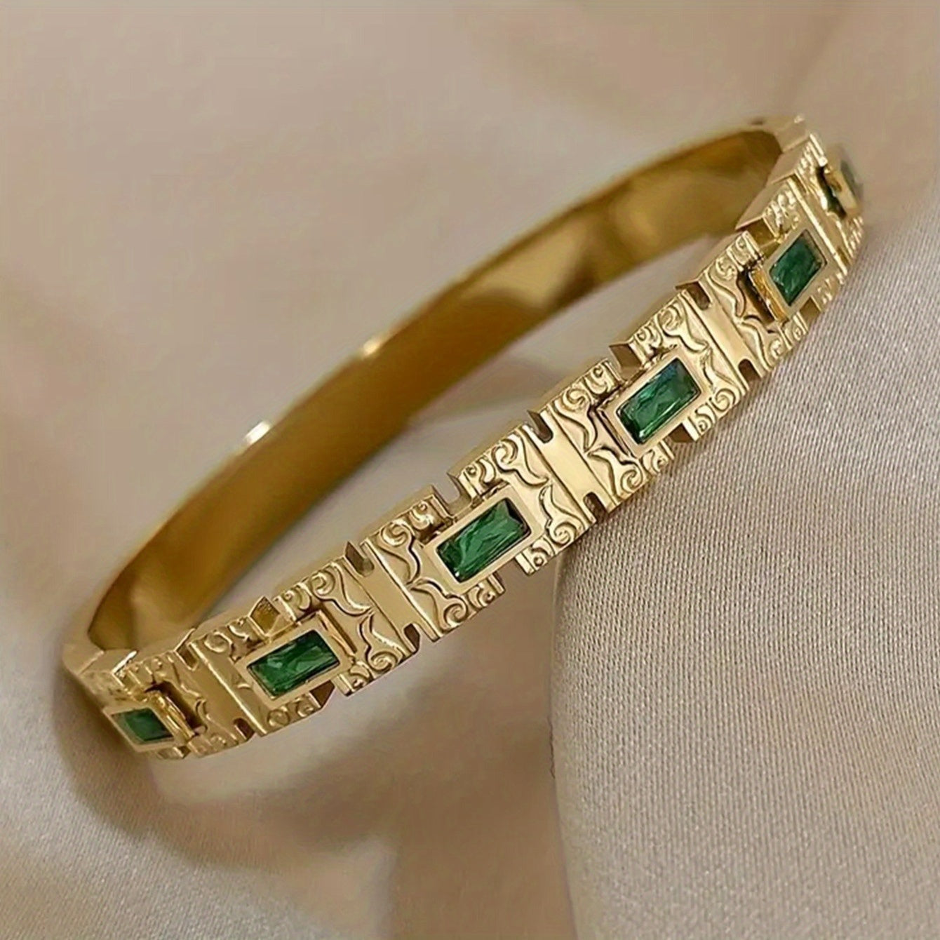 Stylish stainless steel bracelet featuring intricate carving and green synthetic gemstones. Durable and perfect for birthdays or anniversaries.