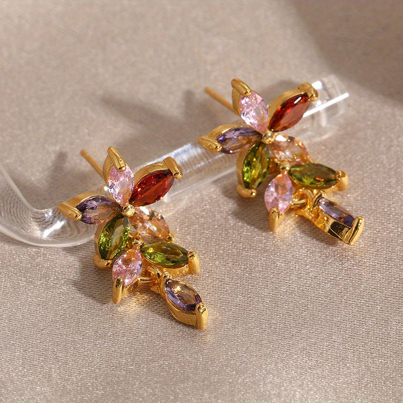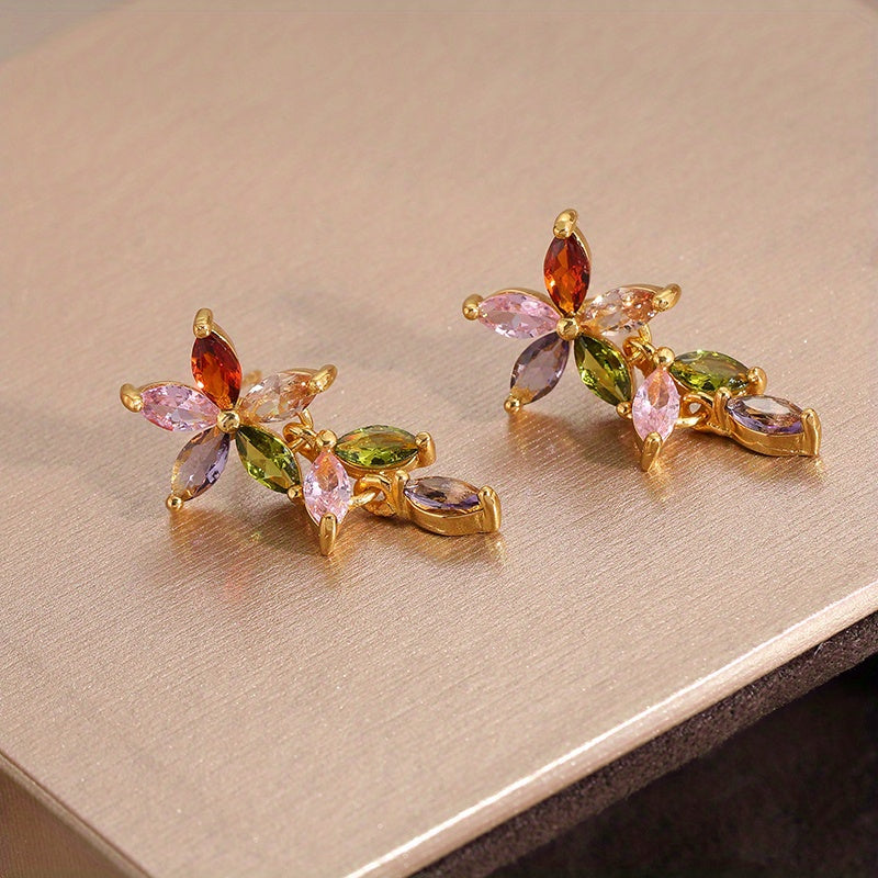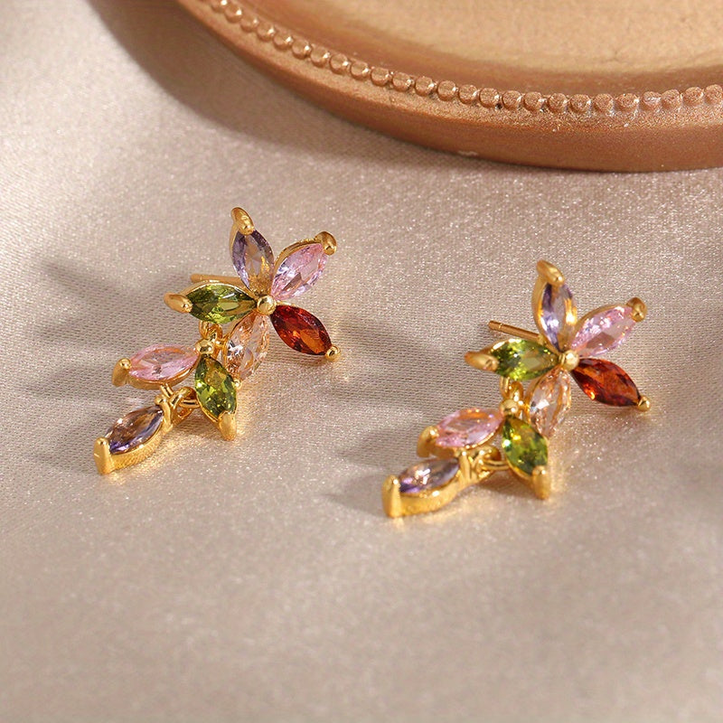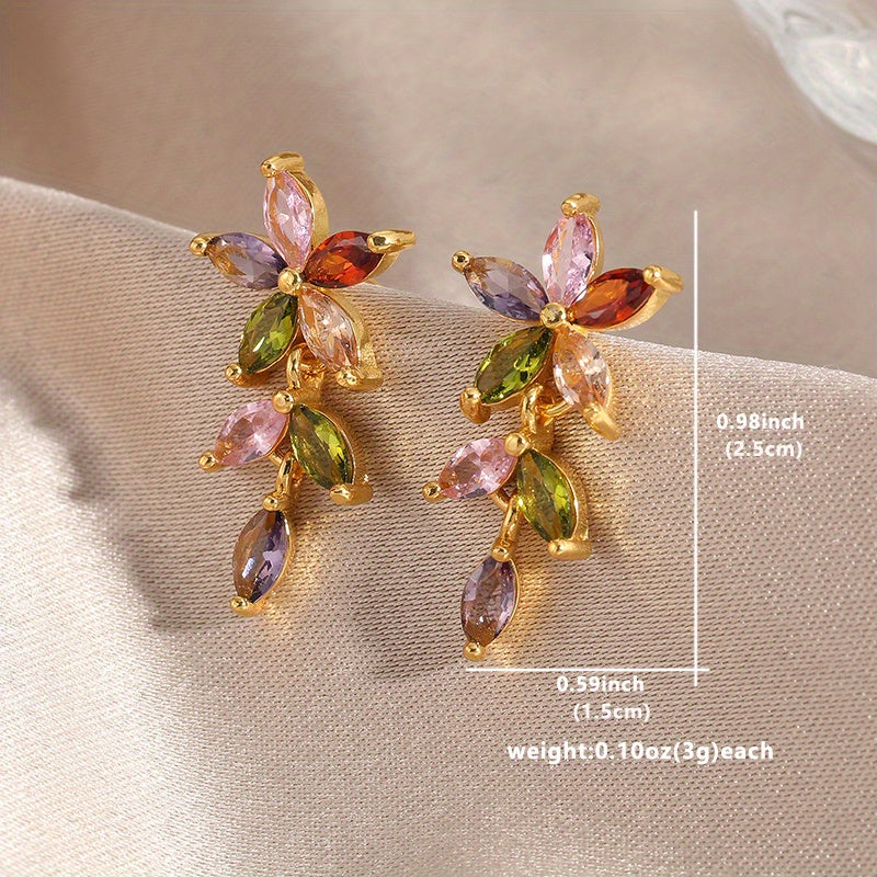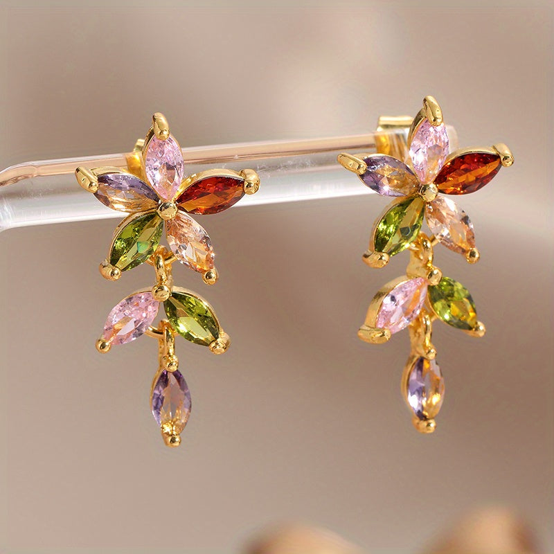 Vintage bohemian earrings with synthetic zirconia flower pendant, multicolor floral design. Ideal for Saint Patrick's Day and other holidays.