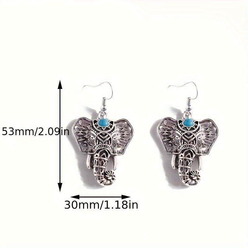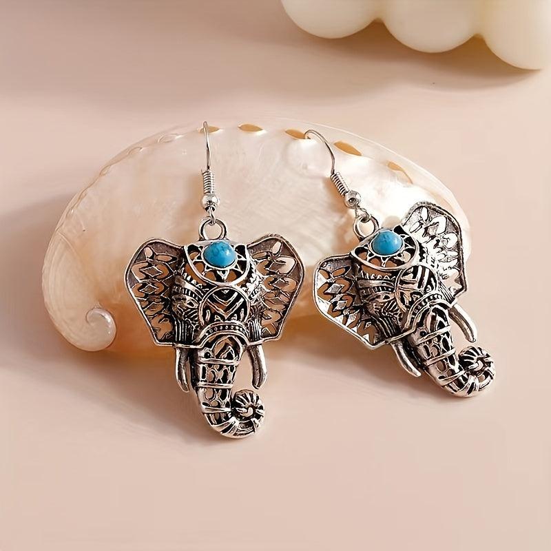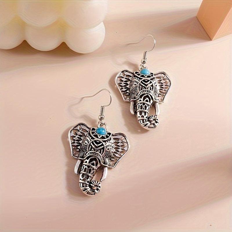 These unique earrings feature a retro ethnic design with an elephant motif and turquoise accents. Made of zinc alloy, they are a stylish addition to any outfit.